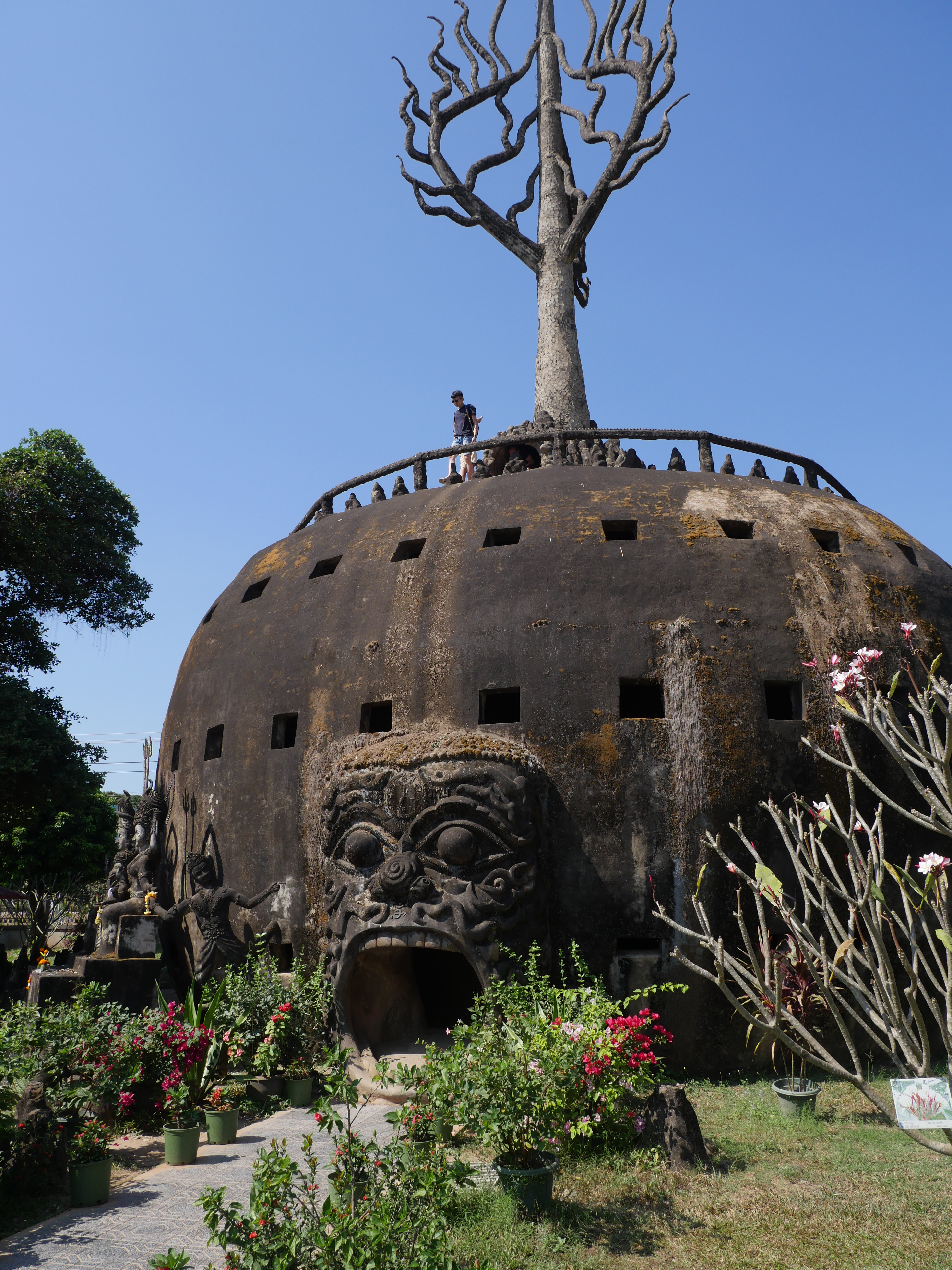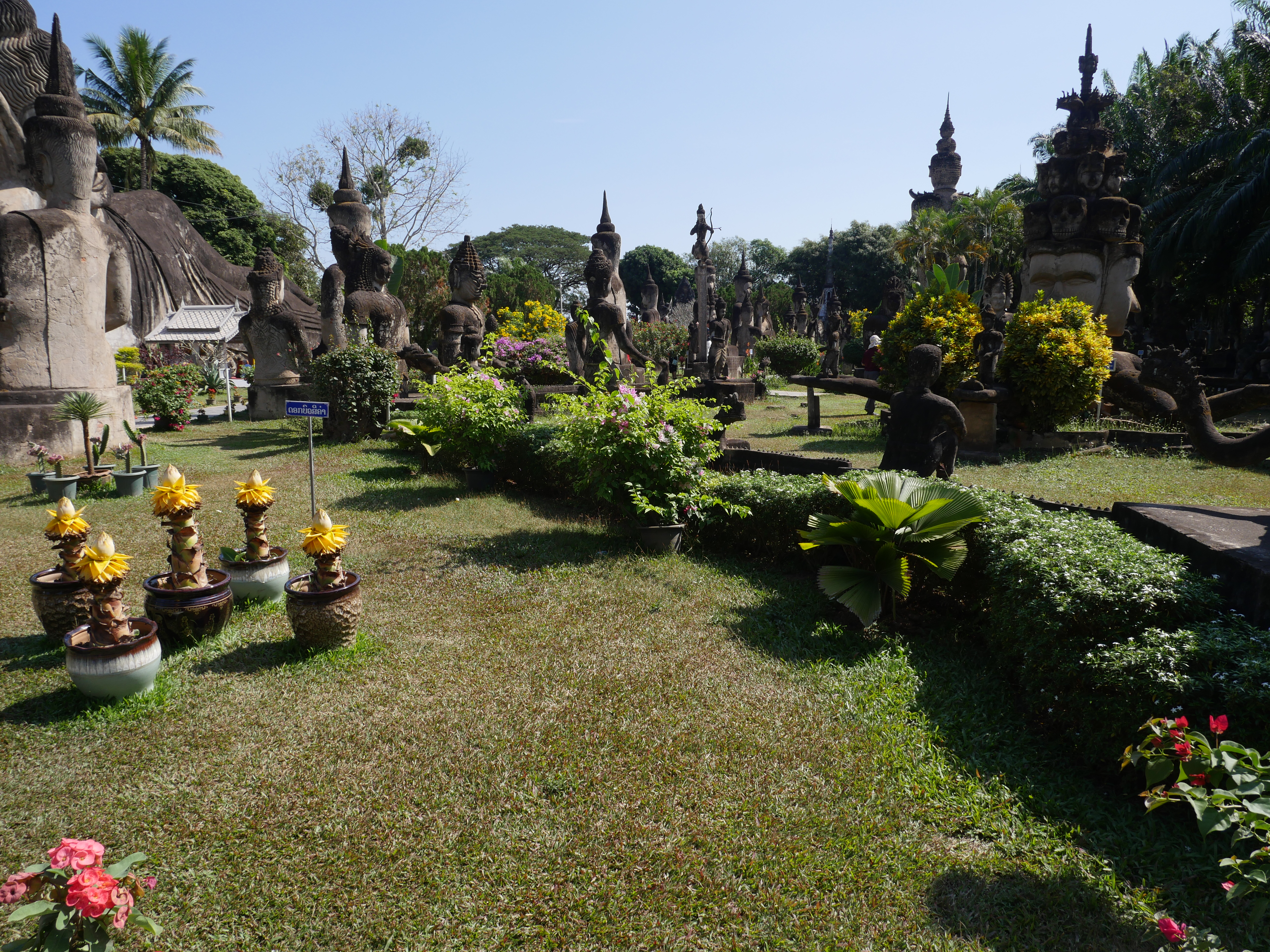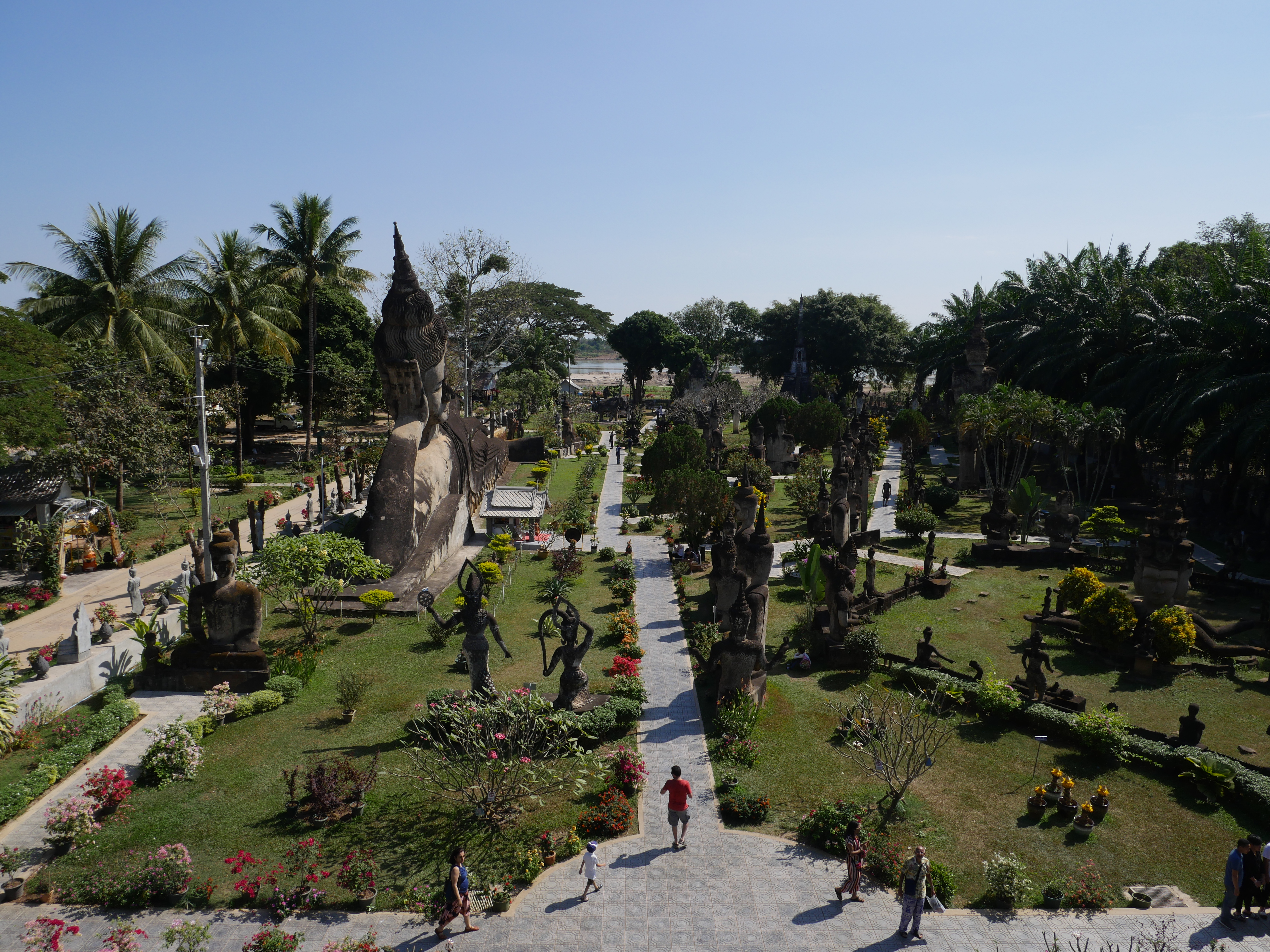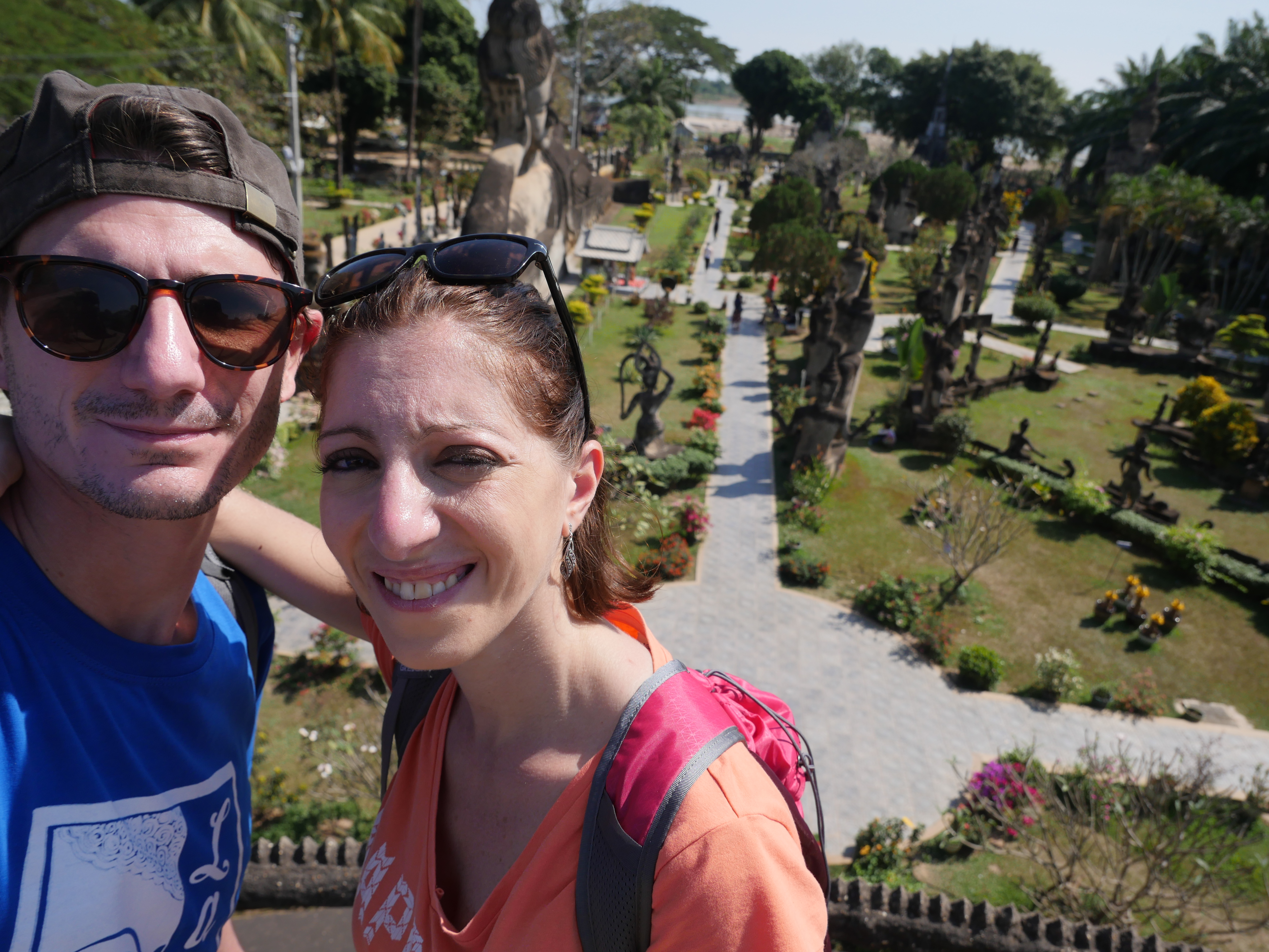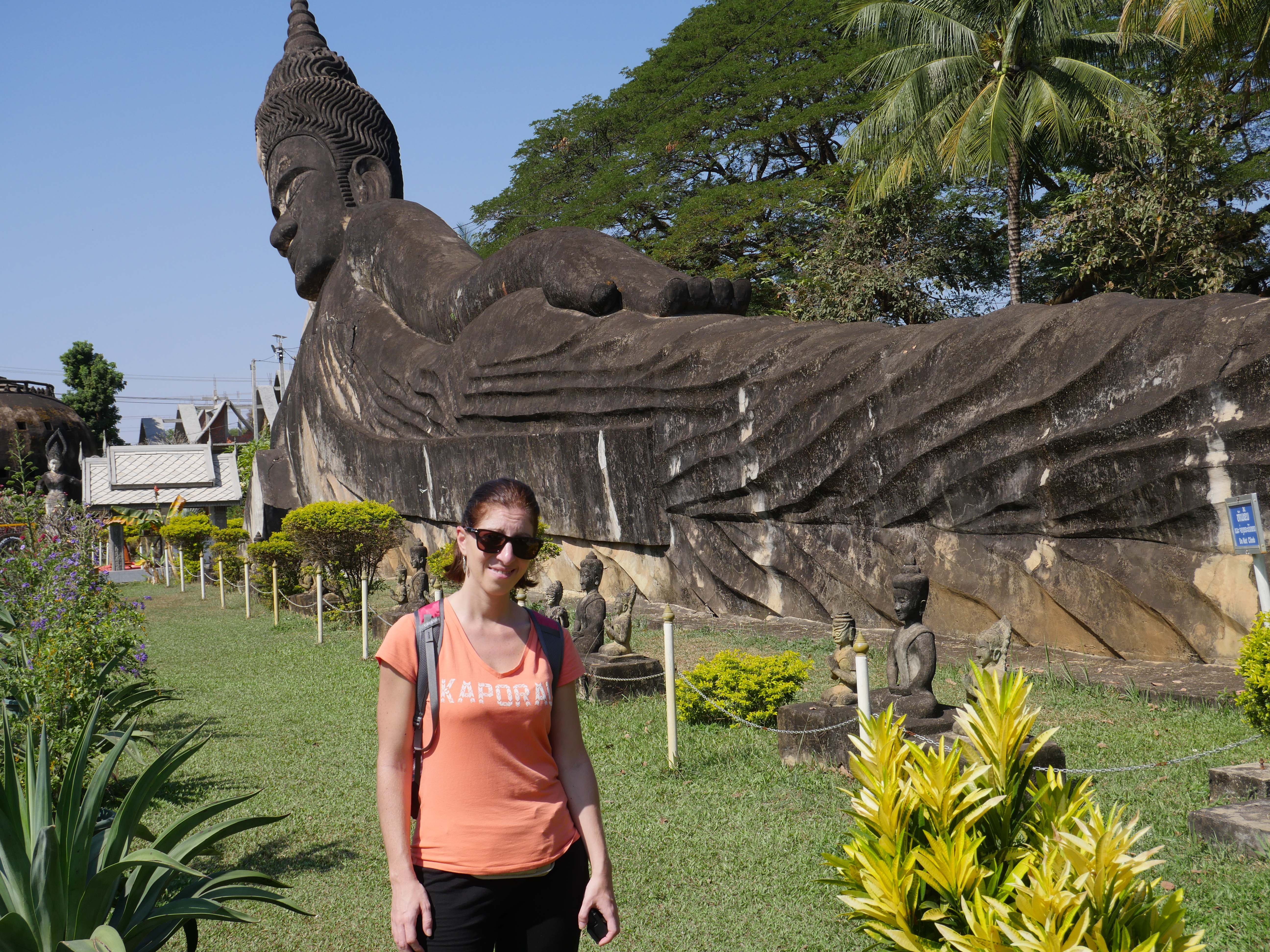 Bouddha Park, c’est l’attraction à voir dans les environs de Ventiane. Le parc n’est pas très grand mais très dense ! Forcément, il y a des bouddha partout 🙂 On a beaucoup aimé, c’est très reposant et très beau, surtout la vue en haut de l’immense dôme. Il y a également un énorme bouddha allongé. On y est resté environ 1h30, on a rencontré une famille avec qui on a pris notre première photo avec un Laotien, et on a profité, également, de l’instant présent pour se reposer un peu sur les bancs à l’ombre pour reprendre des forces.
