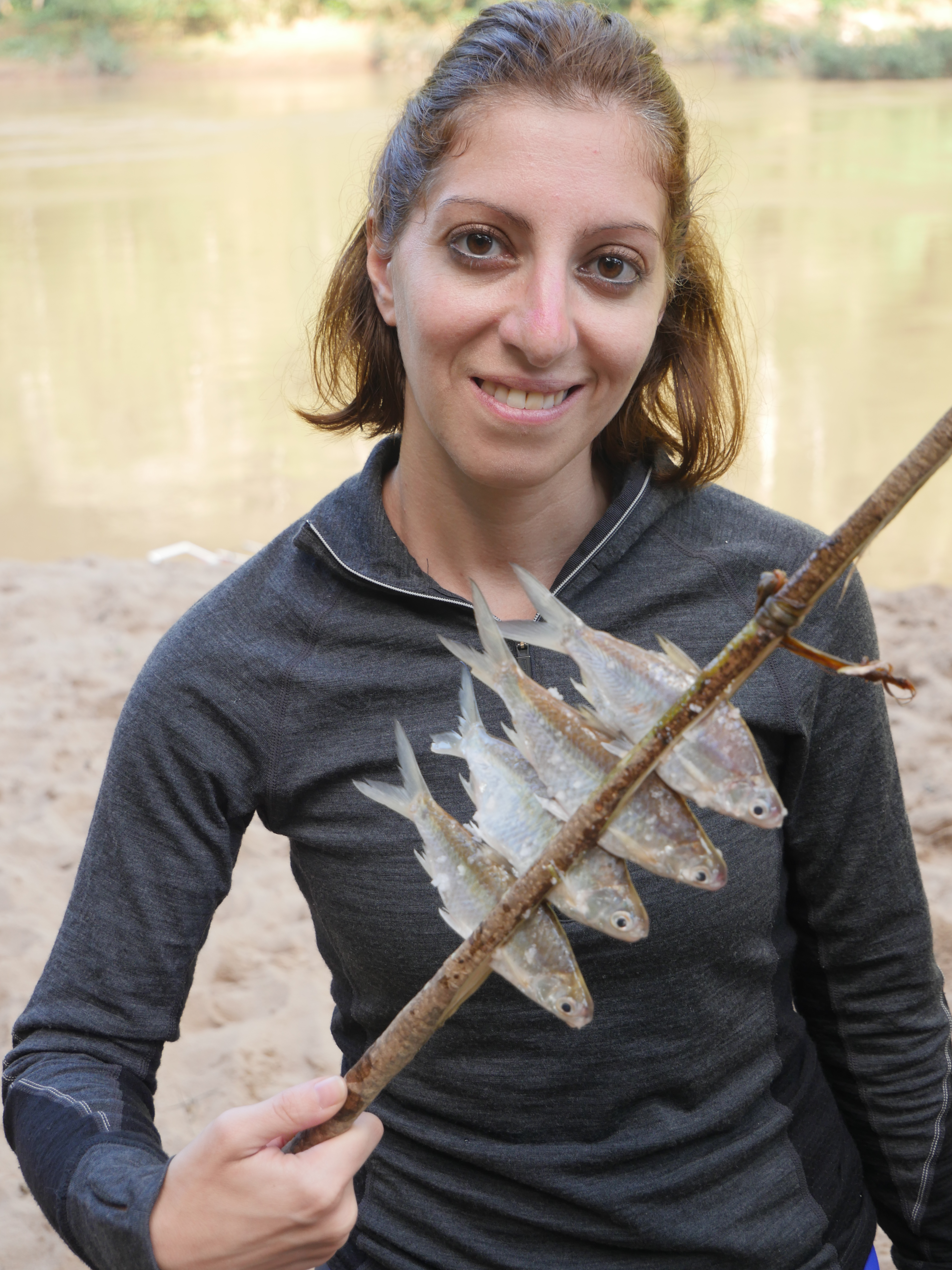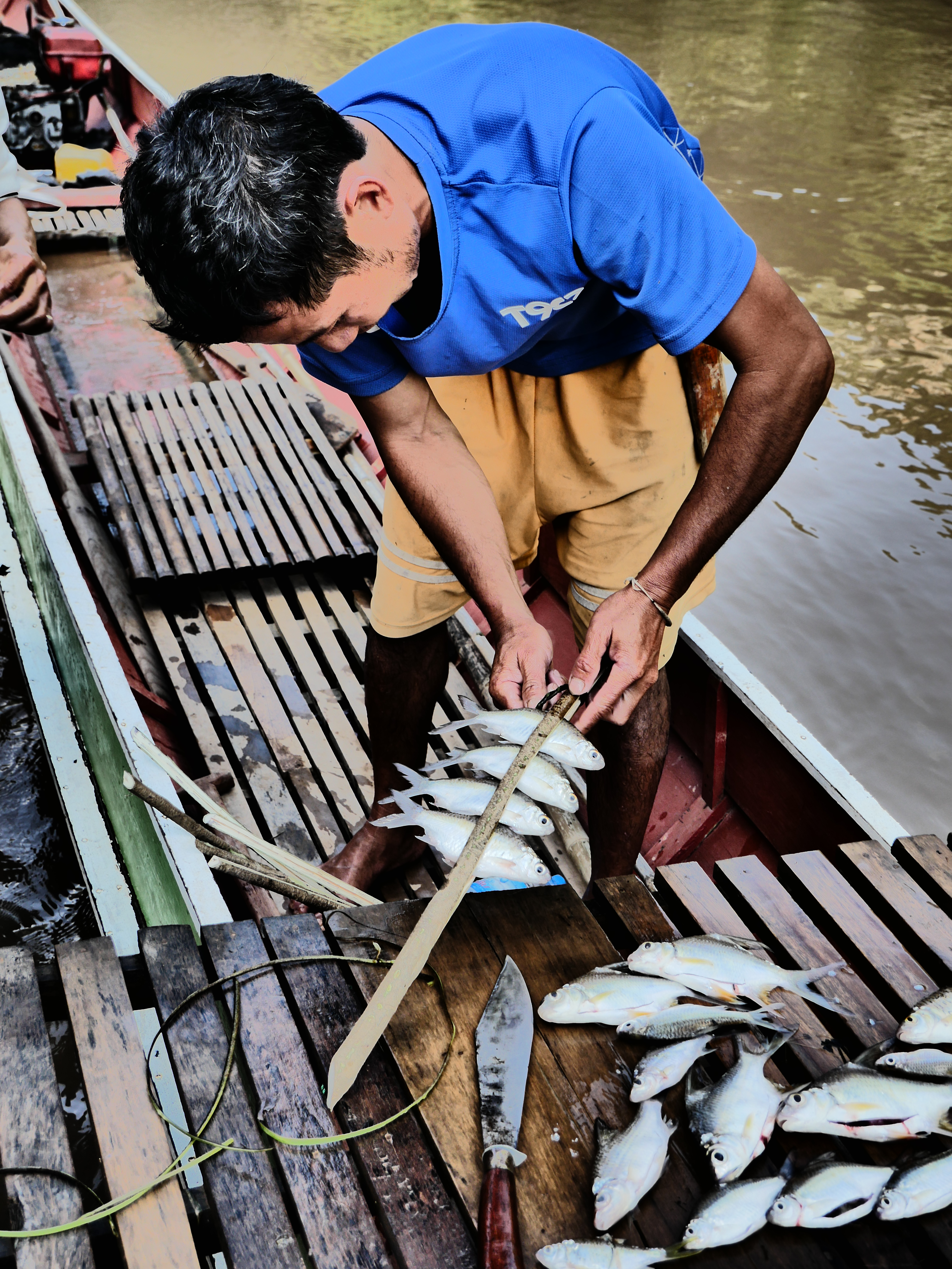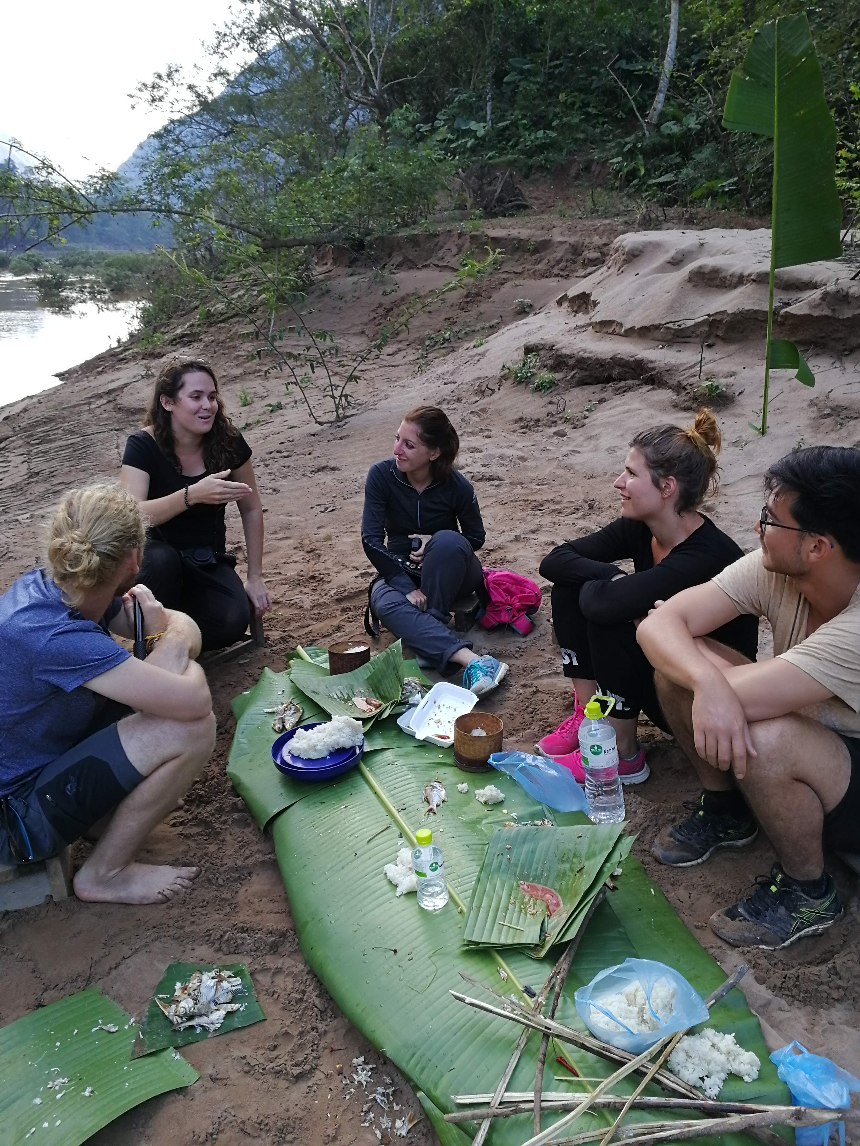 Escale ensuite dans un petit village touristique sans grand intérêt, avant de reprendre la pirogue et accoster sur une petite plage. Le guide fait le feu, va chercher une feuille de bananier qui servira de « table », tue le poisson et le vide. Il y avait également du « Sticky Rice » et des sardines. Ce fût un excellent repas ! Même si le poisson, avec la tête et toutes les arrêtes est vraiment très très très très très galère à manger.