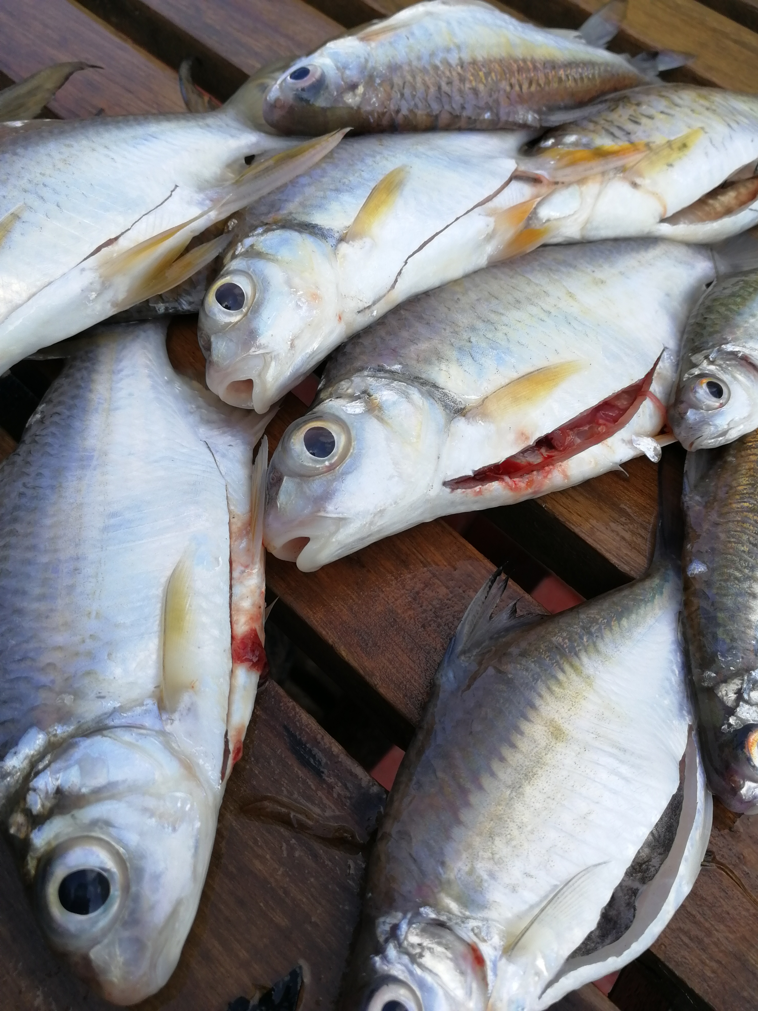 Initialement c’était à 120 000 kips par personne mais on l’a fait descendre à 80 000 vu qu’on est six. Départ 11h30, dans une sorte de pirogue (pour 6 ou 7 personnes), avec un chauffeur et un pêcheur. 25min plus tard, on se rapproche du bord. Là, le bateau fait un arc de cercle et le pêcheur laisse tomber un filet, attaché à une grosse pierre, au fond de l’eau. Une fois terminé, la pêche commence ! Avec un grand bâton de bambou, on tape violemment l’eau. Ca permet de faire peur aux poissons et de les envoyer dans les filets. C’est assez dur à faire. Après 5min, on remonte le filet pour voir le résultat… Et bah on a réussi à avoir 6 poissons, pas très gros certes mais tout de même ! On répétera l’opération deux autres fois dans d’autres endroits, pour au final avoir une dizaine de poissons à manger !