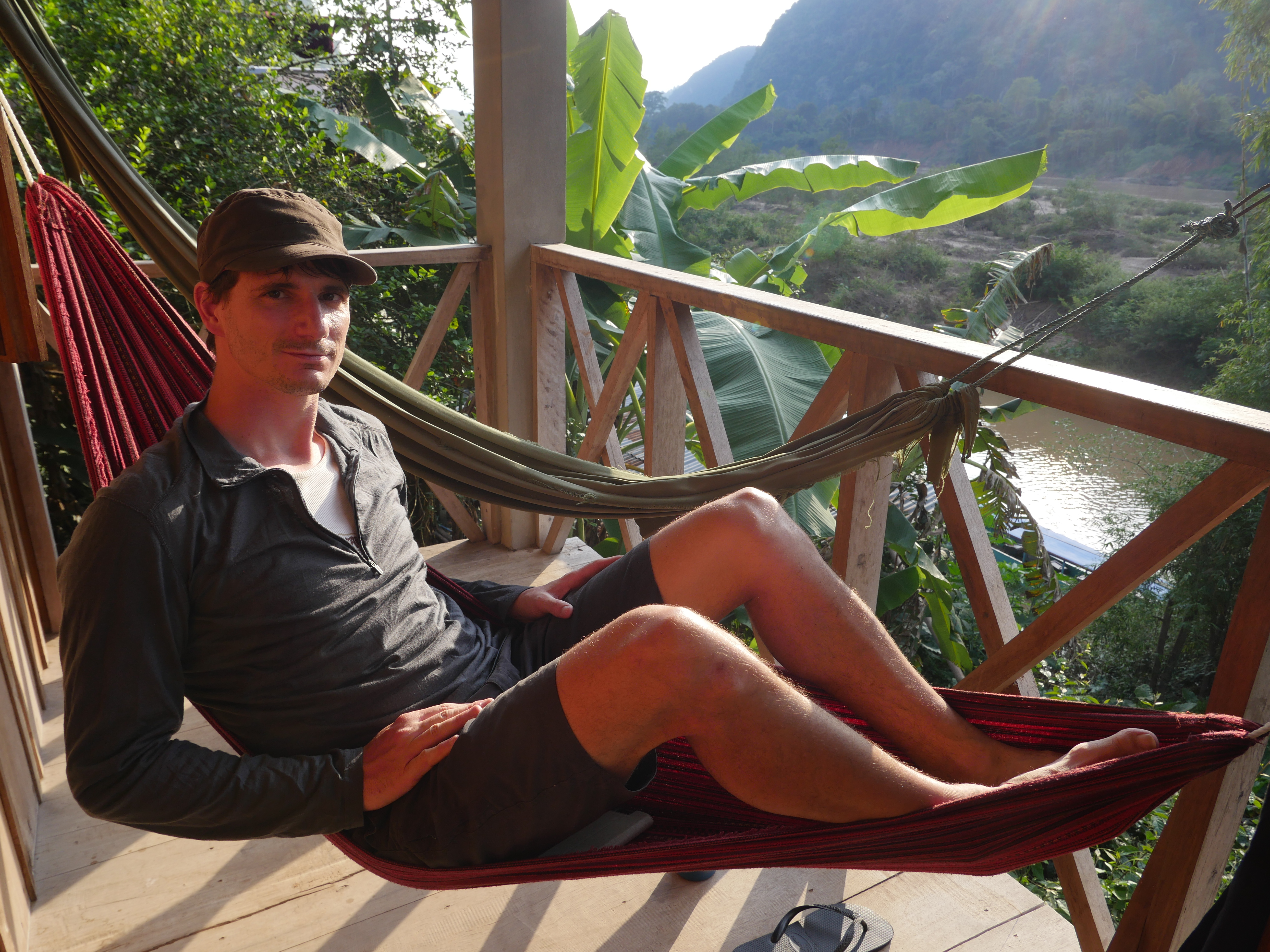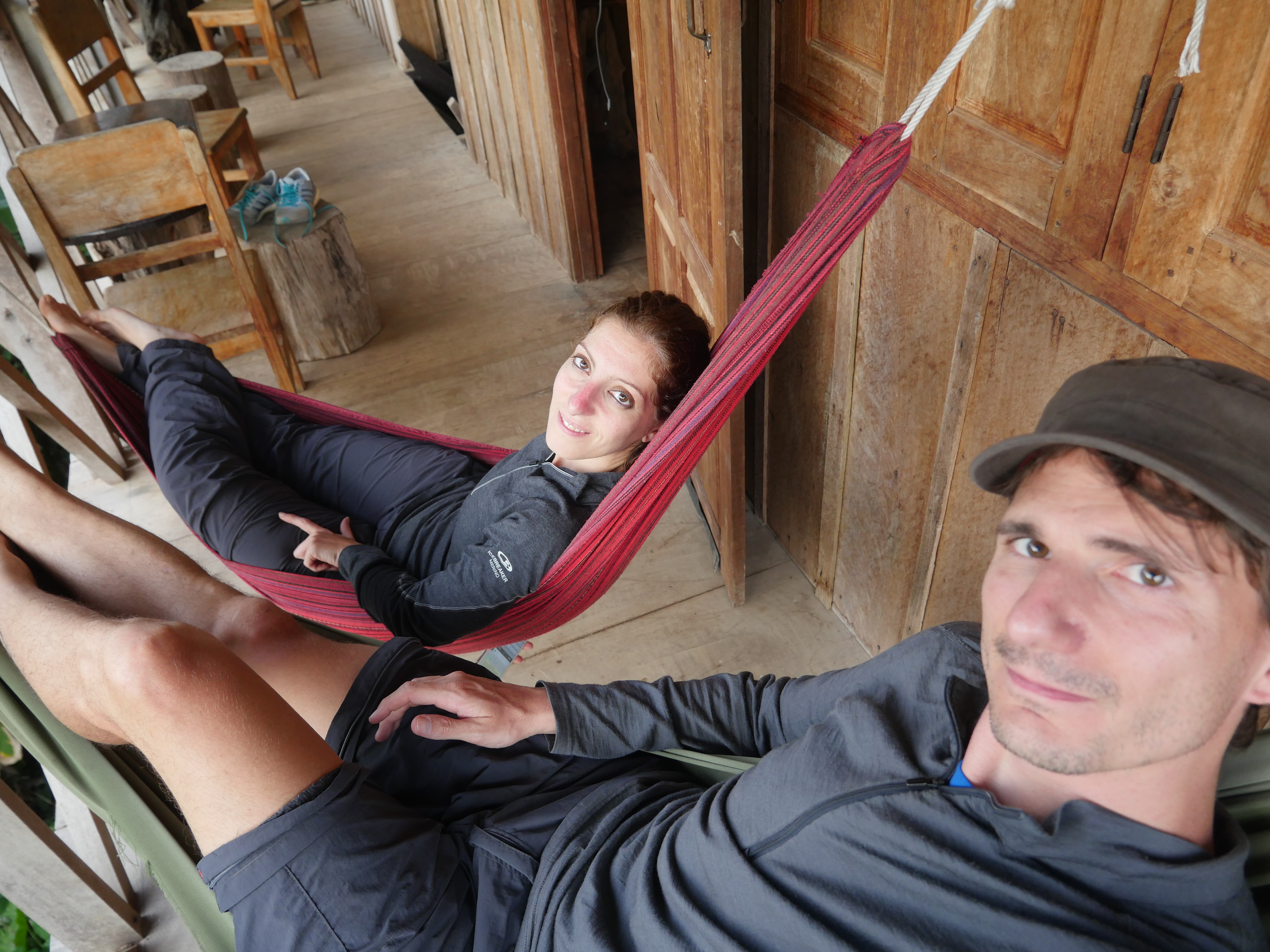 On avait rien réservé, donc on a directement cherché, tout les quatre, un logement. A Muang Noi ce n’est pas ça qui manque ! Il y a des guesthouses tout le long de la rue principale. On a trouvé refuge chez Nicka’s Guesthouse, qui propose des bungalow avec hamacs, très sympa avec vue sur la rivière et le couché du soleil 🙂