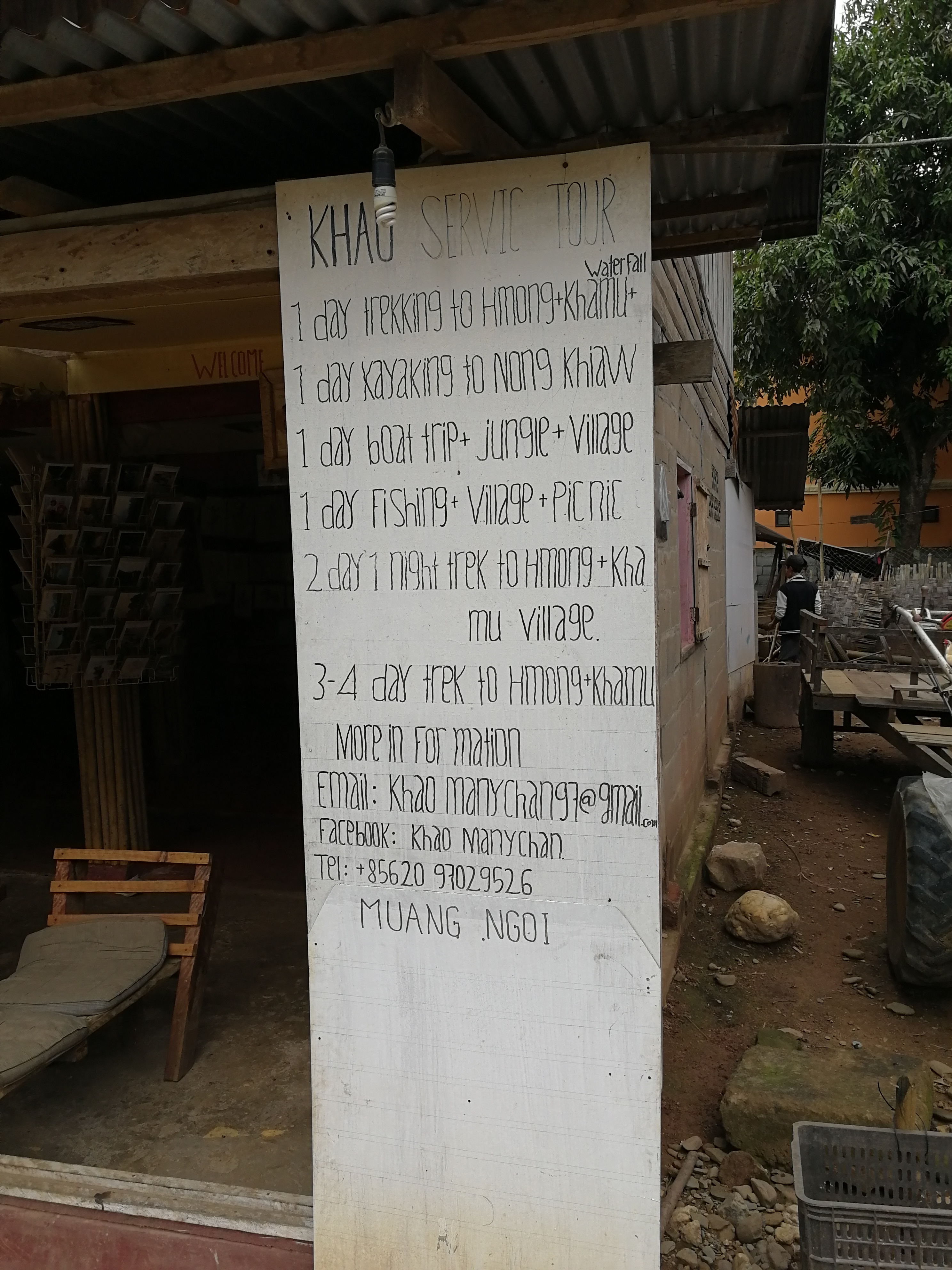 - Nong Khiaw, Pho Sai Guesthouse : négocié à 70 000 kips grande chambre mais petite salle de bain et pas pratique l’eau du lavabo se déverse dans la salle de bain. Terrasse avec un hamac et la vue sur le Nam Ou. Pour une nuit c’est suffisant.