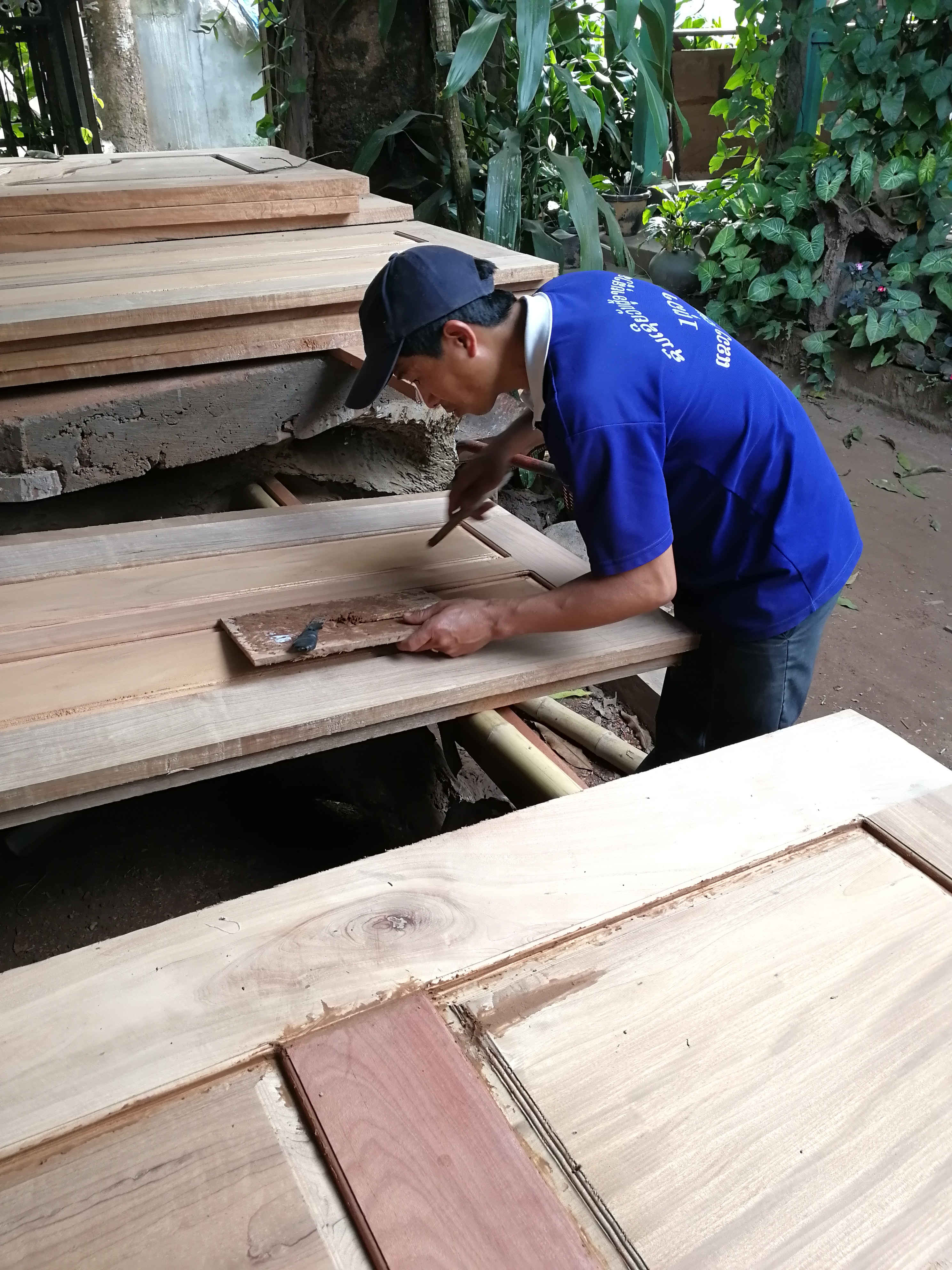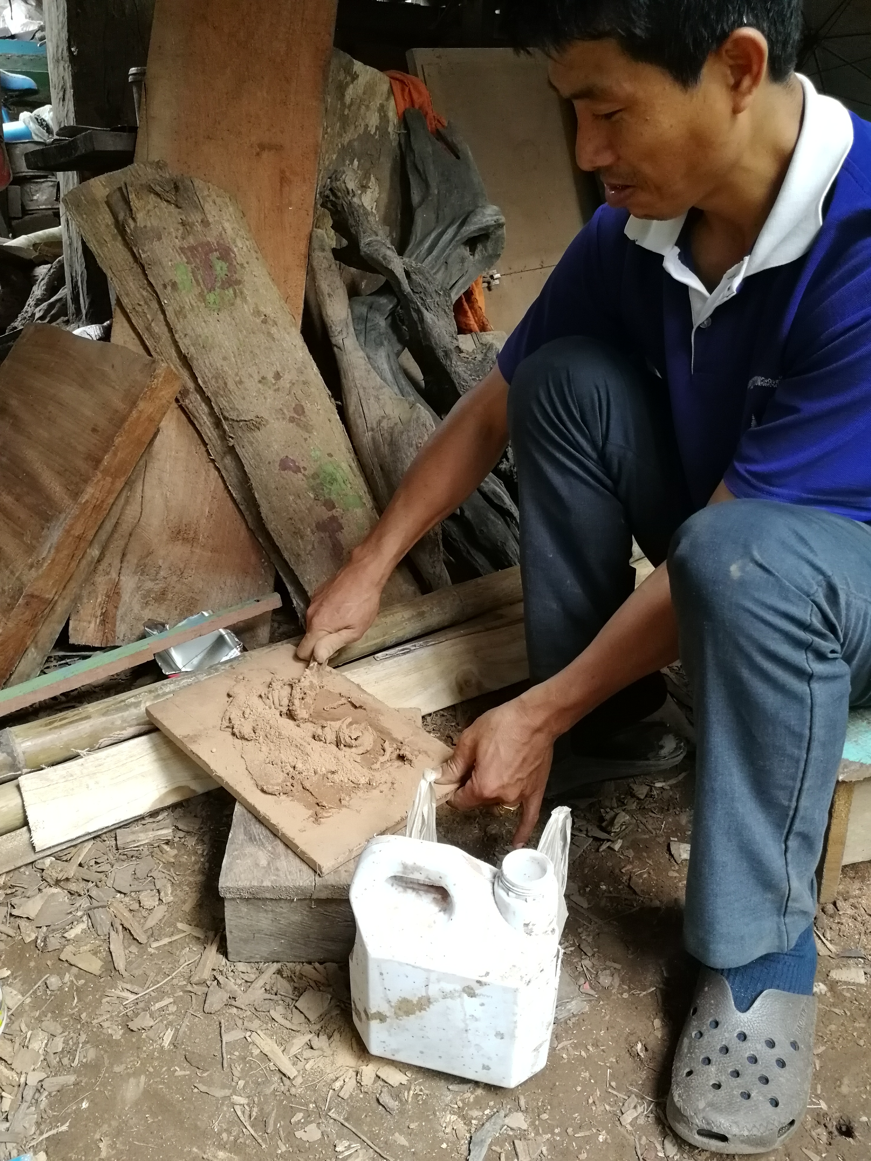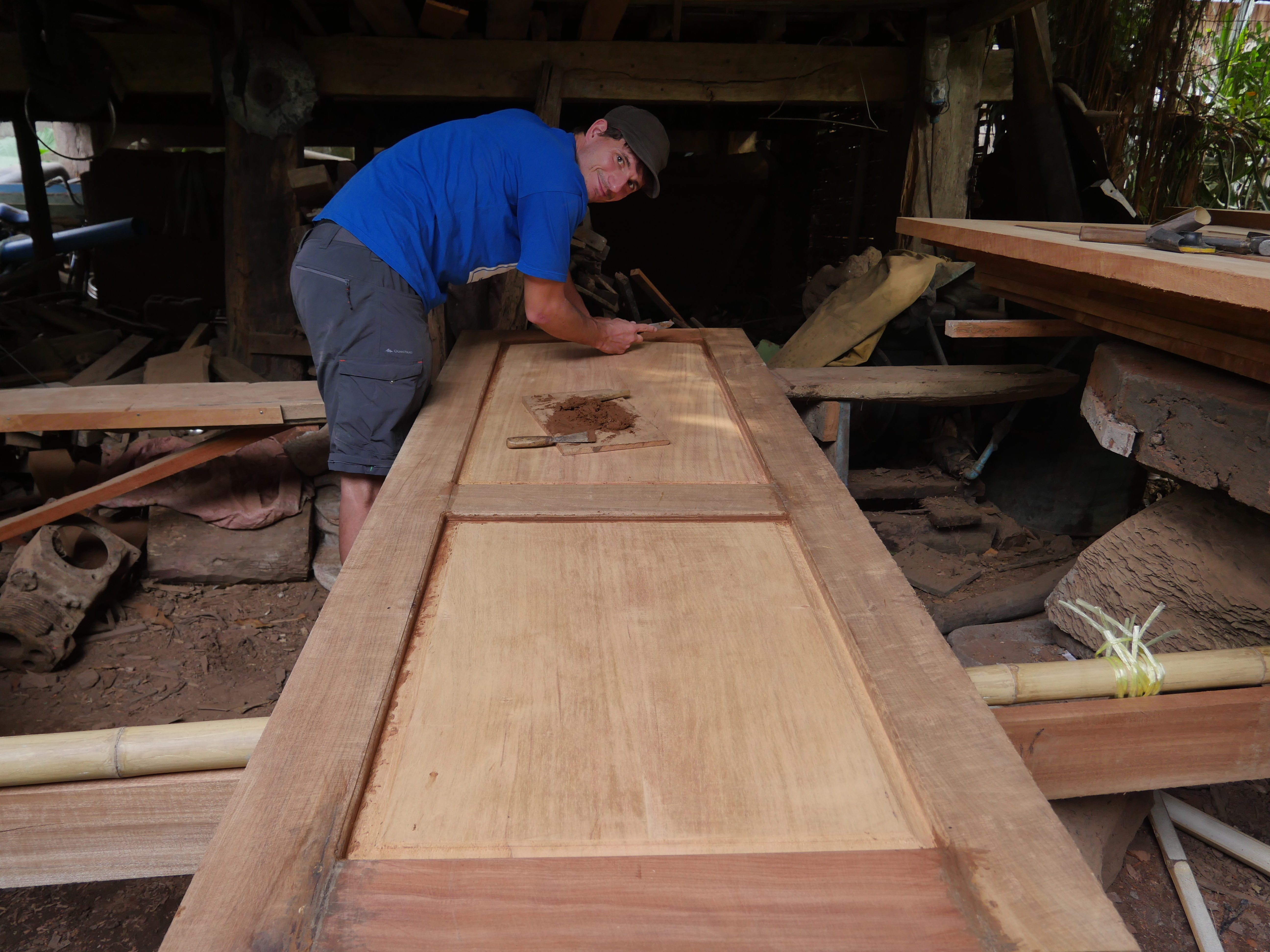 Pendant que les autres se reposent et papotent l’après-midi, de mon côté, j’aide « Khan« , le gérant de notre guesthouse, à refaire le joint des portes en bois. Il y a pleins de petits trous qu’il faut colmater, avec une sorte de glue mélangée à de la poudre. C’est vraiment très enrichissant et un vrai moment de partage ! Il m’apporte même à manger et à boire 🙂