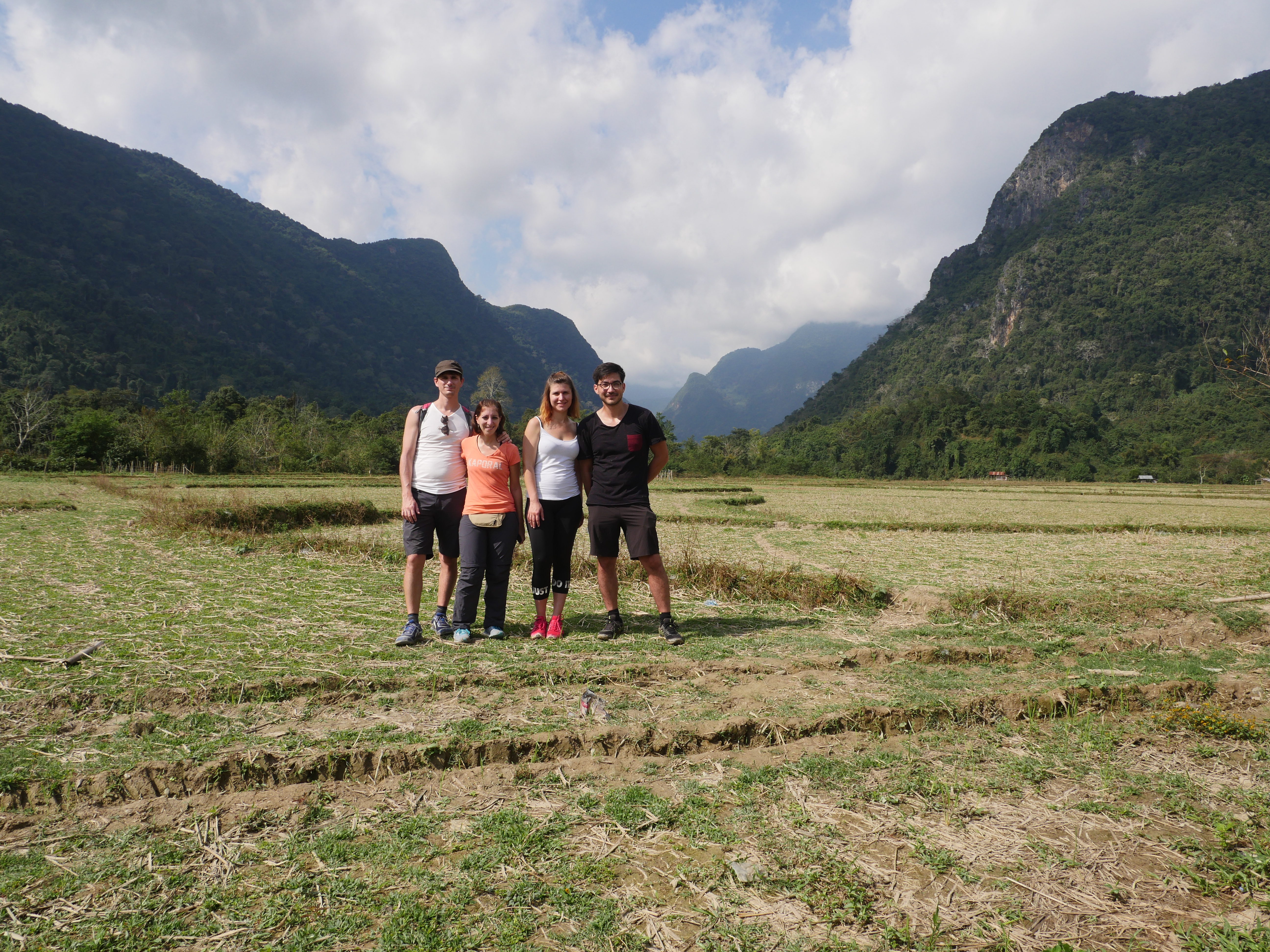 Après ce festin, on est parti, tout les quatre, se balader dans les environs pour aller voir les villages à proximité. Sur le chemin, il faut d’abord passer une sorte de « droit d’entrée » (10 000 kips), qui permet aussi d’aller voir la grotte juste à côté. Elle n’est pas très grande mais il y a pleins de poissons à l’intérieur. Sympa mais sans plus.