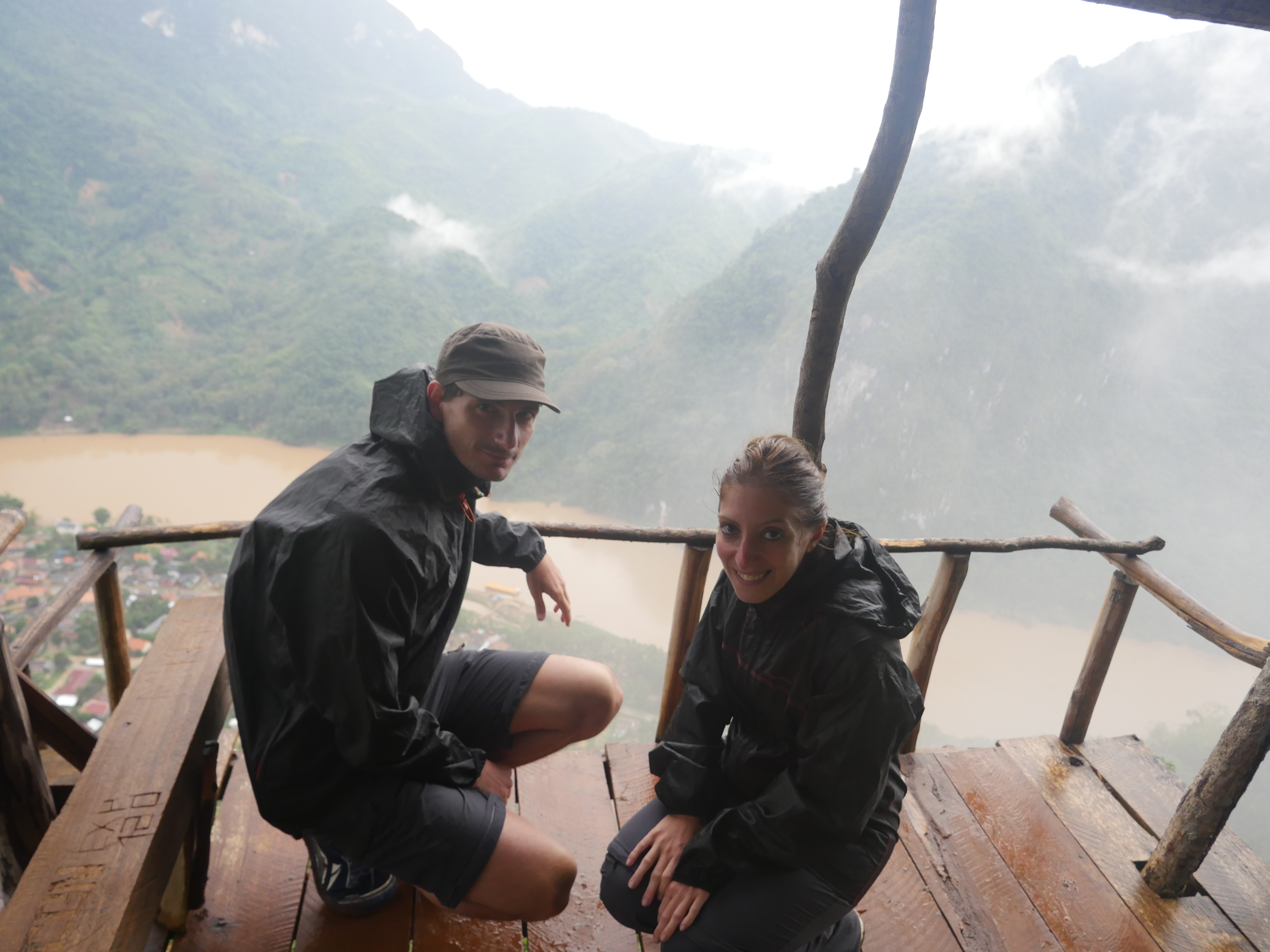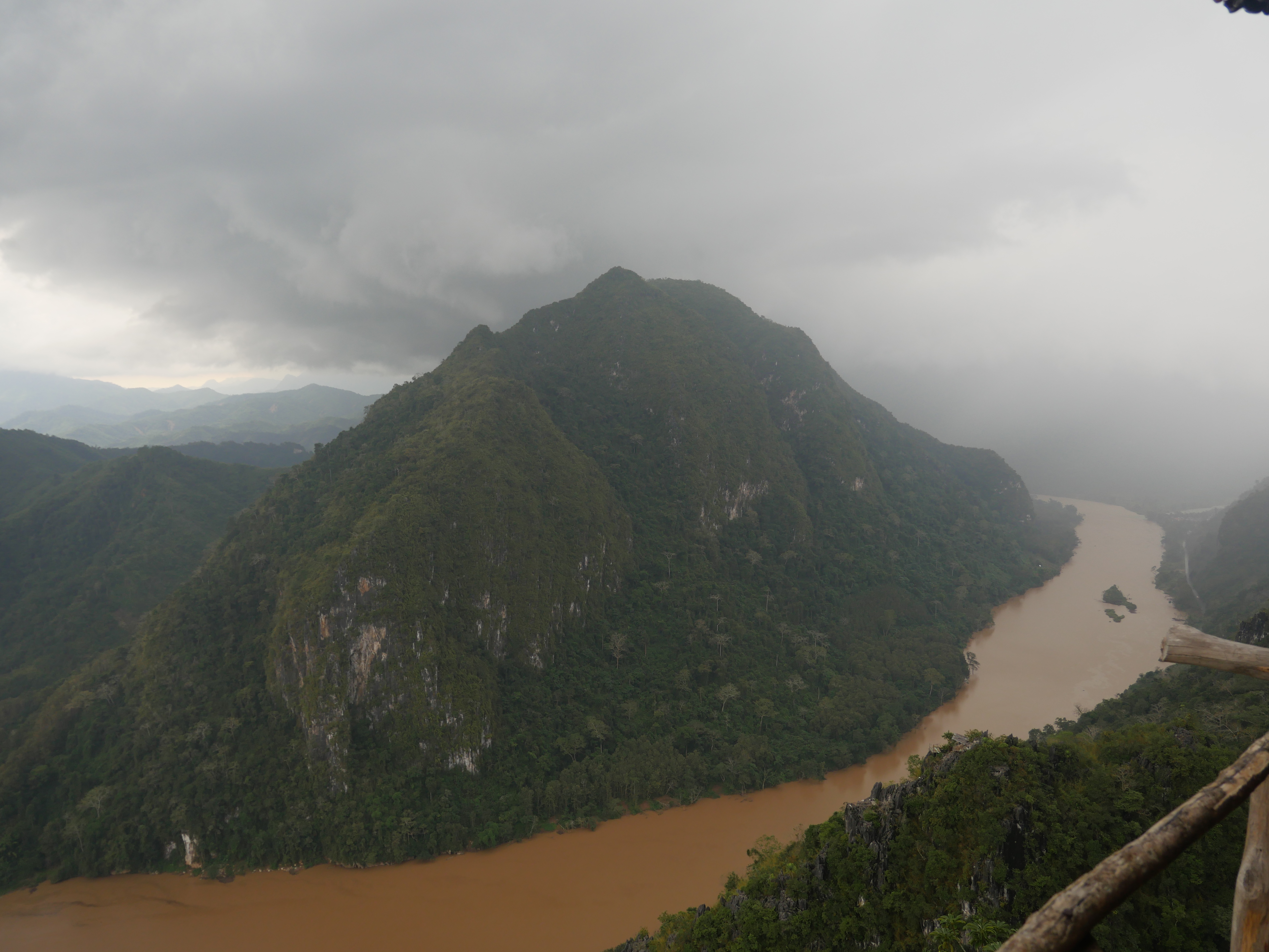 Après une ascension sans fin, on y arrive enfin ! La vue est vraiment belle, avec le Nam Ou en contre bas. Par contre, pas de chance, on voit un énorme nuage noir qui arrive sur nous à pleine vitesse. On ne prend pas de risque et on reste en haut, dans la petite cabane ouverte, le temps que ça passe. C’est une grosse tempête !