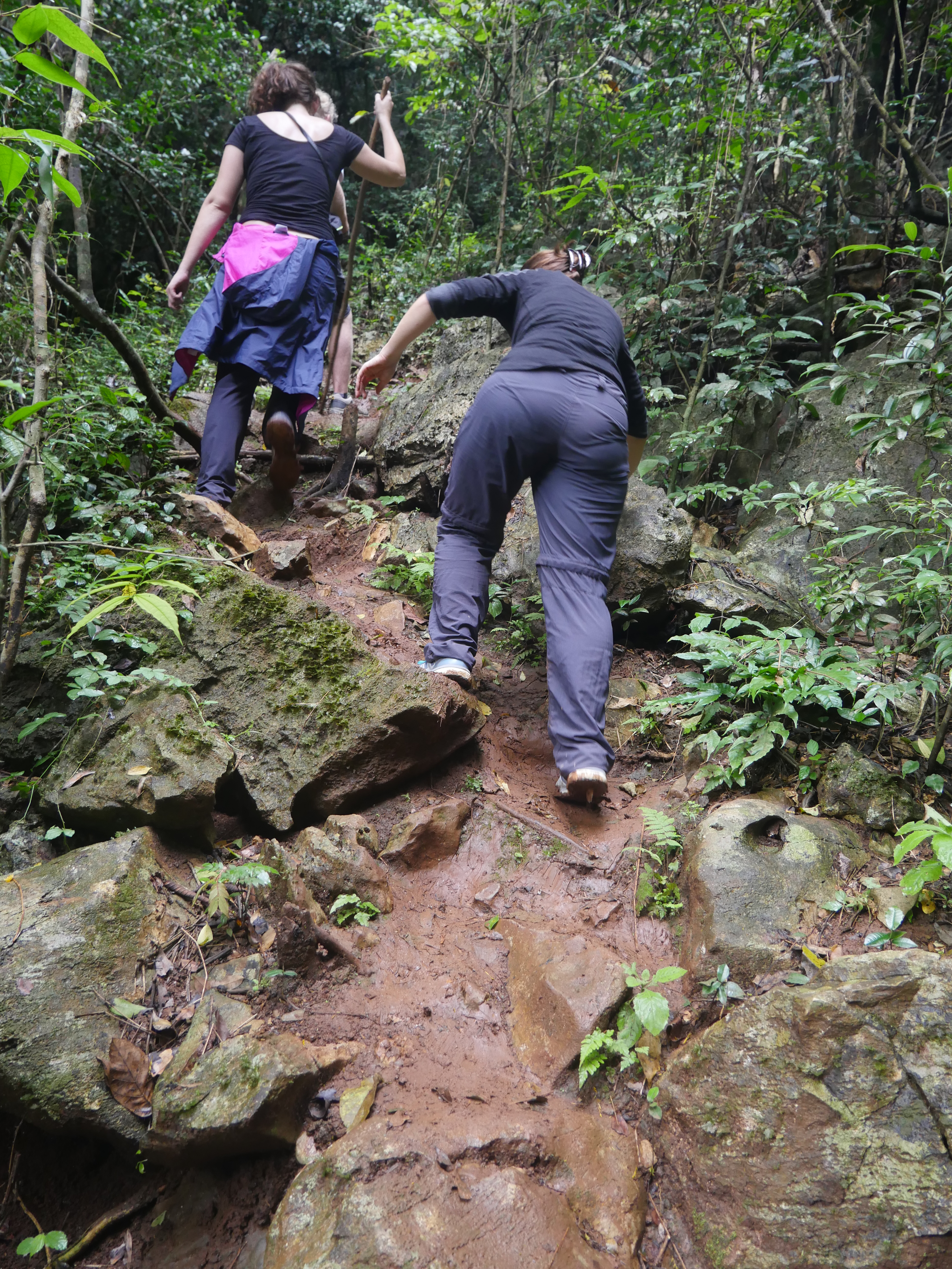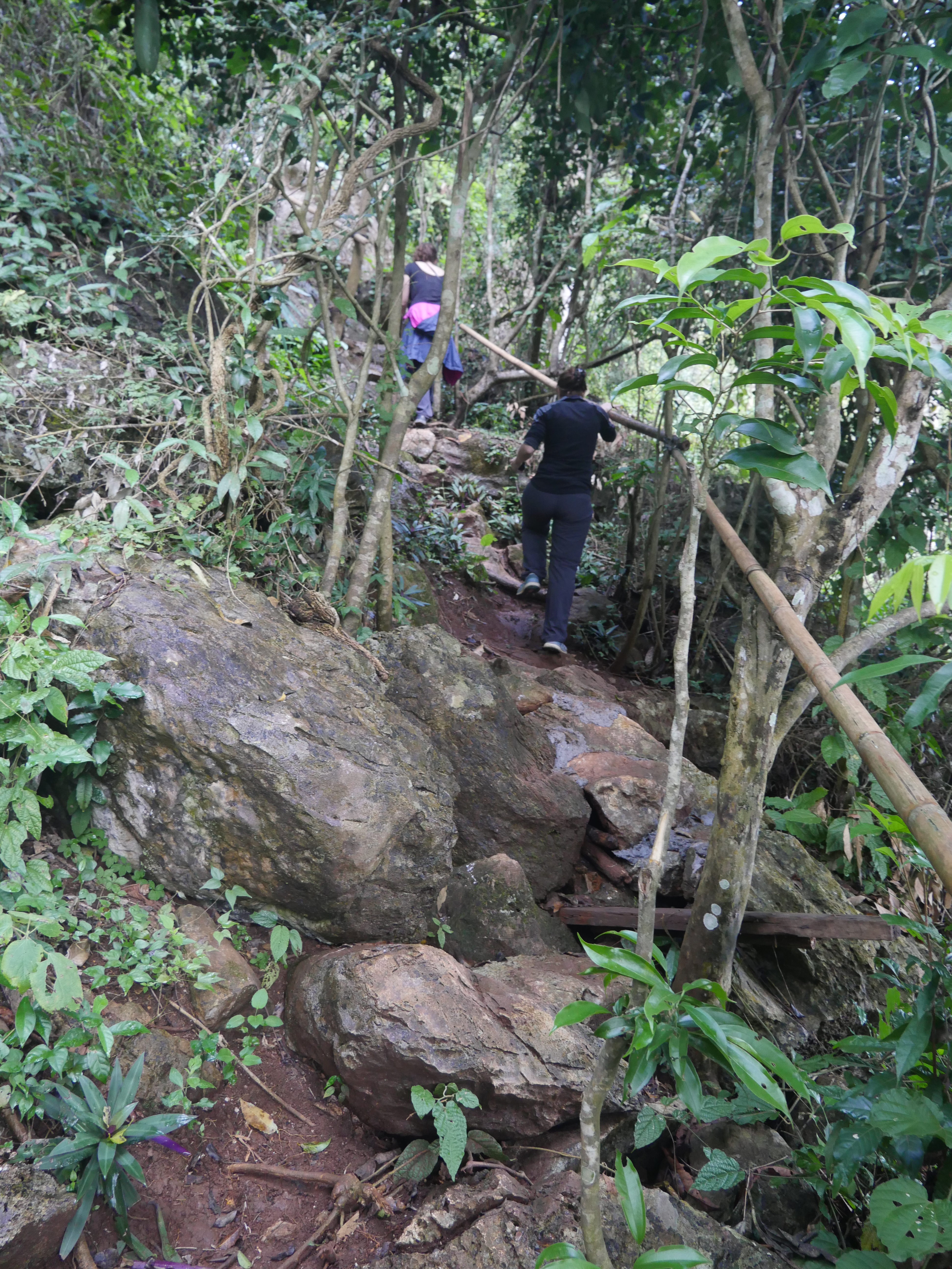Cet après-midi, on va se rendre au point de vue qui domine la vallée. Alors autant le dire tout de suite : ça grimpe fort dans la forêt pendant 1h30 ! Il faut parfois s’accrocher à des tiges en bambou, des rembardes ou autres pour pouvoir monter. Des fois, il y a des bâtons au départ du point de vue, là c’est Agathe qui les a pris.