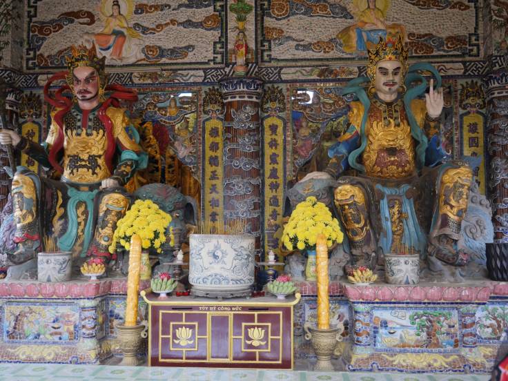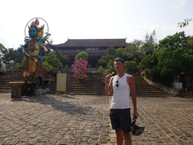 On commence immédiatement notre visite de la ville et plus particulièrement du temple de Chua Linh Son. Bien qu’elle soit bien visible, on a eu un peu de mal à trouver l’entrée. Sûrement encore un peu sonné du long trajet en bus :-).