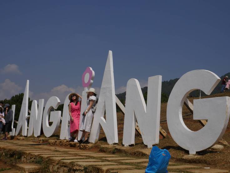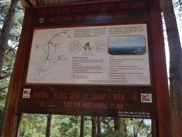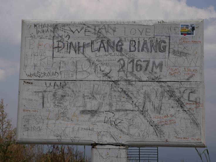 On prend la direction de Lang Biang à environ 12km au nord de Dalat. Malgré l’heure plutôt matinale, environ 9h, il y a déjà pas mal de monde sur le site. Bien sûr, impossible de prendre une photo du panneau sans touriste. Il ne faut pas rêver….
