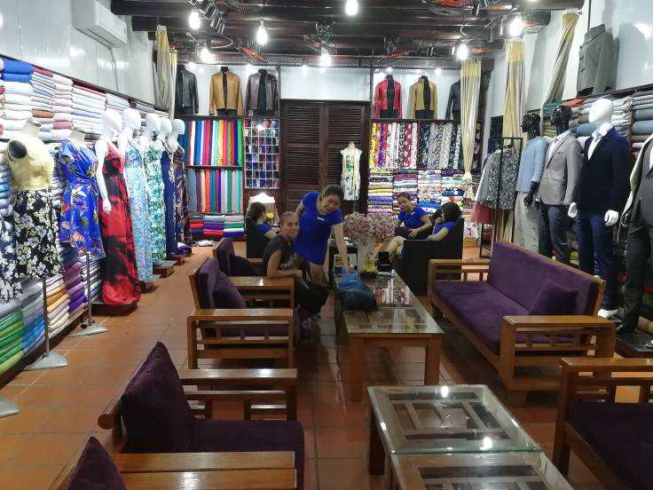 Pour finir cette journée, on se rendra chez le tailleur « Blue Eye« , qui se situe dans la vieille ville. On a choisi cette boutique un peu au hasard, tellement il y en a dans les alentours. Hoi An est réputée pour ces nombreux tailleurs. Après avoir choisi le tissu et la couleur, j’ai parcouru Internet pour montrer la coupe que je souhaitait.