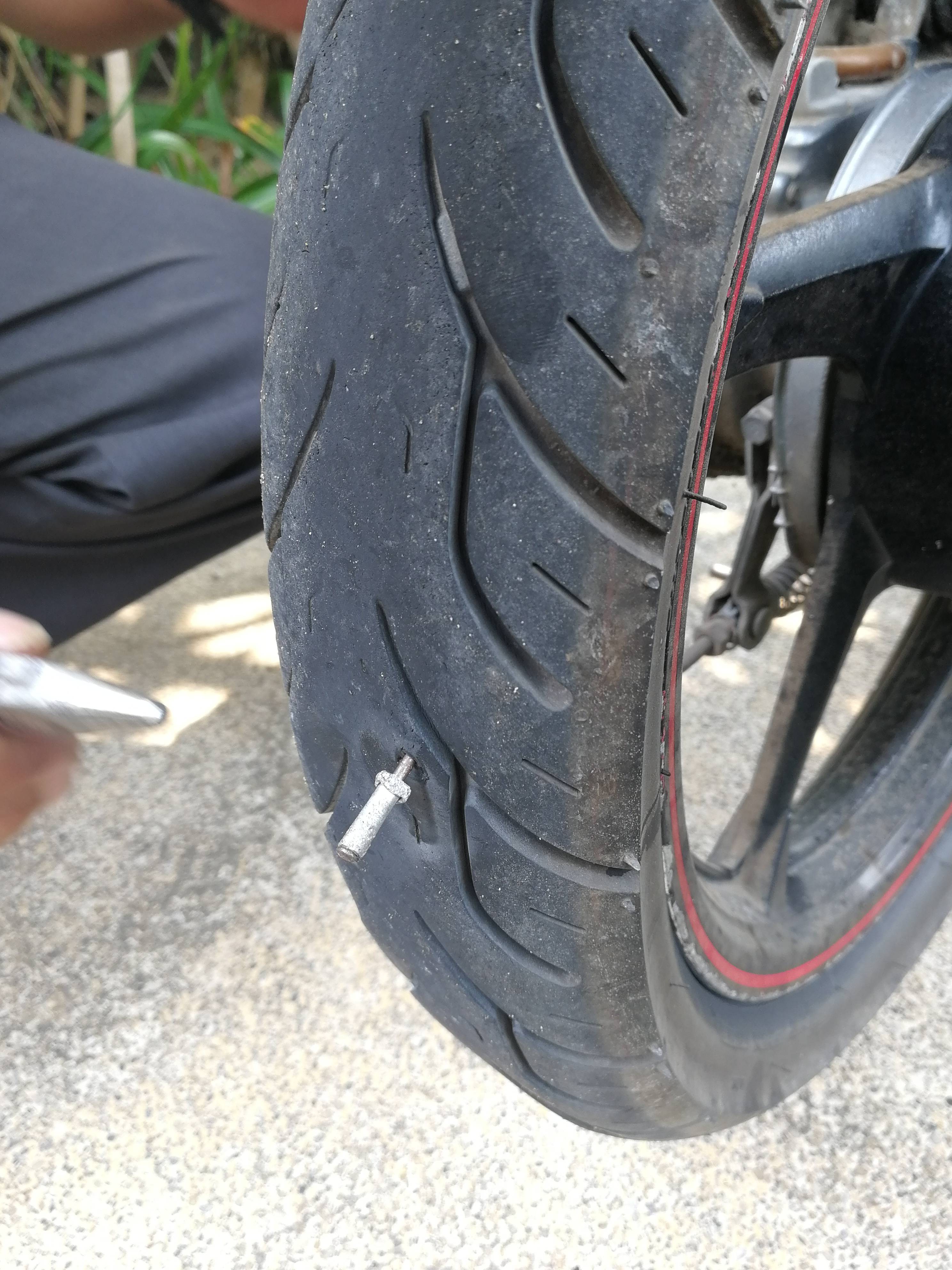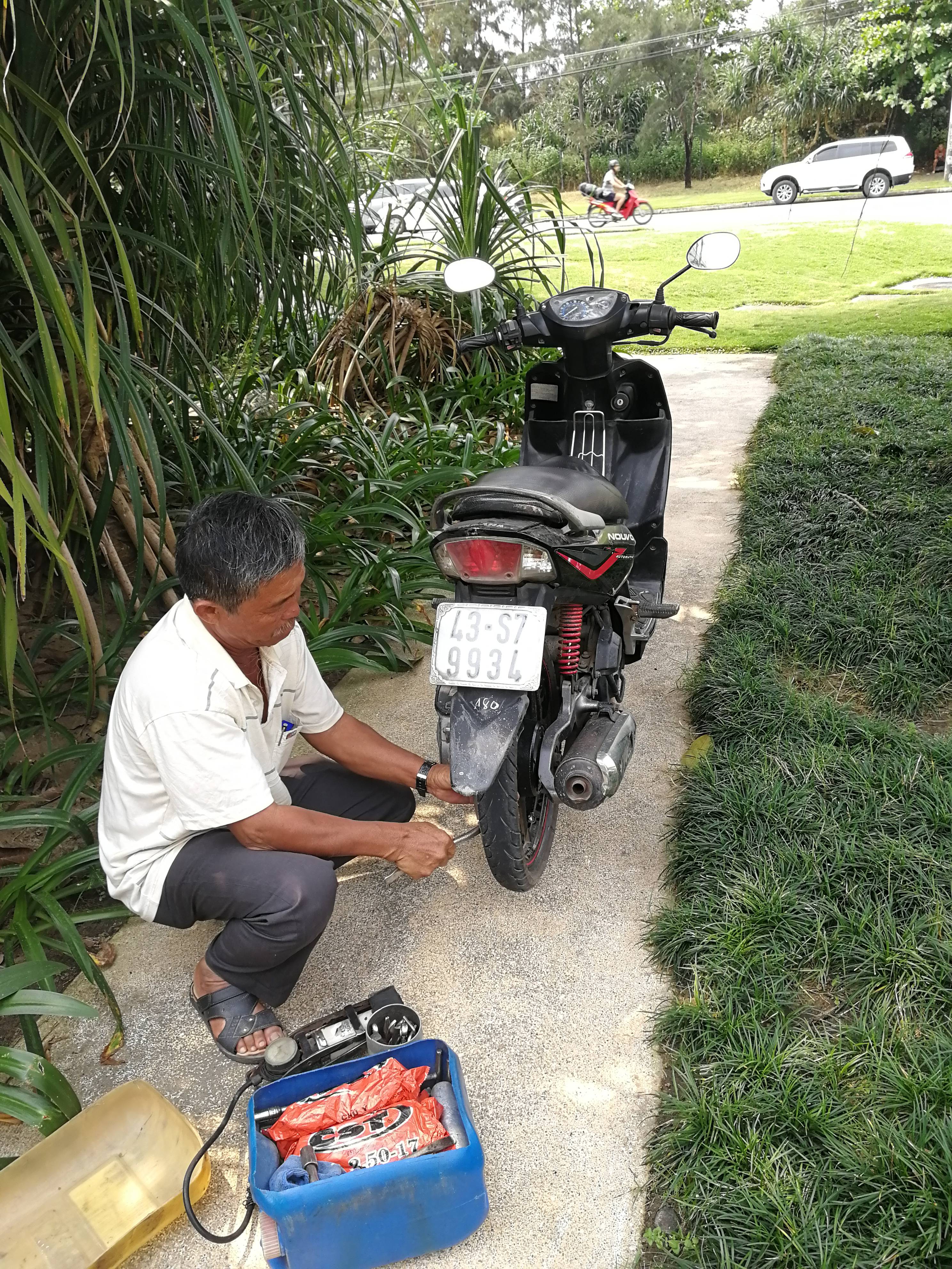 Nous voilà, les cheveux au vent, à rouler vers Danang. On est à 5min de notre destination, la route est parfaite à l’exception d’une petite chose. Un minuscule et insignifiant petit… clou ! Non mais la poisse ! Quelle était la probabilité que notre petite roue de scooter roule sur ce bout de ferraille ? Rapidement, j’ai pu voir que le scooter n’avançait plus beaucoup, et pour cause !