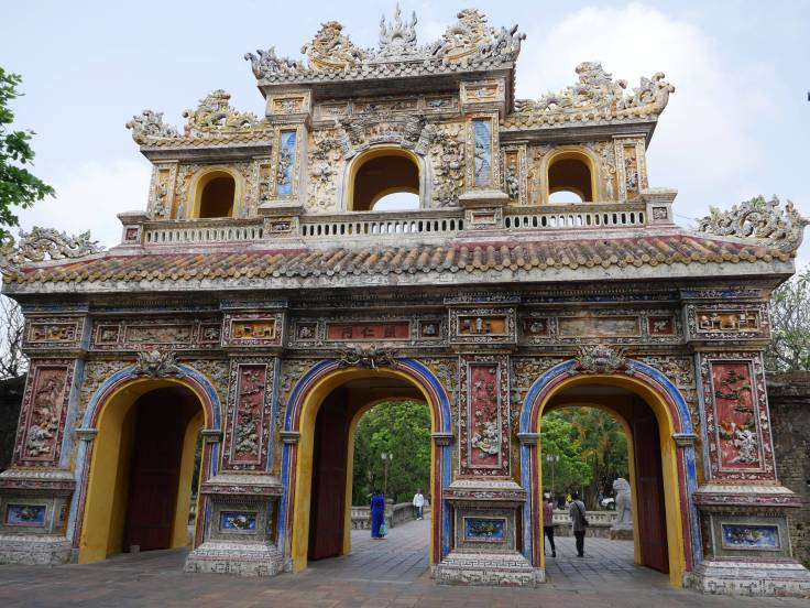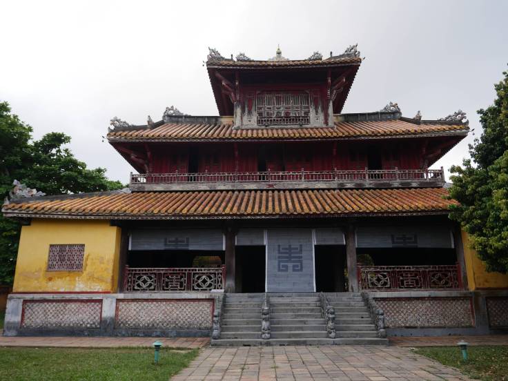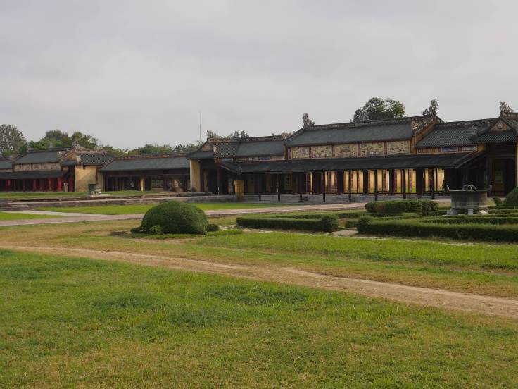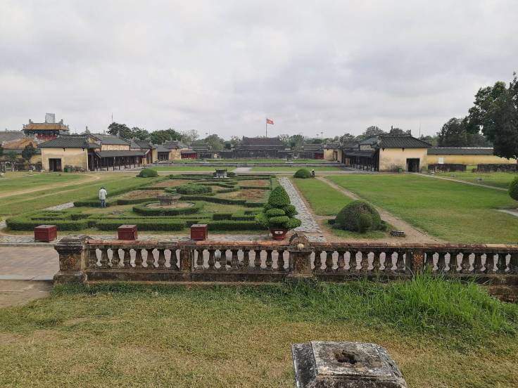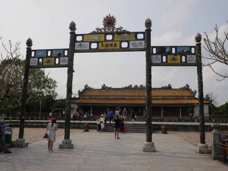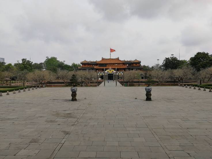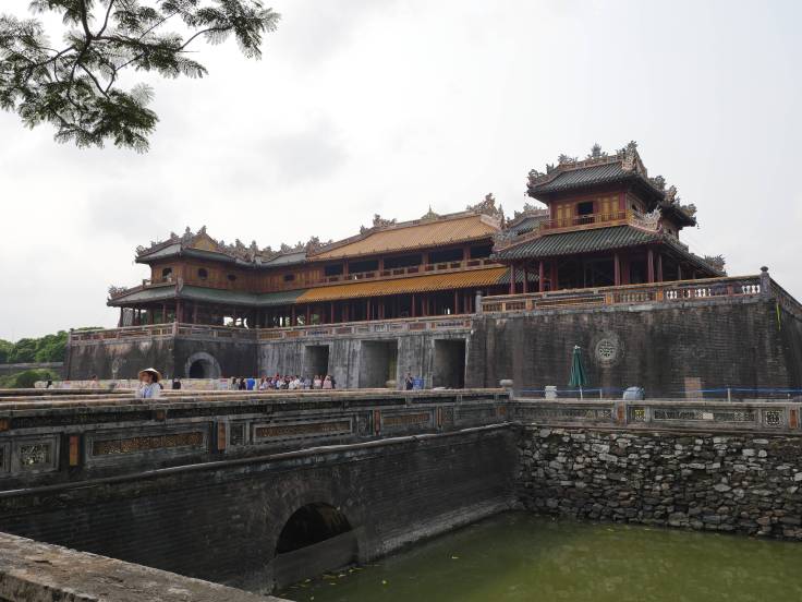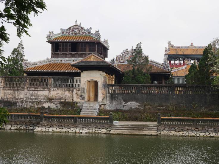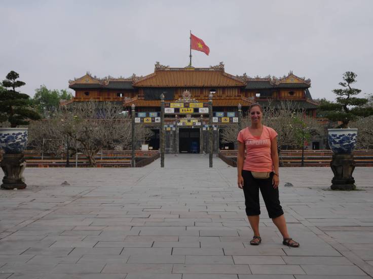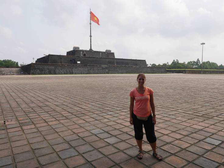 Bref, de tout façon si on est venu à Hue c’est pour voir la cité impériale. C’est LE truc à visiter. On a pris le combo cité impériale + les tombes qui sont à proximités de Hue (ticket valable 2 jours). La cité est entourée d’une immense douve et un grand drapeau du Vietnam flotte en haut de la porte d’entrée sud.