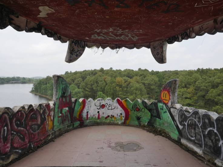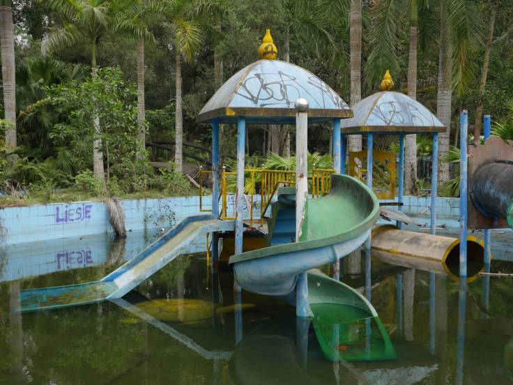 Avant de rentrer, Ria avait concocté une dernière petite halte dans un parc d’attraction…qui est abandonné ! Concept farfelu de visiter un truc ou où tout est taggé, délabré. Ce n’est sûrement pas ici que j’irai faire trempette !