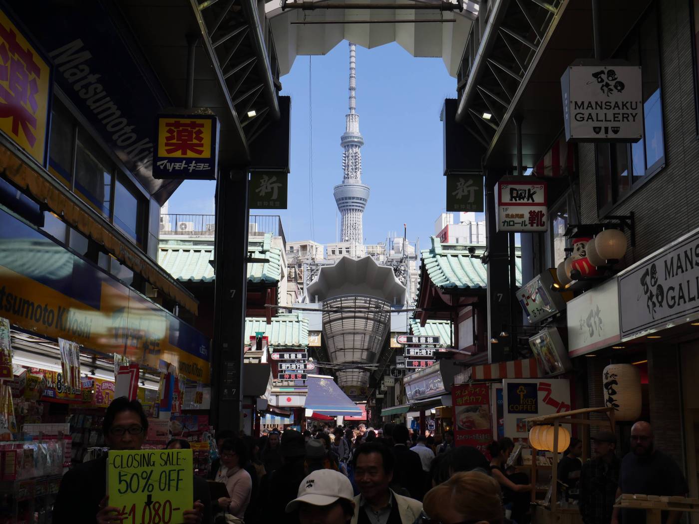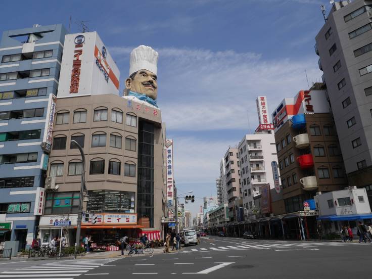 Direction le nord-est pour aller dans le quartier de Taito. On est passé dans la rue dédiée aux restaurants et ustensiles de cuisine, Kappabashi kitchen street, avec une énorme tête de cuisto en haut d’un immeuble. On ne peut pas la rater ! On y trouve de tout !