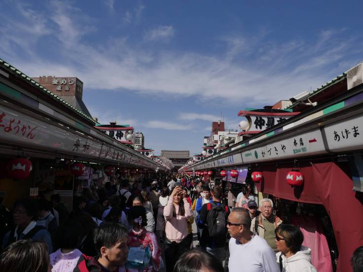 On a beaucoup de mal à avancer c’est dingue ! Par contre les rues sont hyper sympas, avec des restaurants et petits magasins partout. On arrive tout de même à se faufiler pour atteindre la rue principale qui mène au temple Senso-ji, qui est vraiment très beau.