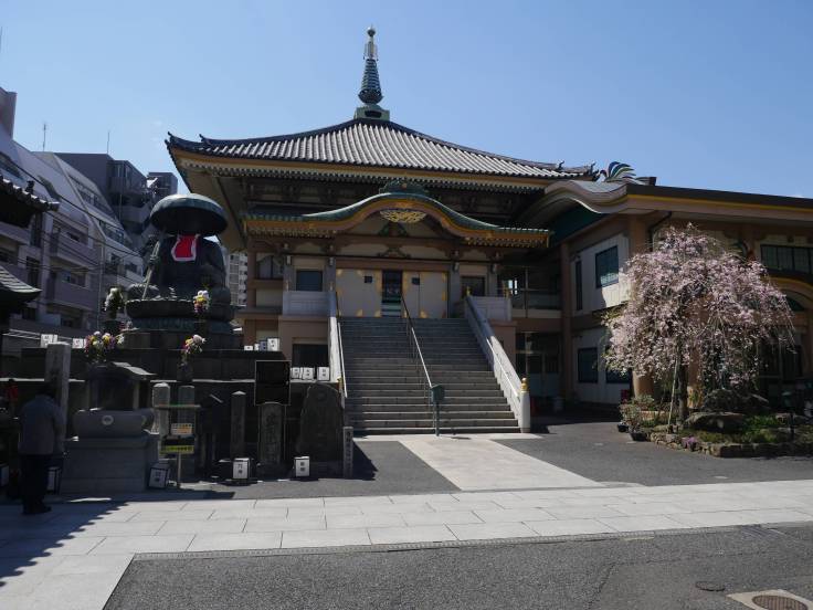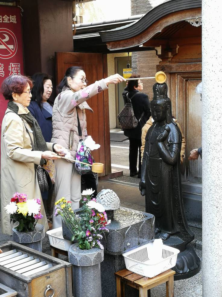 Visite d’un quartier beaucoup plus calme que Shinjuku. Au programme, la rue commerçante de Jizo-Dori, dans laquelle il y a une statue où les japonais versent de l’eau dessus avant de l’essuyer. Il paraît que ça porte chance…