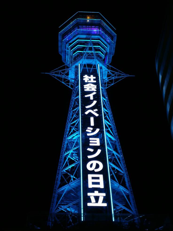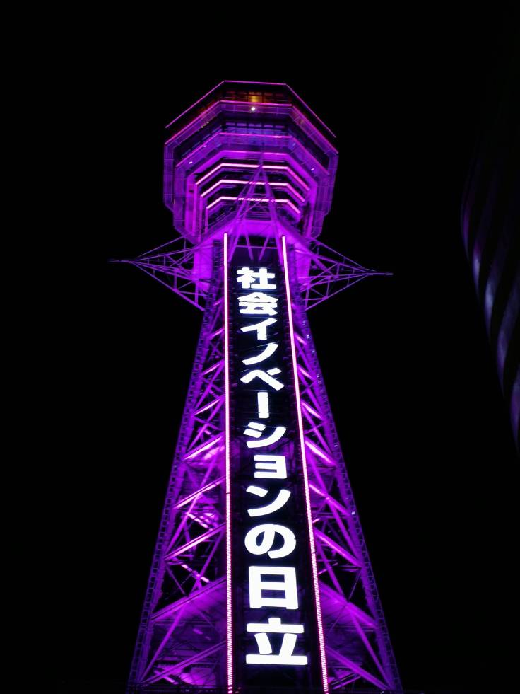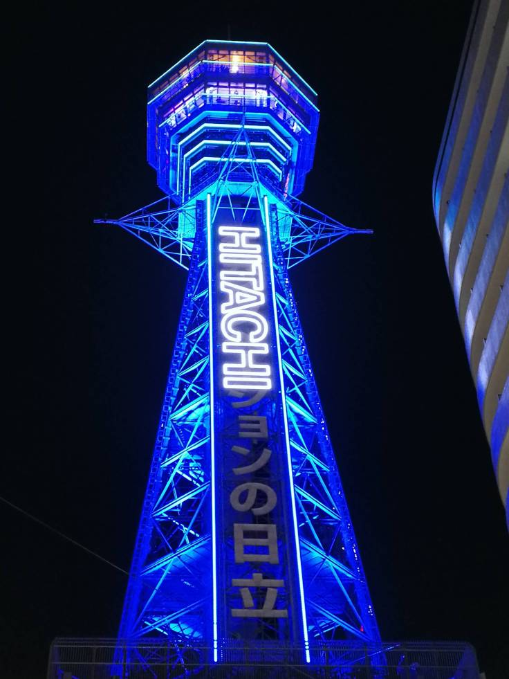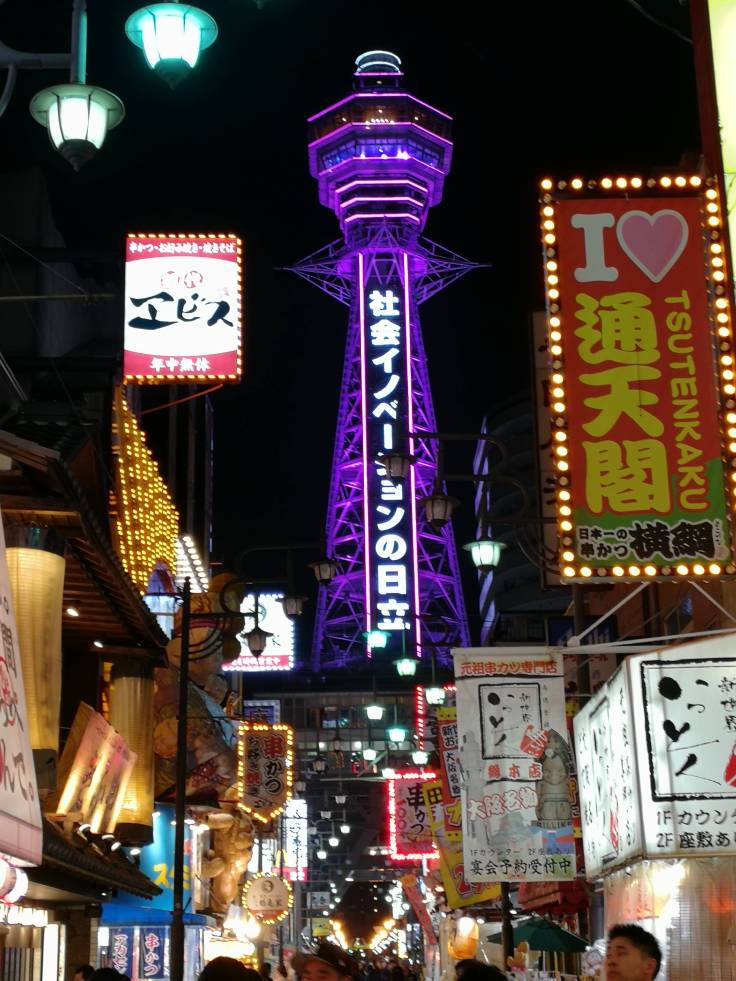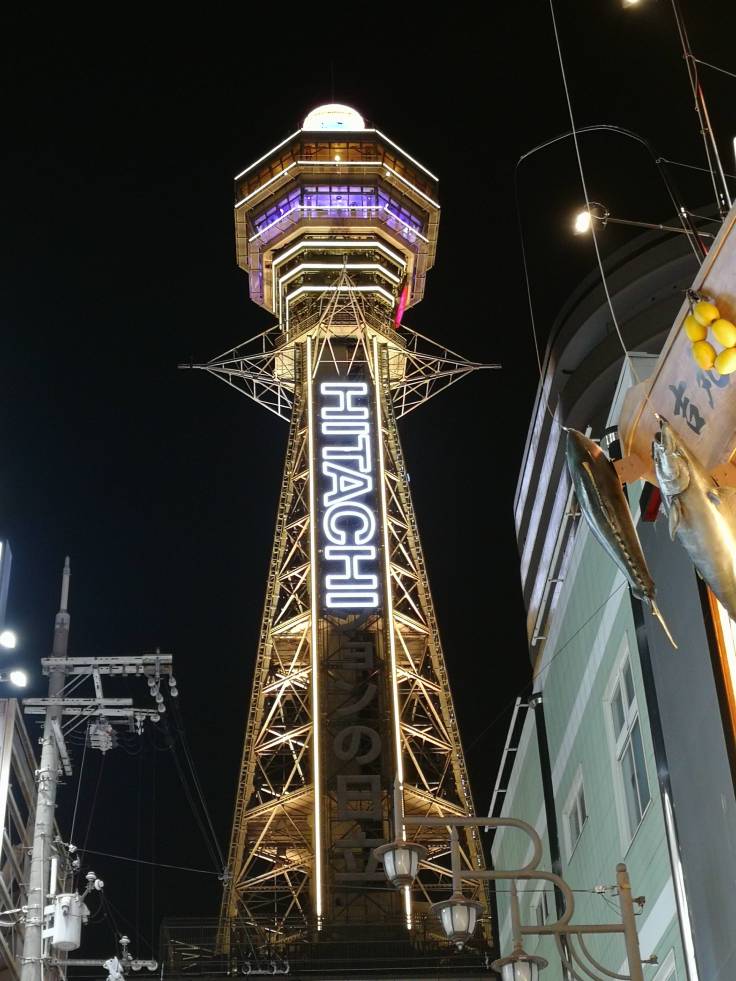 Une fois la visite terminée, on va au sud de la ville pour voir la tour Tsutenkaku, qui s’allume et change de couleur dès la nuit tombée ! Super beau !