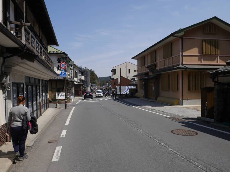 Donc après avoir pris un métro, un train jusqu’à Hashimoto, un autre train jusqu’à Gokurakubashi, qui est une gare super jolie, et enfin un funiculaire, nous voilà, après 1h30 de transport , à Koyasan Station ! Enfin pas tout à fait car on a décidé de marcher plutôt que de prendre le bus pour aller dans le centre. 3km de marche sur une route de montagne, sans trottoir, mais avec quelques points de vue heureusement ! Cela change de la ville de Osaka et Tokyo !!