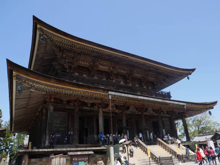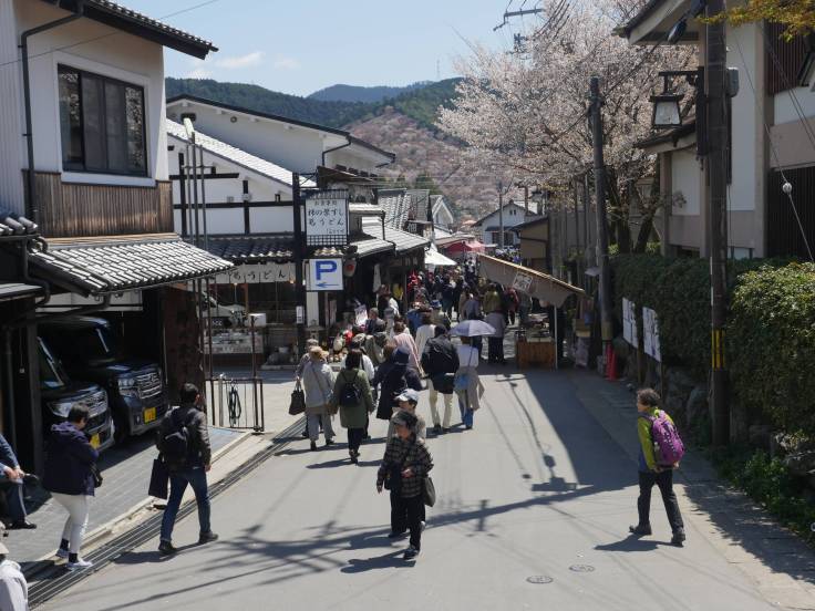 Toujours beaucoup de japonais dans les différents temples et ruelles mais cela reste très raisonnable par rapport au nombre impressionnant qu’il y avait à côté du téléphérique. Il paraît que la dernière partie, qui mène à Okusenbo, via une route hyper pentue, est, d’après les différents blogs, la plus jolie. Bah mensonge ! La route est, il est vrai, super jolie, dans une immense forêt, mais il n’y a aucun cerisier ici ! On est un peu dégoutté d’avoir perdu 1h30 pour y aller. On apprendra un peu plus tard, par un touriste japonais qui tentait tant bien que mal de nous l’expliquer en Japo-Glais (un mixte de japonais et d’anglais), que la période des cerisiers à Okusenbo s’est terminée il y a quelques jours. Gloups…