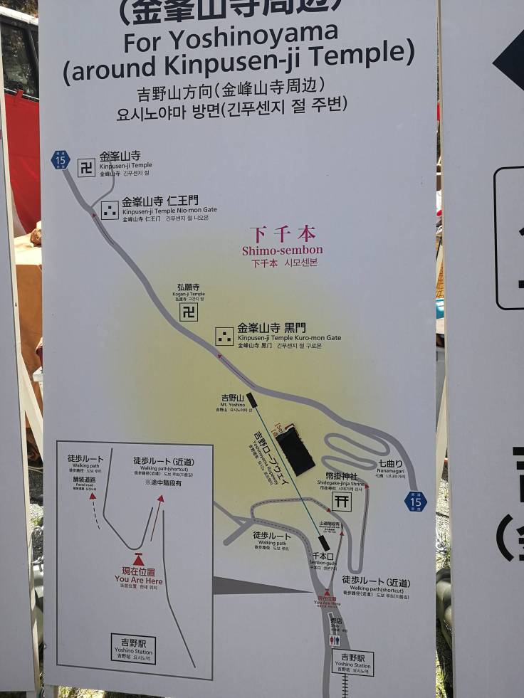 Qui dit montagne, dit dénivelé positif ! Ce qui est sûr c’est que certaines portions piquent fort ! Et bizarrement, la foule qu’on a vu à la gare a disparu et est loin derrière… Coïncidence ?! … En fait non, ils sont tous devant car les bougres ont préféré prendre le téléphérique pour rallier le premier pallier de la randonnée. Tricheur… La visite se déroule en fait dans la ville de Yoshino, où il y a pleins de restaurants et magasins touristiques (bien sûr absolument rien en anglais).