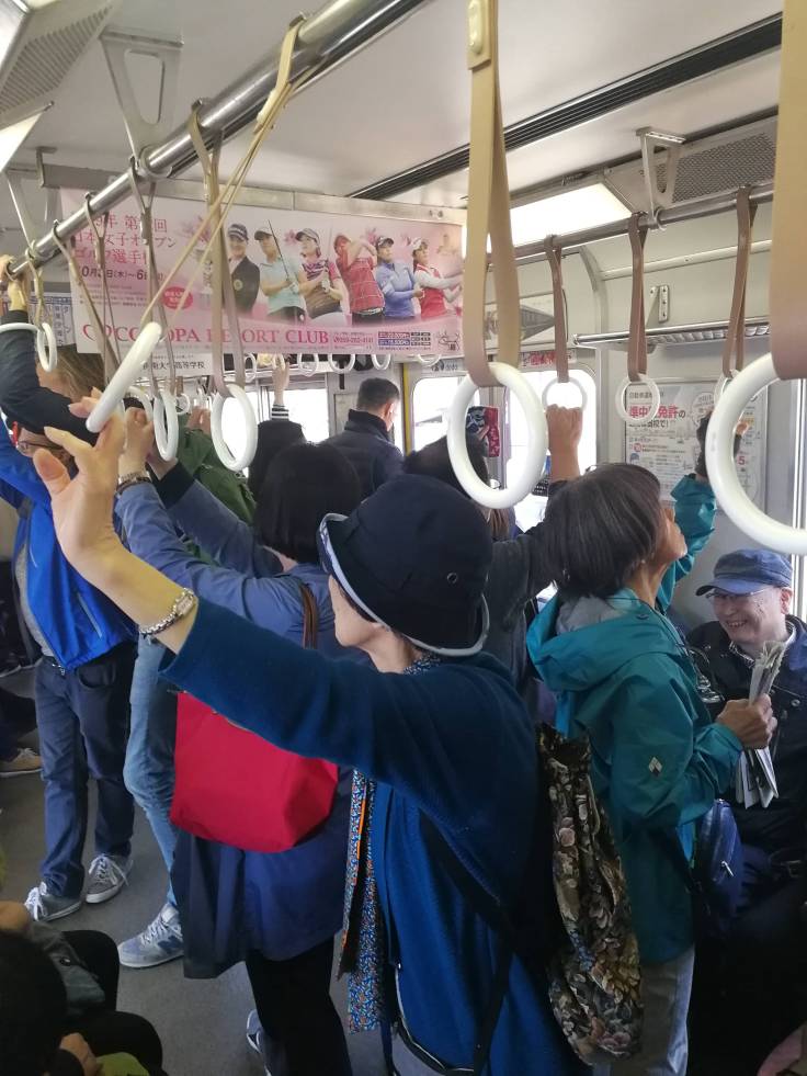Après avoir rejoint la station de Osaka Abenobashi, on a pris un train de banlieue plus de 1h30. On y est allé en pleine semaine, un mardi. Bah cela n’a pas empêché le train d’être plein à craquer ! Que des touristes japonais. Ne jamais sous estimer l’amour des japonais pour ces arbres !! En plus, c’est un peu la guerre dès que le train arrive car tout le monde se précipite sur un siège ! Normal, personne n’a envie de faire le voyage debout pendant presque 2h 🙂