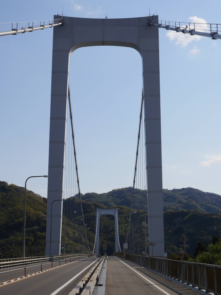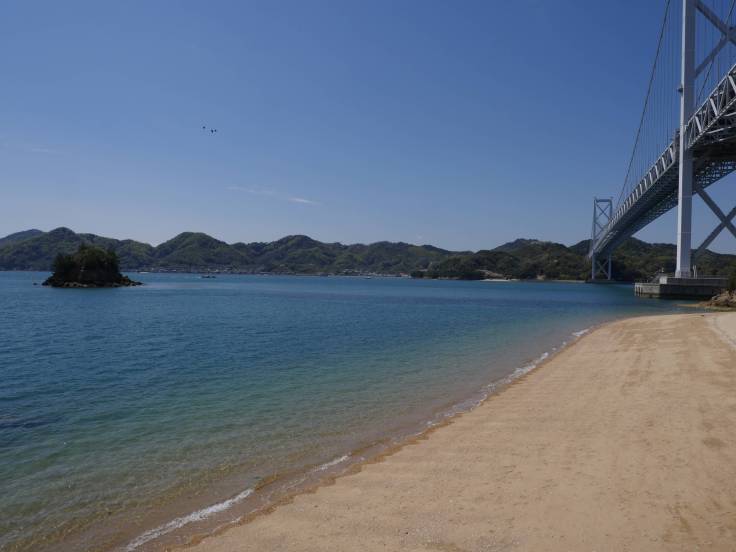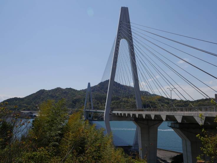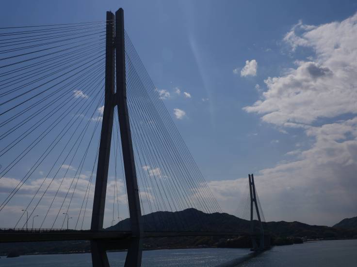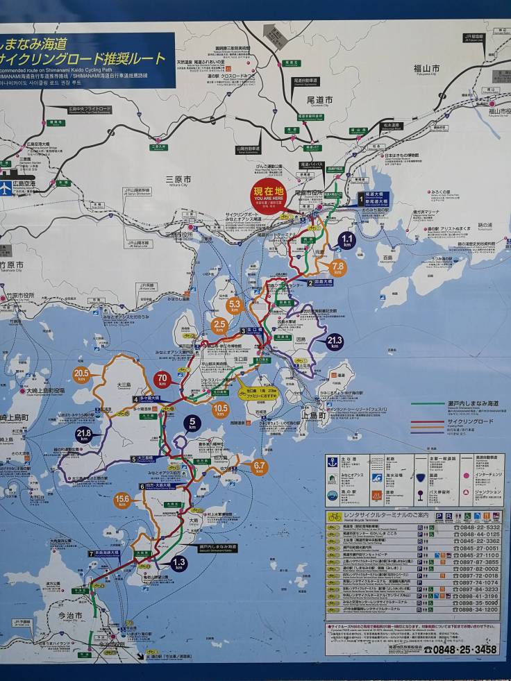 Après notre belle journée reposante de la veille sur l’île de Miyajima, cette journée sera un peu moins reposante car elle sera placée sous le signe du vélo ! Une longuuue balade d’environ 70km nous attend entre Onomichi à Imabari. Il faut traverser plusieurs îles, qui sont reliées entre elles par des ponts gigantesques (trajet en vert sur la carte).