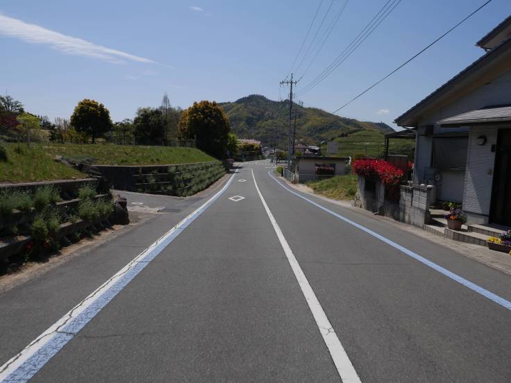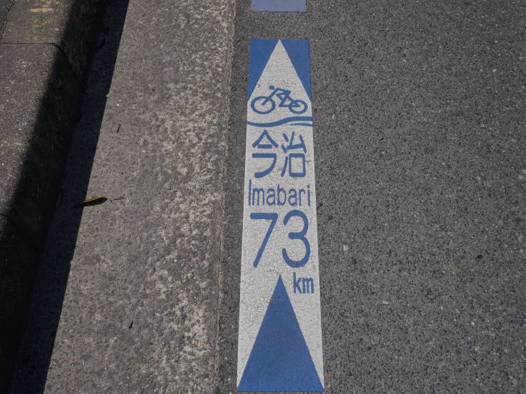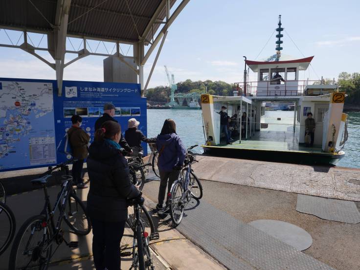 On prend un mini ferry, et c’est partiiii !! L’avantage de cette balade c’est que c’est super simple : une ligne bleu est tracée entre Onomichi et le hangar à vélo à Imabari. Il faut donc suivre la ligne bleu tout du long. Par contre Ria fait un peu la tête car le marquage au sol indique 73km et non 70 comme annoncé 🙂