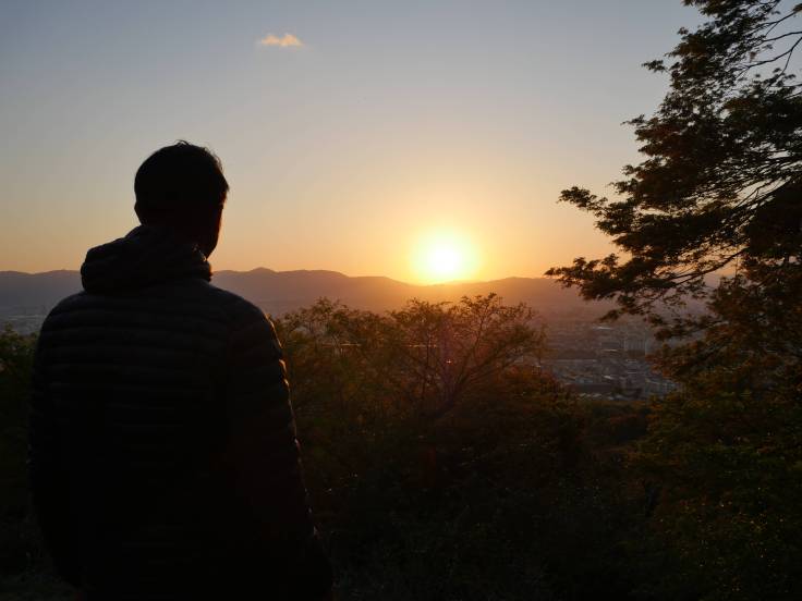 Après avoir marché dans ces couloirs de Tori, on arrive à un super point de vue pour admirer le coucher du soleil (notre deuxième au Japon après Tokyo).