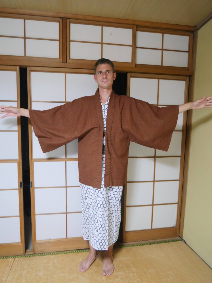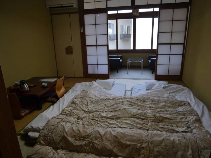 C’était notre première nuit dans un ryokan et c’est top ! Ce n’était pas un vrai ryokan car ce n’était pas un temple mais tout était pareil. Une grande chambre avec deux futons et des portes coulissantes. On a pu mettre nos habits de lumière 🙂