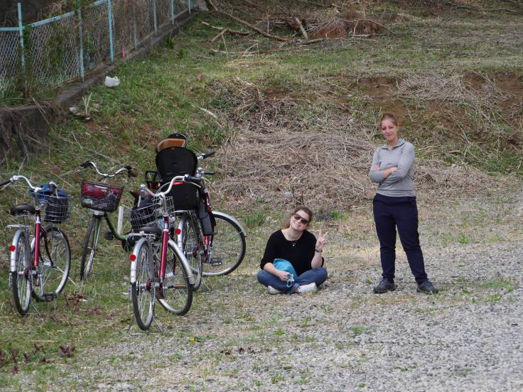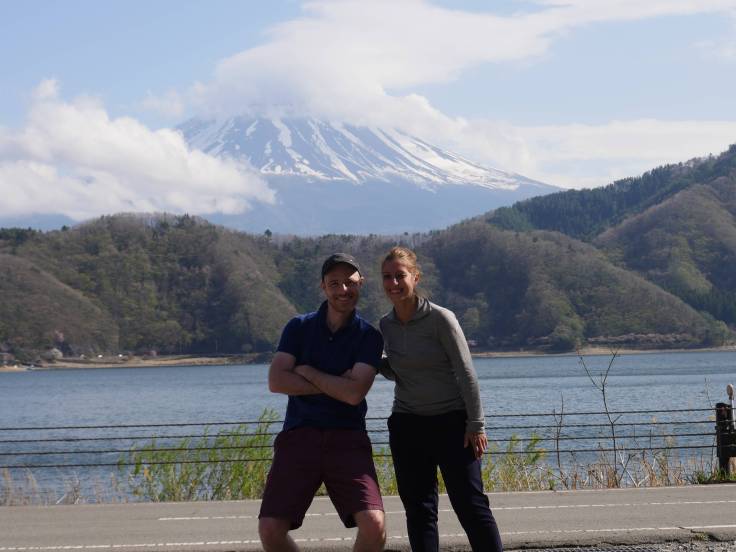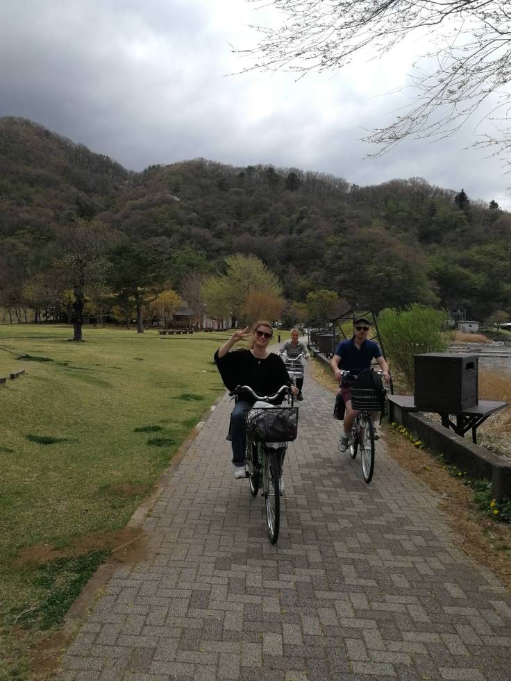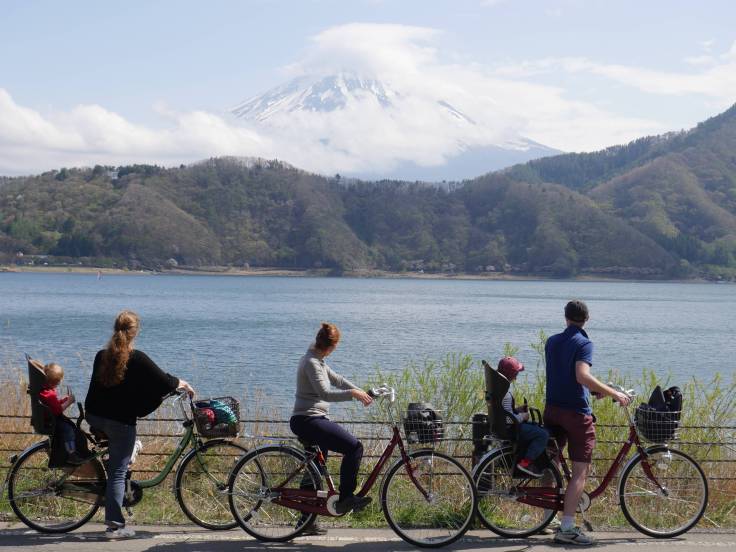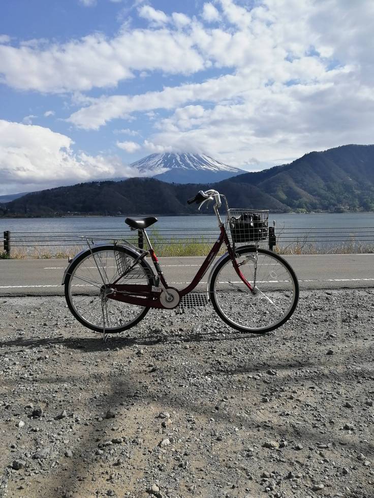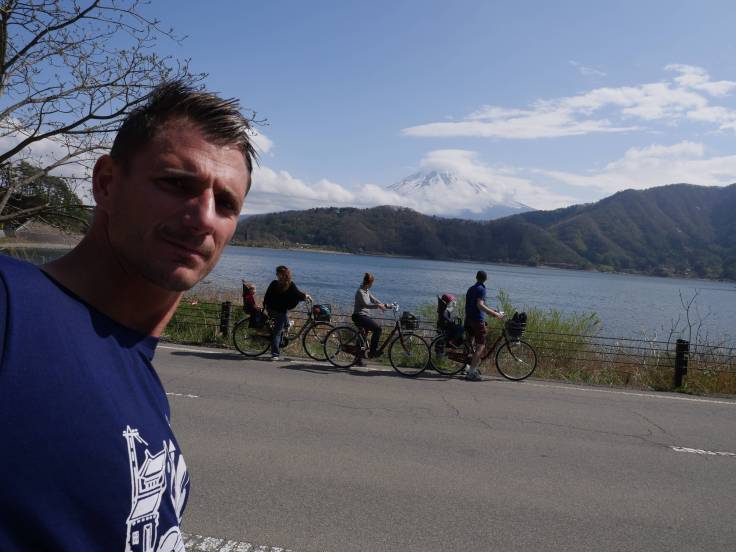 Après avoir loué des vélos près de la gare dans une agence, vélo électrique pour Émilie et normaux pour nous, nous voilà partis pour faire le tour du lac Kawaguchiko ! Le vélo le moins cher était à 1500 yens (9 euros) la journée, cela nous change clairement des autres pays d’Asie où on était plus proche de 1 ou 2 euros… 😦