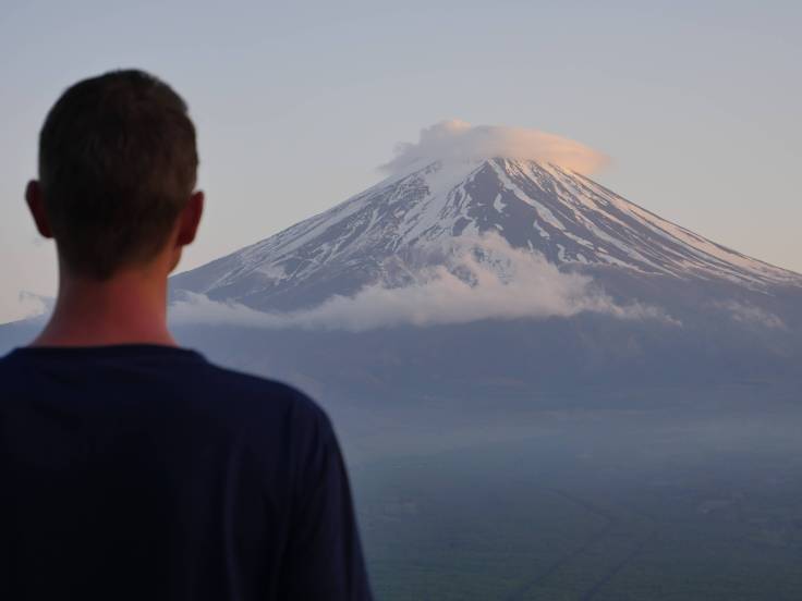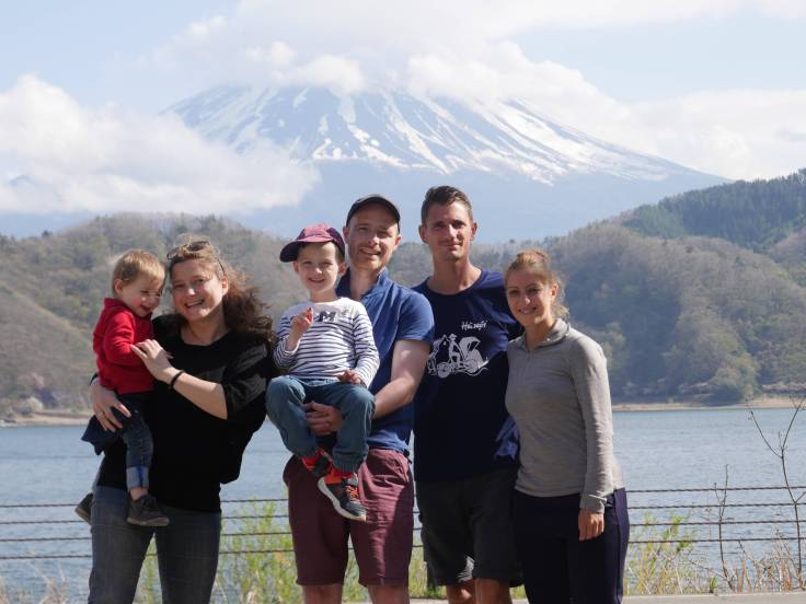 On voit maintenant le Mont Fuji à 90% !!! Le ciel est complètement dégagé, il ne reste plus qu’un petit nuage au sommet. Il est 17h, le coucher du soleil approche, donc on rejoint le centre ville pour aller au point de vue de Kashi Kashi. Jérôme, Émilie et les enfants en téléphérique et nous à pied. On l’a déjà fait, c’est 25min. On monte vite vite vite pour les retrouver en haut… Une fois arrivé, personne… En fait, le téléphérique était fermé mais on avait pas vu avant de les laisser pour prendre le chemin de randonnée.