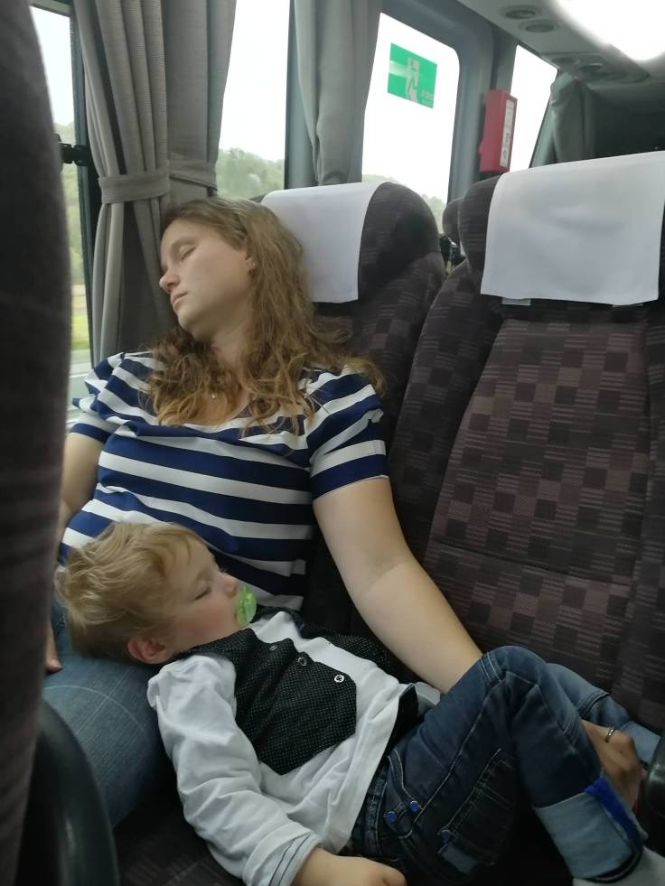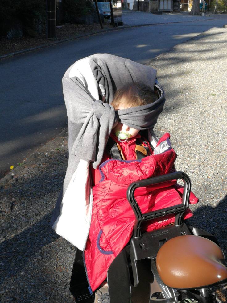 Le reste du parcours est un peu long car il n’y a plus de pistes cyclables. Même Maël s’est endormi sur le siège enfant ! Emilie a été obligé de lui attacher la tête pour ne pas qu’elle tombe 🙂 En mode Pirate ! Et oui, on fait avec les moyens du bord ! 🙂