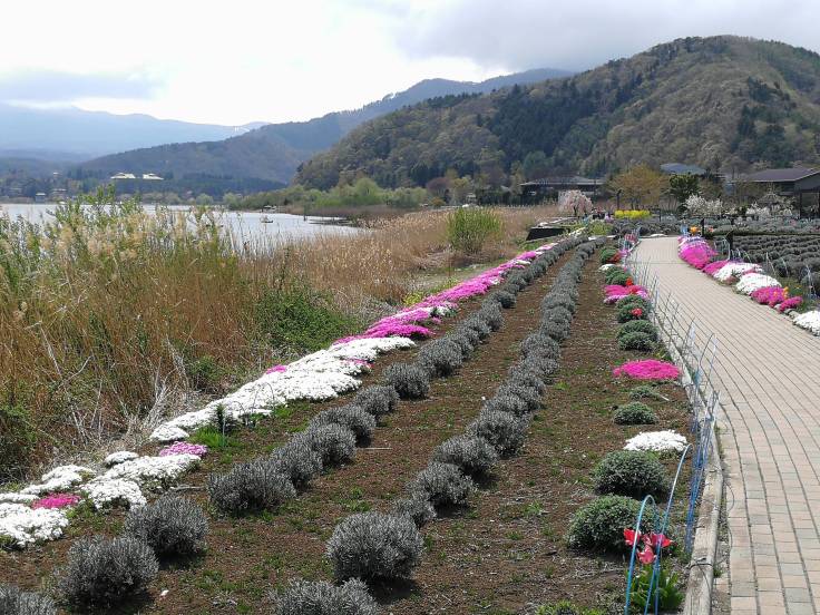 On a rejoint le petit parc Oishi, avec ces belles allées de fleurs, où on a fait une pause repas, avec une vue légèrement dégagée sur la grosse montagne. Qui sait, on la verra peut-être…