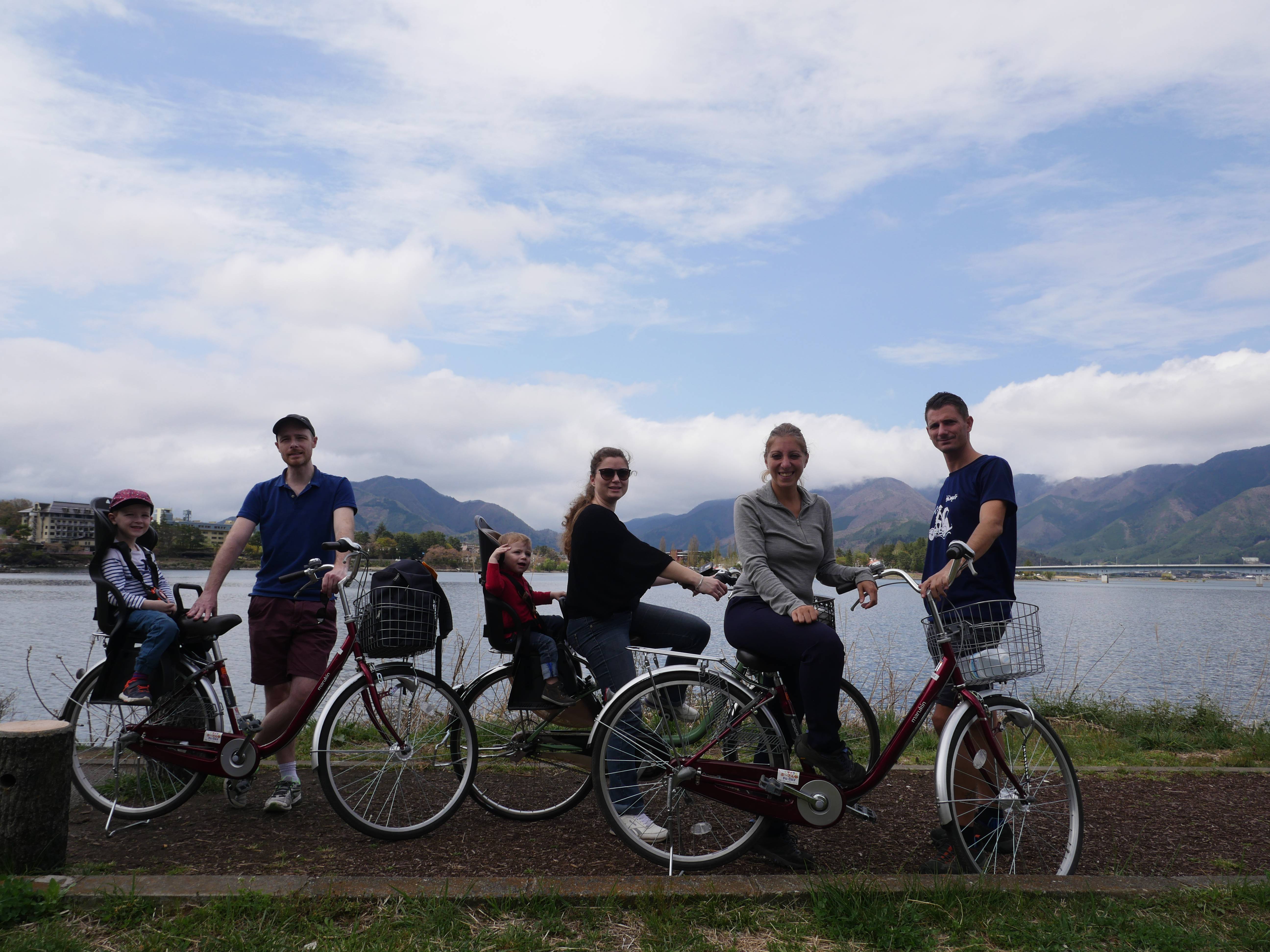 Après avoir loué des vélos près de la gare dans une agence, vélo électrique pour Émilie et normaux pour nous, nous voilà partis pour faire le tour du lac Kawaguchiko ! Le vélo le moins cher était à 1500 yens (9 euros) la journée, cela nous change clairement des autres pays d’Asie où on était plus proche de 1 ou 2 euros… 😦