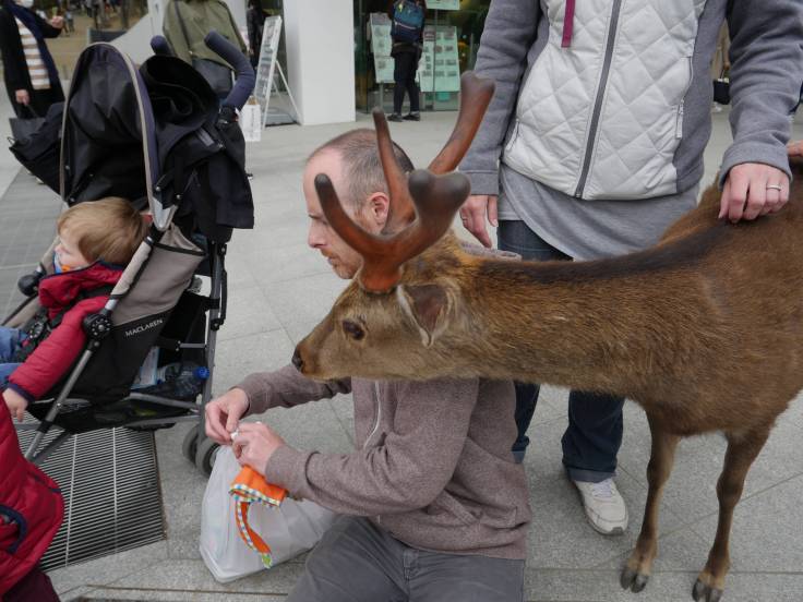 Après notre marche « intense » du matin, l’appétit s’est fait sentir. Quoi de mieux qu’un bon plat acheté au supermarché dégusté sur un parking ? 🙂 Et oui, il n’y avait malheureusement pas, ou très peu, d’endroit où se poser pour manger. C’est bien sûr de loin le meilleur repas de notre séjour au Japon… 😦 Mais bon, on a pu le « déguster » en compagnie de quelques daims qui étaient venus gentiment nous rendre visite…ou bien essayer de piquer nos sacs ! Vu comme c’était « bon », pas sûr qu’ils auraient appréciés 🙂 :).