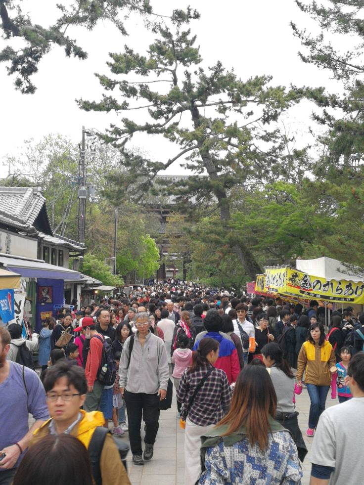 Après notre péripétie pour rejoindre Kyoto, et notre visite de la veille où on a pu retrouver nos compagnons de route, on a décidé de se rendre au pays des daims : Nara ! C’est sous un ciel nuageux que l’on s’y rend, à environ 1h de Kyoto. Pour y aller pendant la golden week, il faut être super motivé !! Le quai du train de la ligne JR est blin-dé ! Obligé d’attendre le train suivant qui sera rempli en 30 secondes chrono ! Vraiment incroyable de voir autant de monde. On dirait vraiment un jour de grève pendant une heure de pointe :-).
