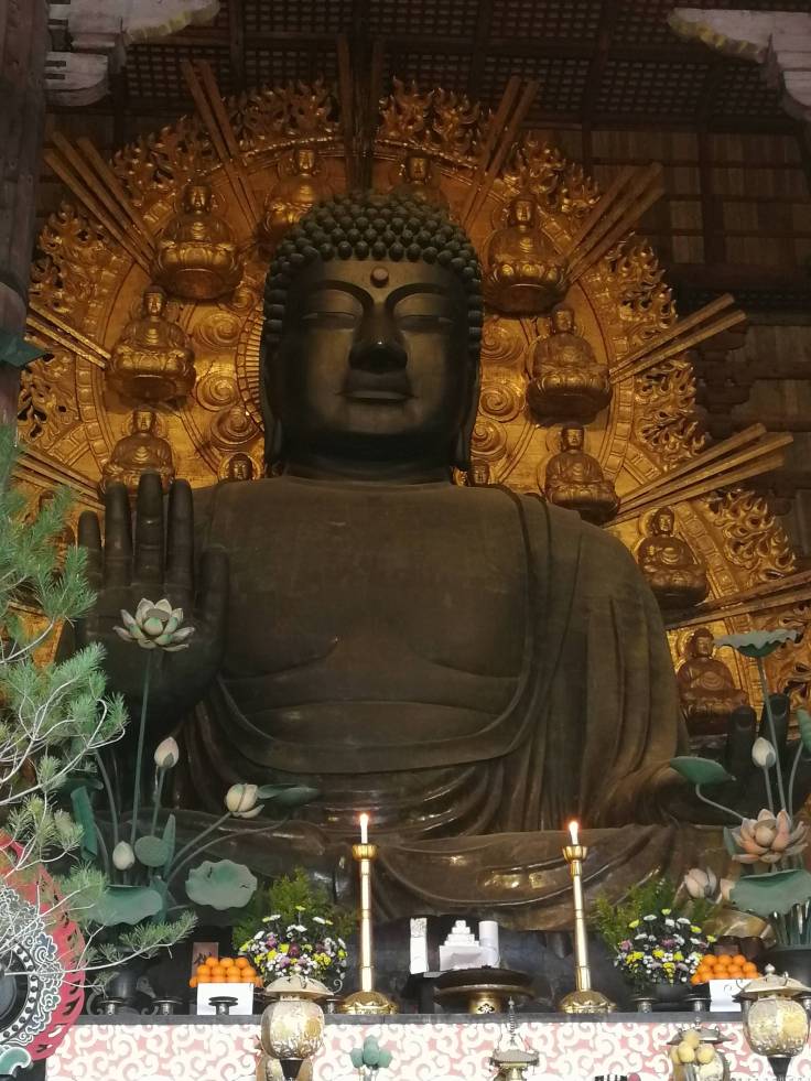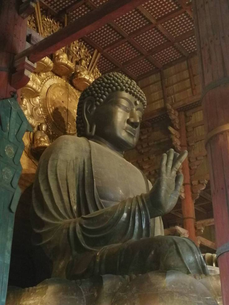 Une fois payé l’entrée du temple, 600 yens / personne, on a pu en profité un peu. Le temple Todaiji abrite le bâtiment Daibutsu-den, connu pour être la plus grande construction en bois du monde, et hébergeant également le Grand Bouddha assis en bronze. 18m de haut et 250 tonnes, c’est une « petite » statuette imposante qui semble être l’un des plus vieux Bouddha puisque sa construction remonte au VIIIe siècle, quand Nara était encore la capitale du Japon.