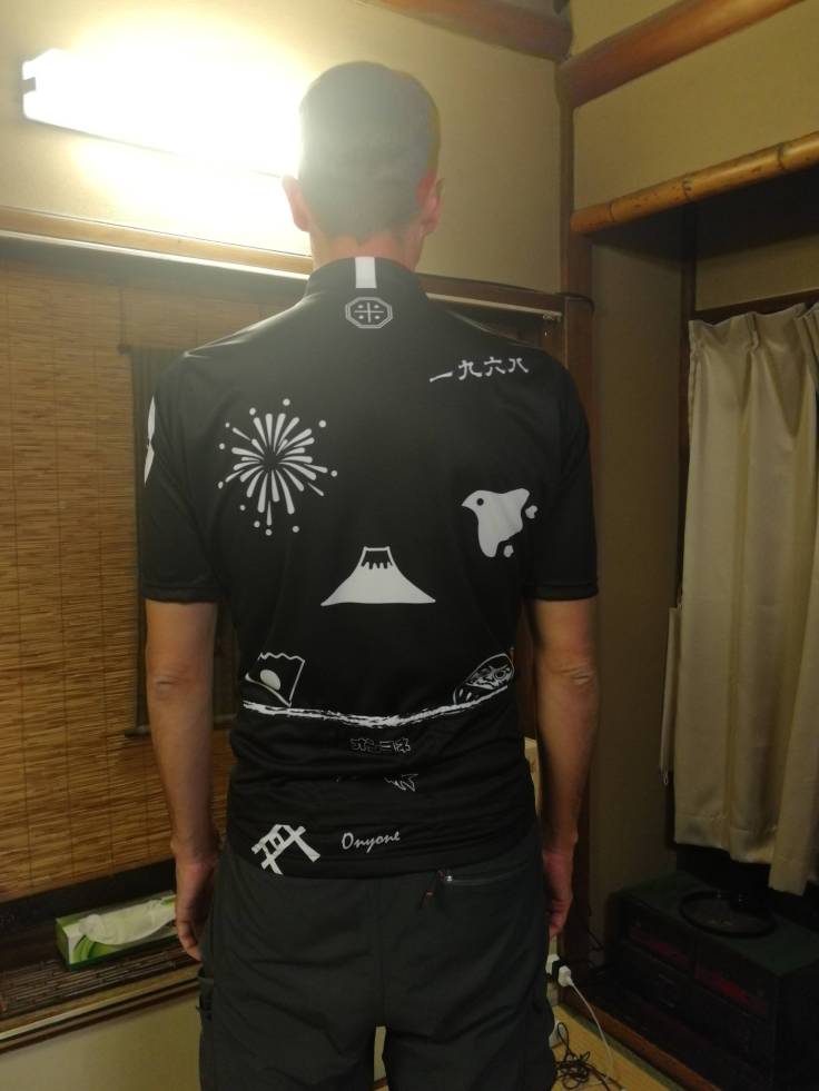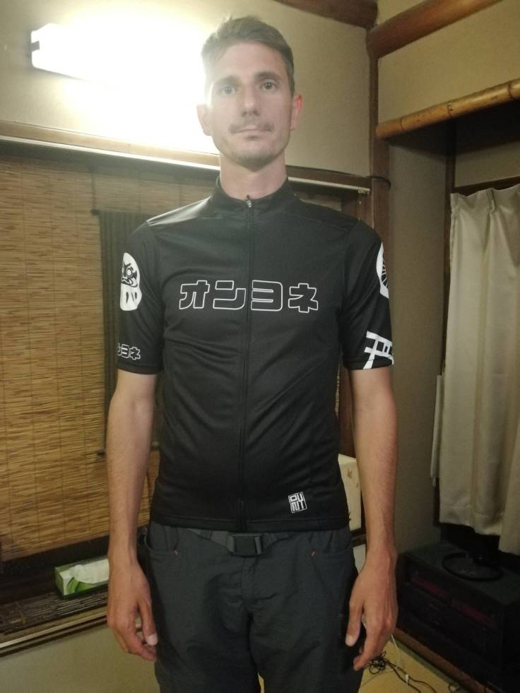 Maintenant place aux choses sérieuses : les magasins de sport 🙂 🙂 Dans l’avenue où on était, Yasukuni Dori, il y en avait pas mal. On marche un peu mais on fini par trouver la perle rare : une boutique de vêtements de cyclistes 🙂 Après avoir fais ma « Pretty Woman » en essayant une dizaine de tenues, j’ai craqué sur un maillot avec des écritures et motifs typiquement japonais. Un dernier beau souvenir de ce pays que l’on a adoré. Vivement que je le porte sur les belles routes françaises !