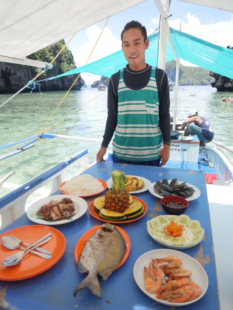 On y reste une bonne demie heure avant de retourner au Secret Lagon, où il y a moins de bateaux… Mais tout de même un peu trop. Du coup, pause repas !! Et quel repas ! Moules, poisson frais, crevettes, riz, poulet, ananas, crudités. Un vrai festin, qu’on aura du mal à terminer.