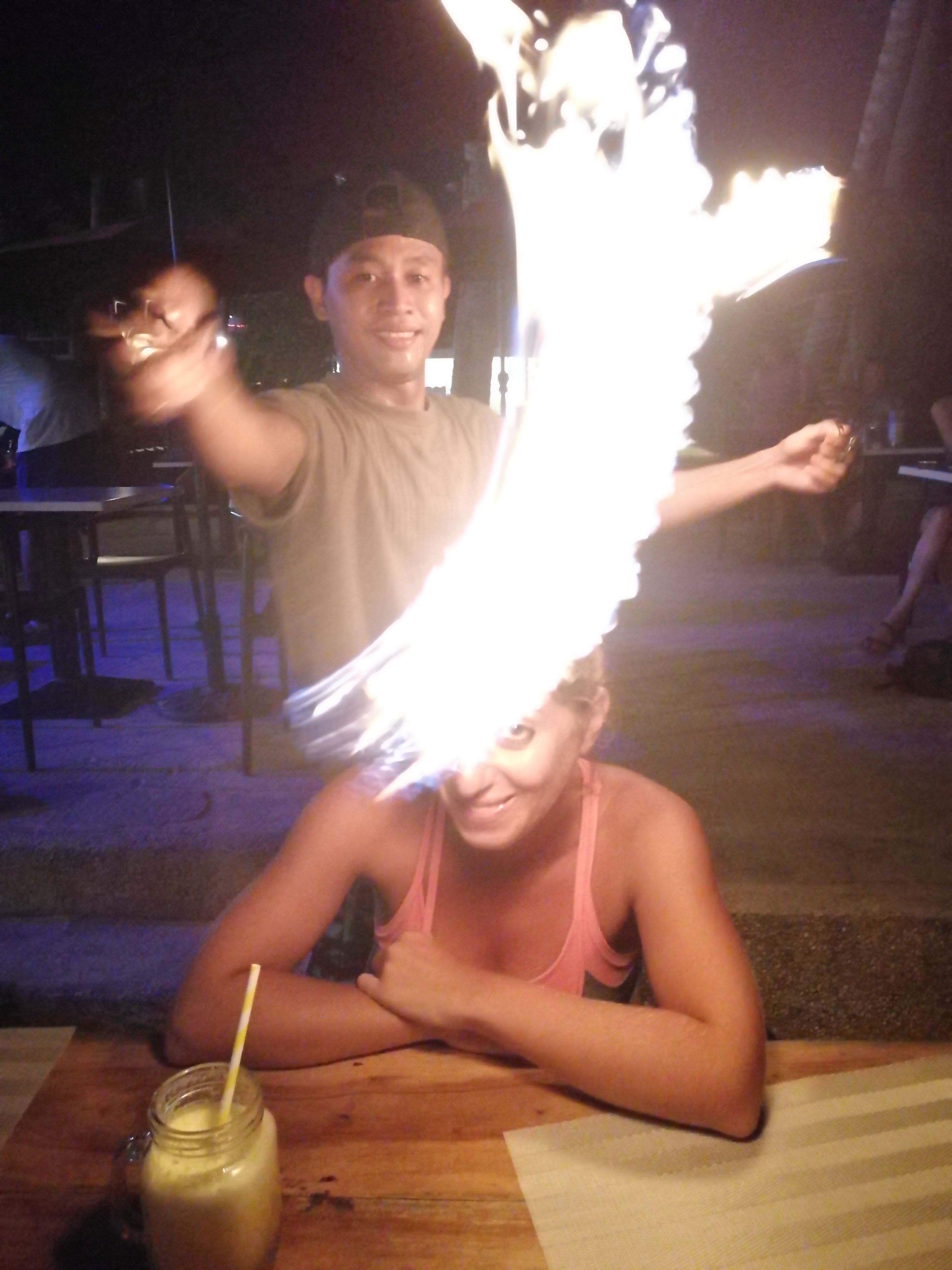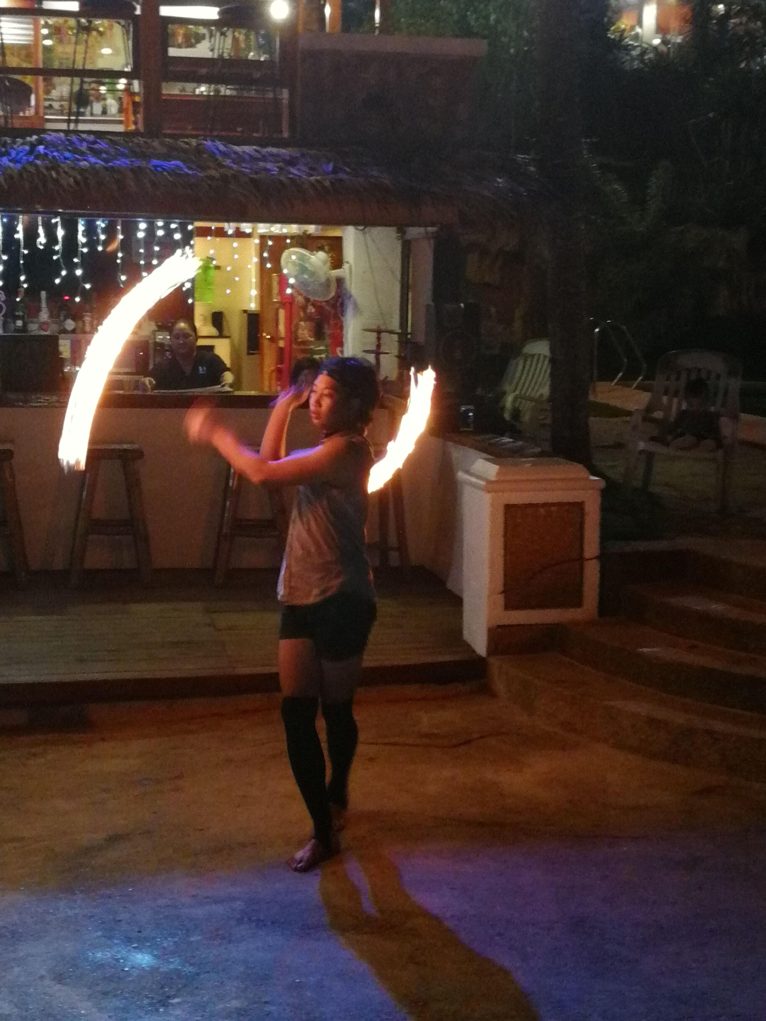 Le soir, on a retrouvé les deux familles de français qu’on avait rencontrées dans un van au Cambodge ! Comme le monde est petit !! On les avait vu juste une heure mais le courant était bien passé. Du coup soirée pizza sur Alona Beach avec un spectacle de feu plutôt sympa.