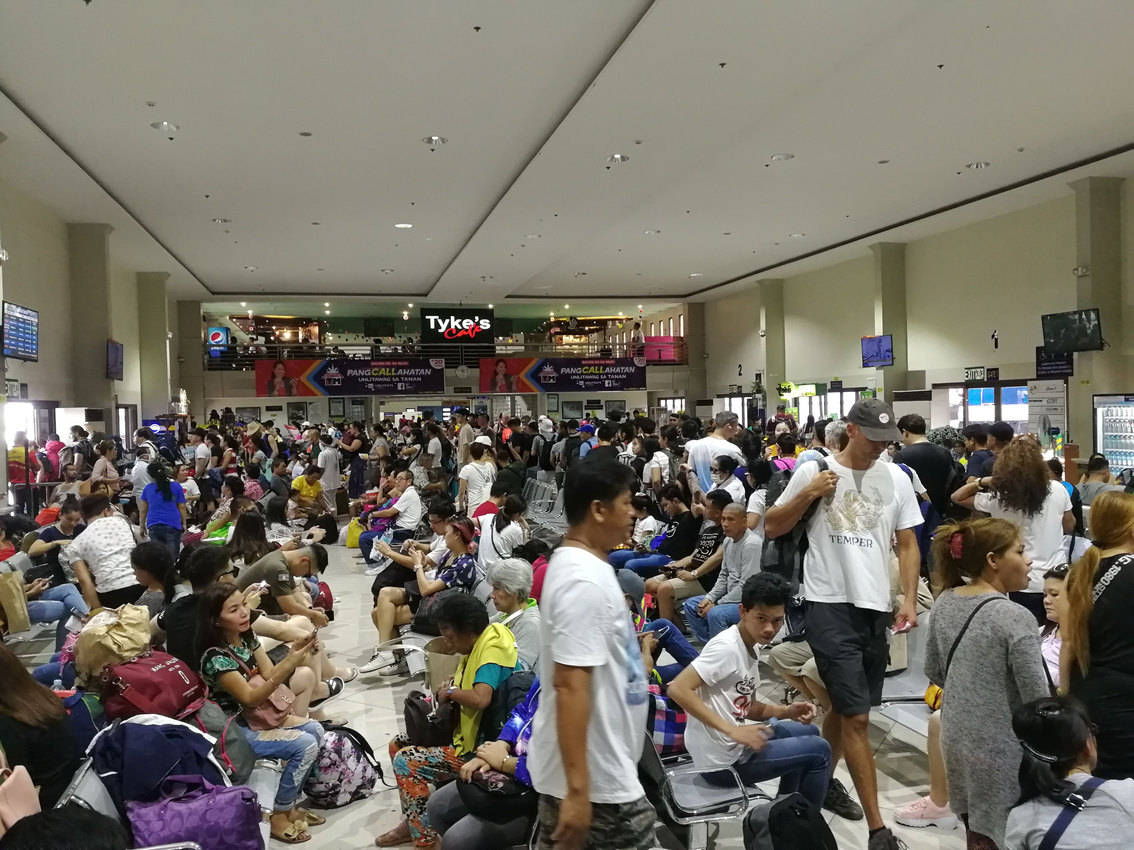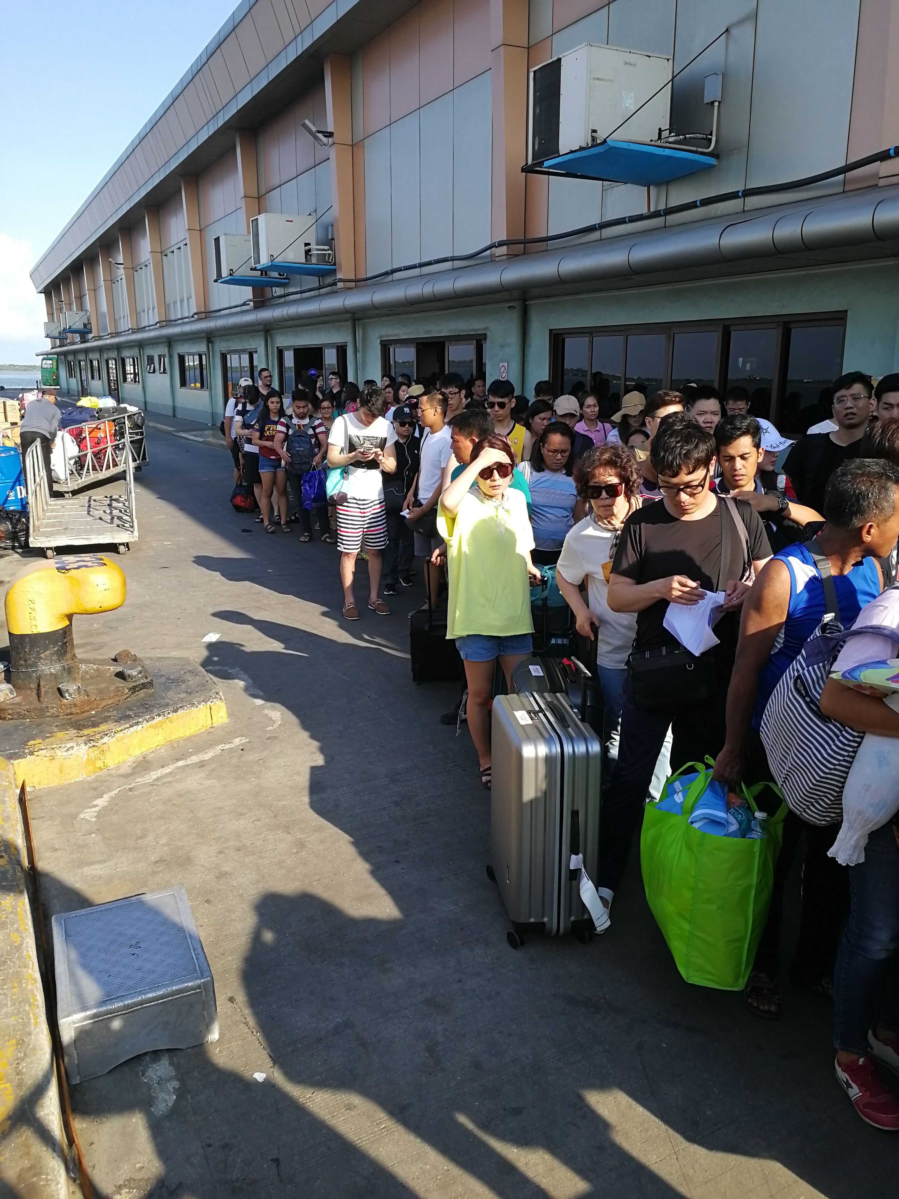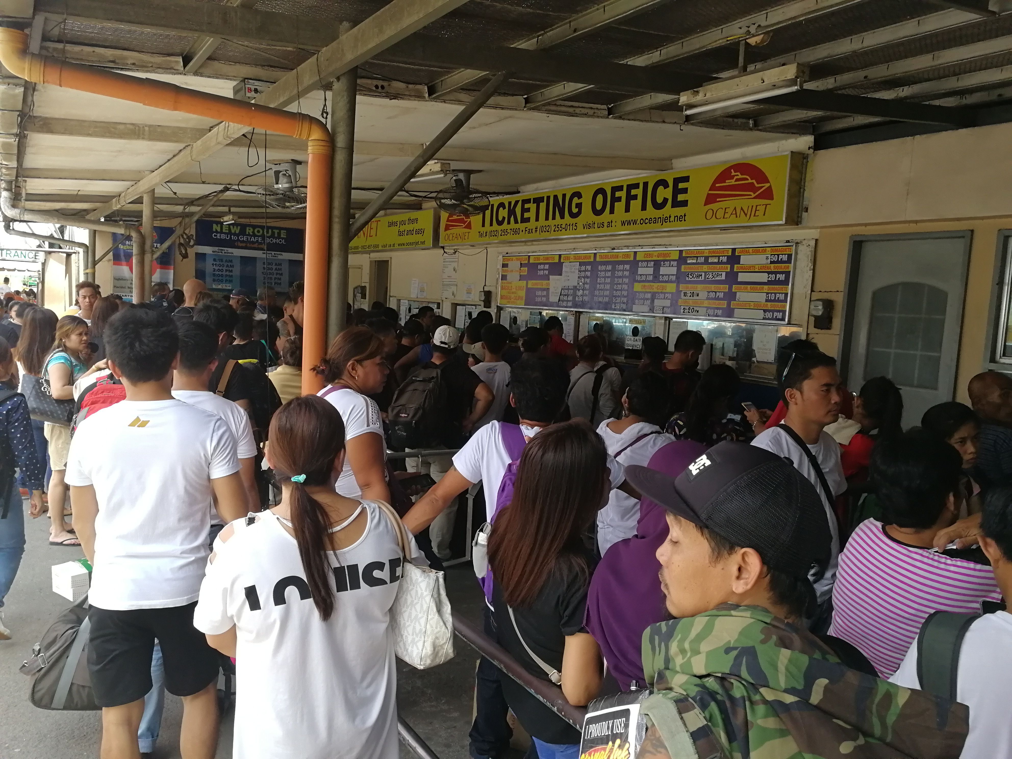 On arrive devant le guichet pour prendre un ticket pour le bateau pour Bohol… Et là, il y a une queue de folie !!! Il nous faudra 1h15 pour accéder au comptoir. En plus, le prochain bateau de 14h est plein, du coup on est obligé de prendre celui de 15h20… Notre bonne étoile est partie…