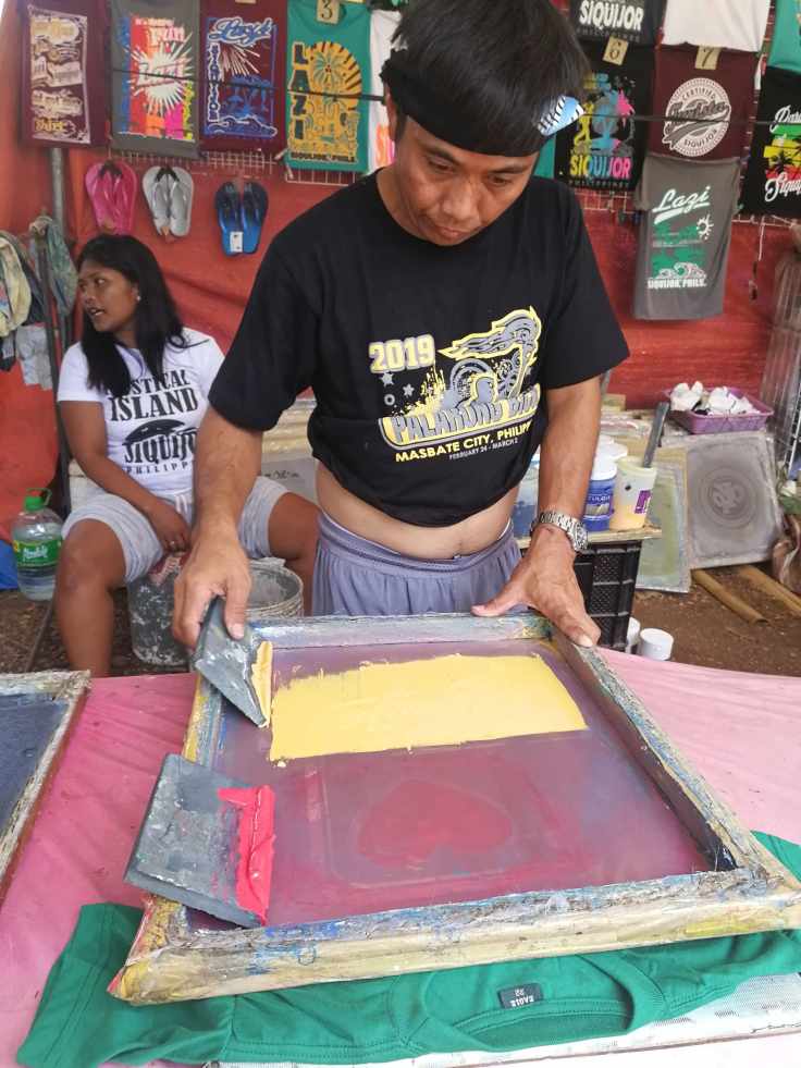 En partant, on s’est arrêté dans un stand où ils font des flocage sur des t-shirts ! C’était incroyable, on ne savait pas qu’ils faisait comme ça. Un t-shirt vierge, un motif, ils étalent la peinture et font sécher au sèche cheveux, c’est génial (bien que très artisanal quand même 🙂 ) ! Pour la peine on prendra un t-shirt chacun 🙂
