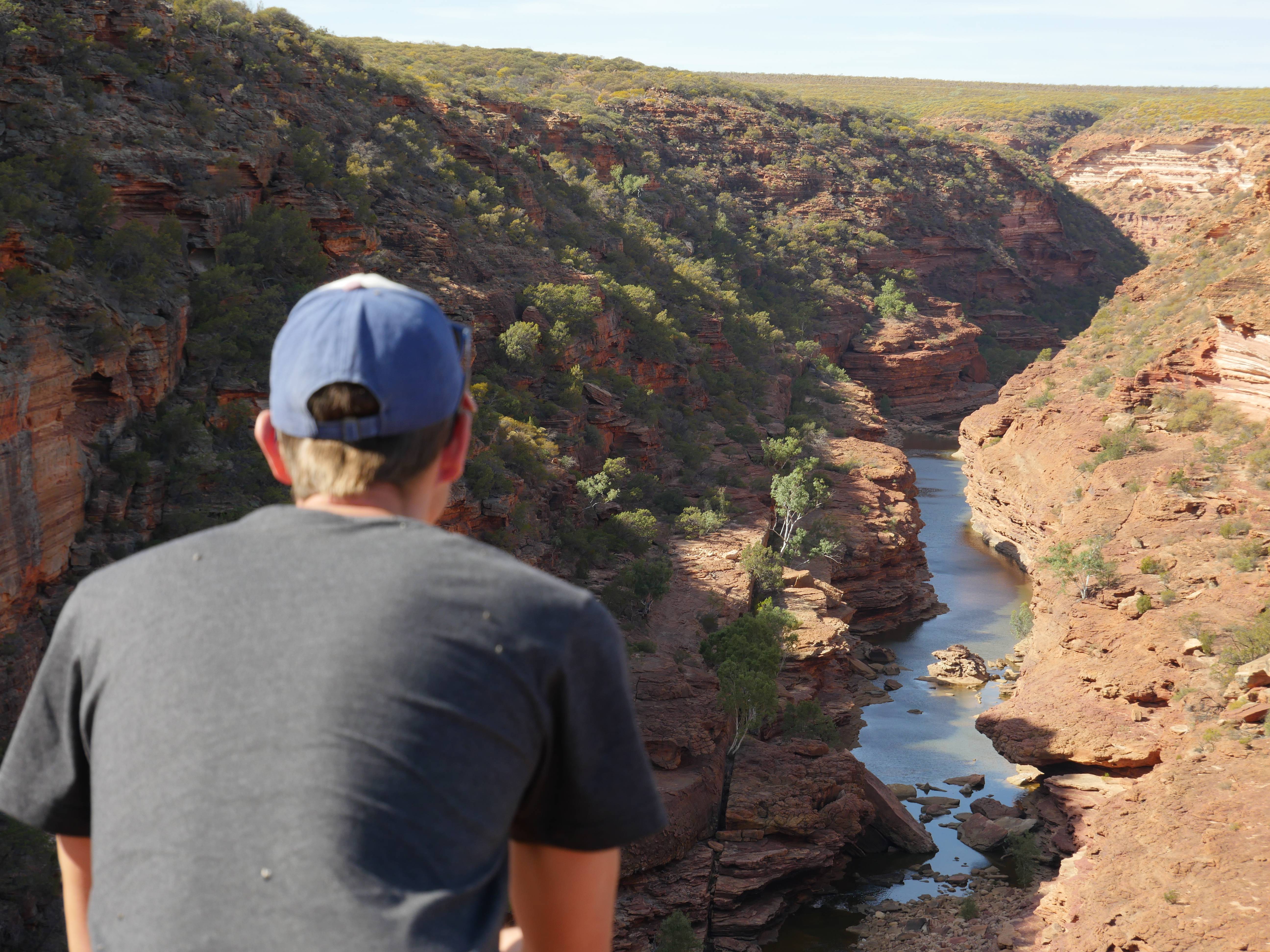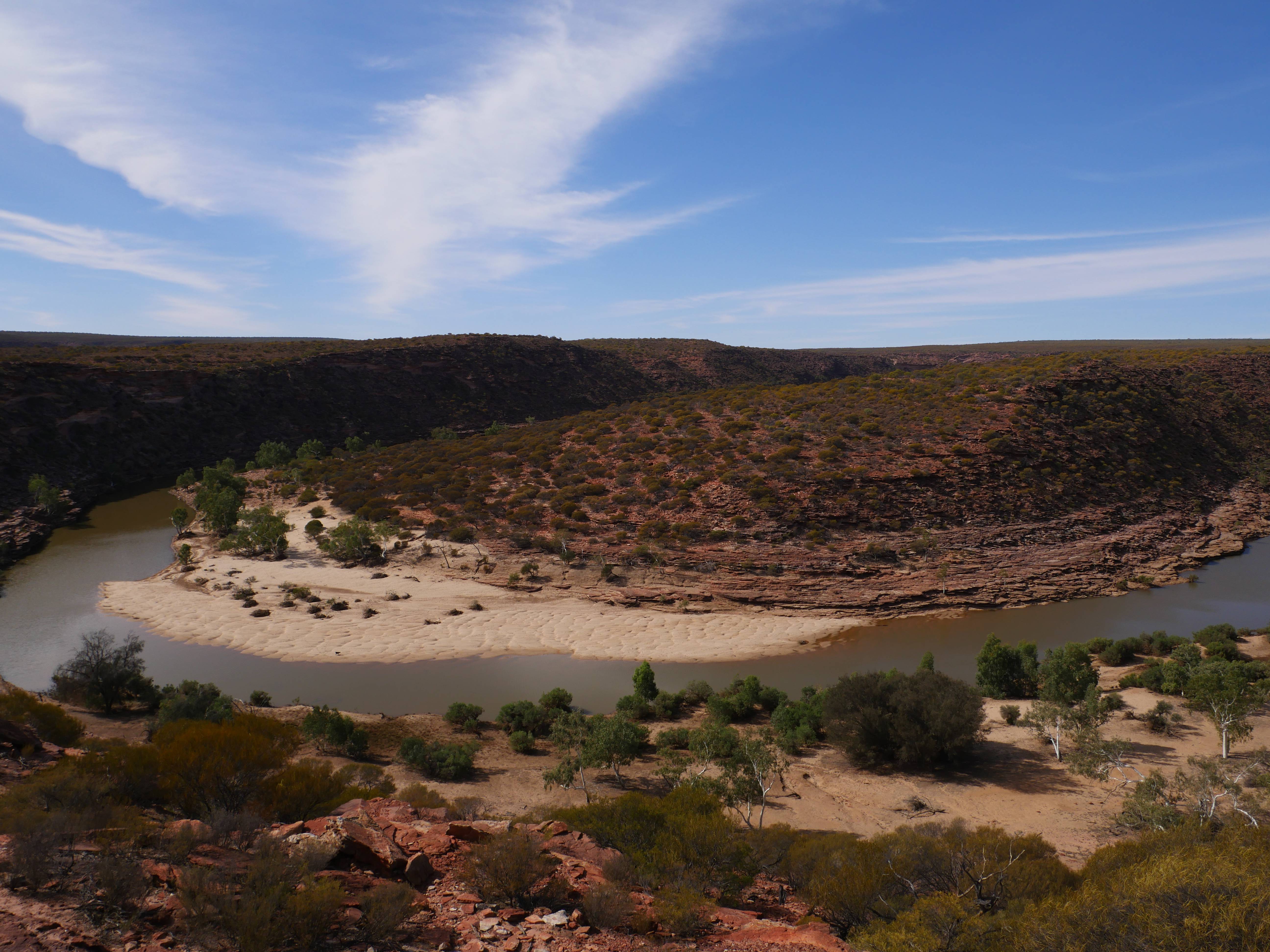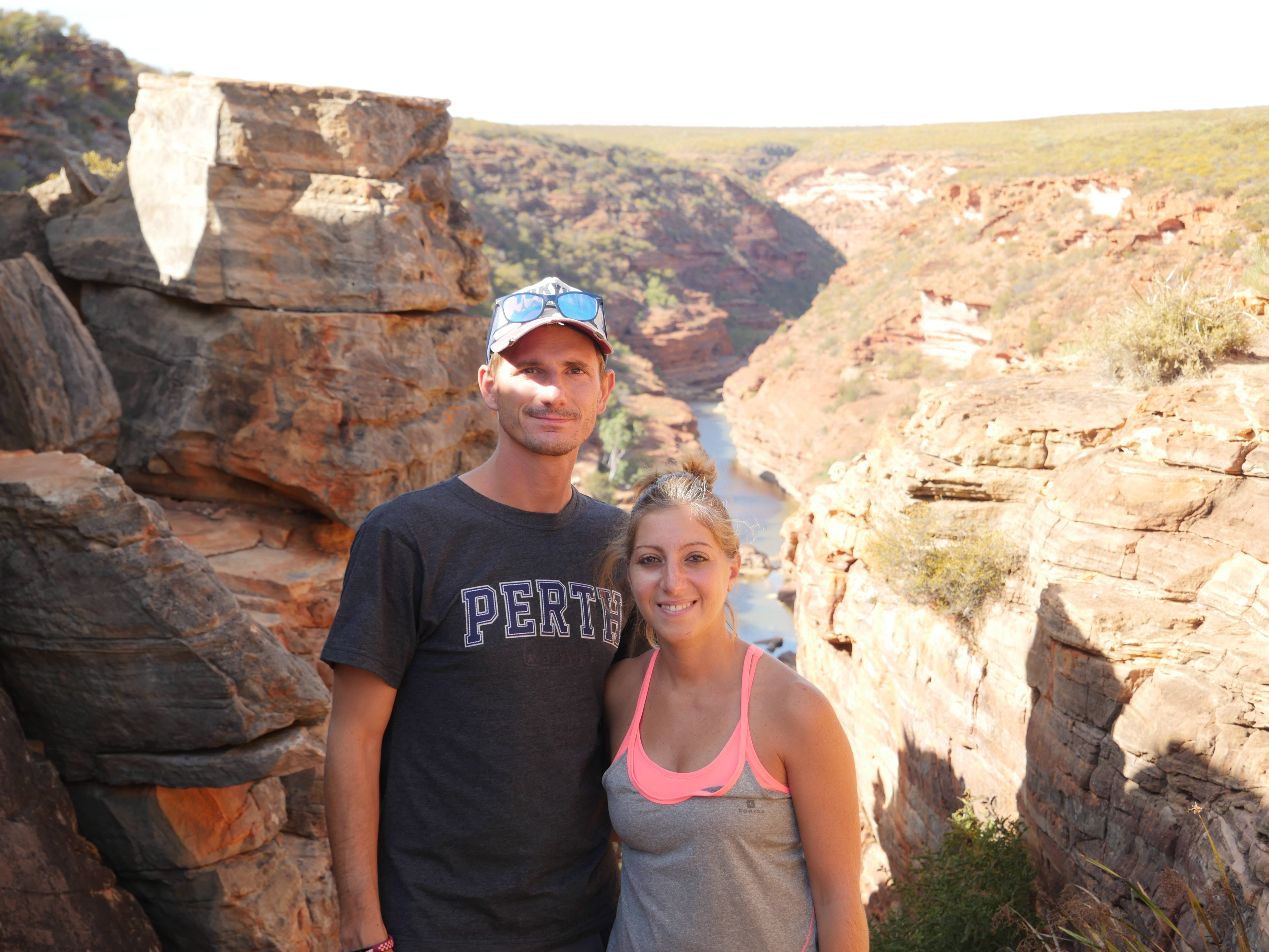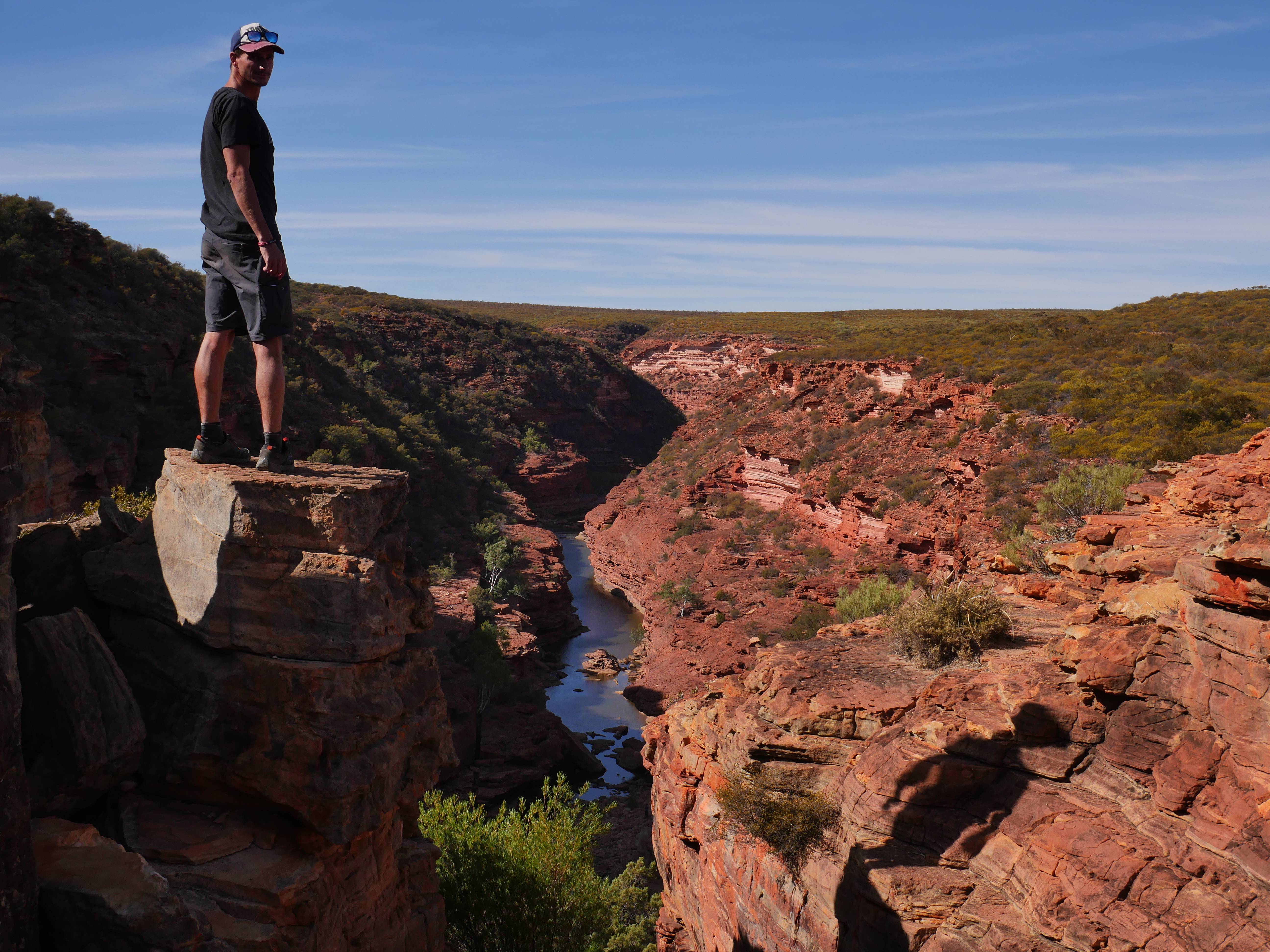 Après la visite de la côte de la veille, on va aujourd’hui visiter les terres de Kalbarri ! Et finalement, le Z-Bend Lookout est ouvert, cool ça sera notre premier arrêt. Et quel arrêt ! On avait jamais vu ça ! Un canyon en forme de U devant nous avec des couleurs rougeâtre. OUCH !