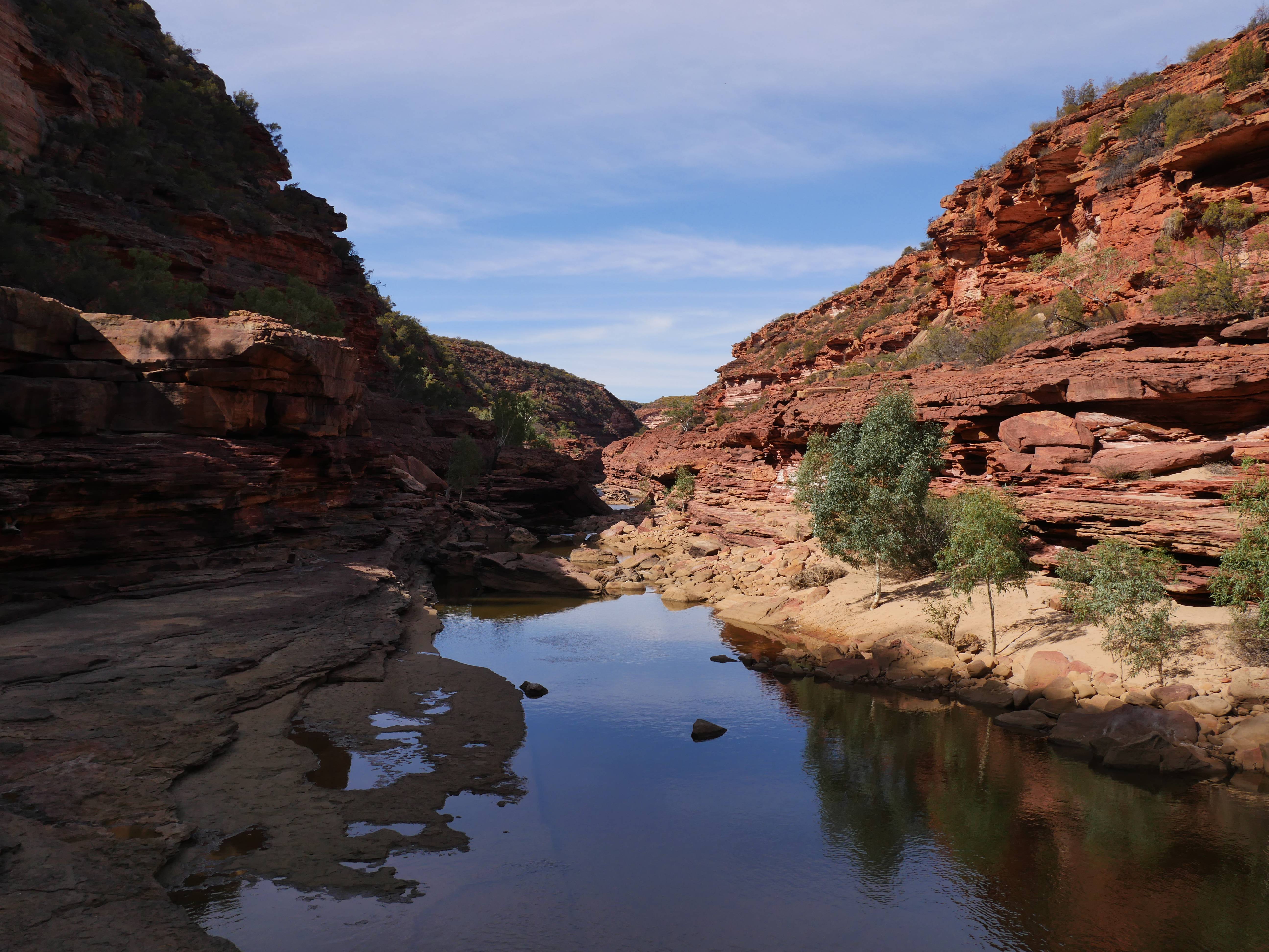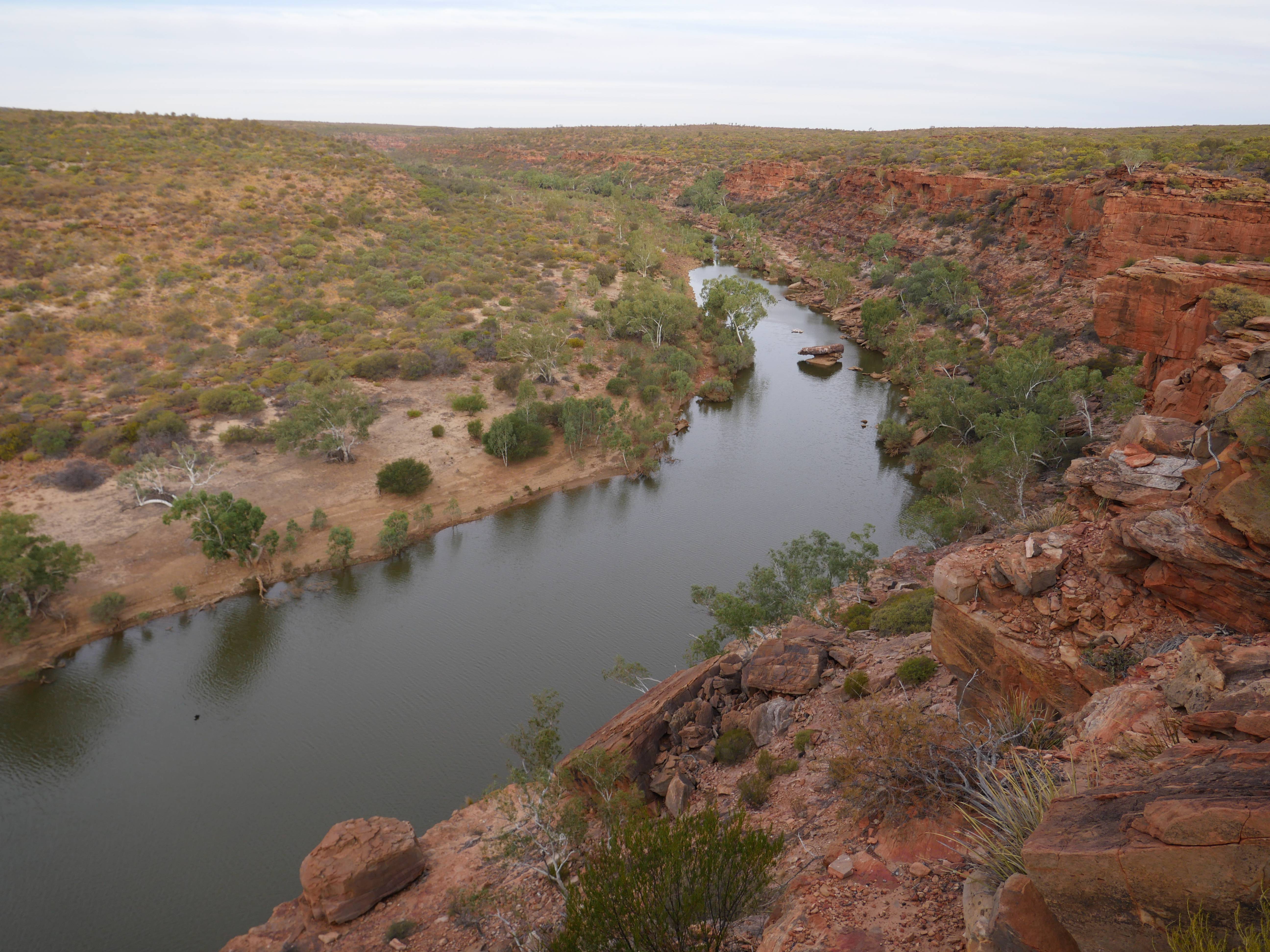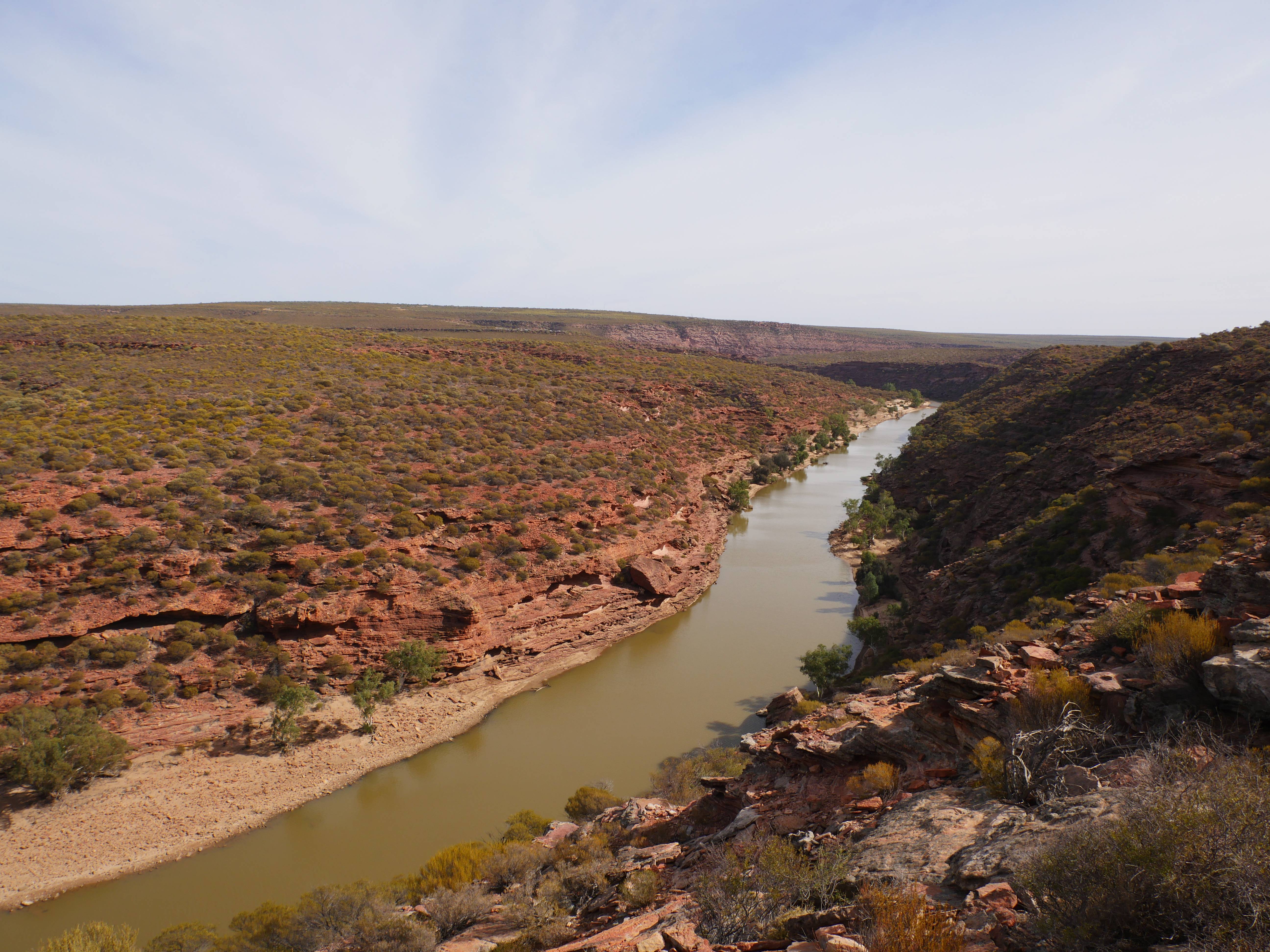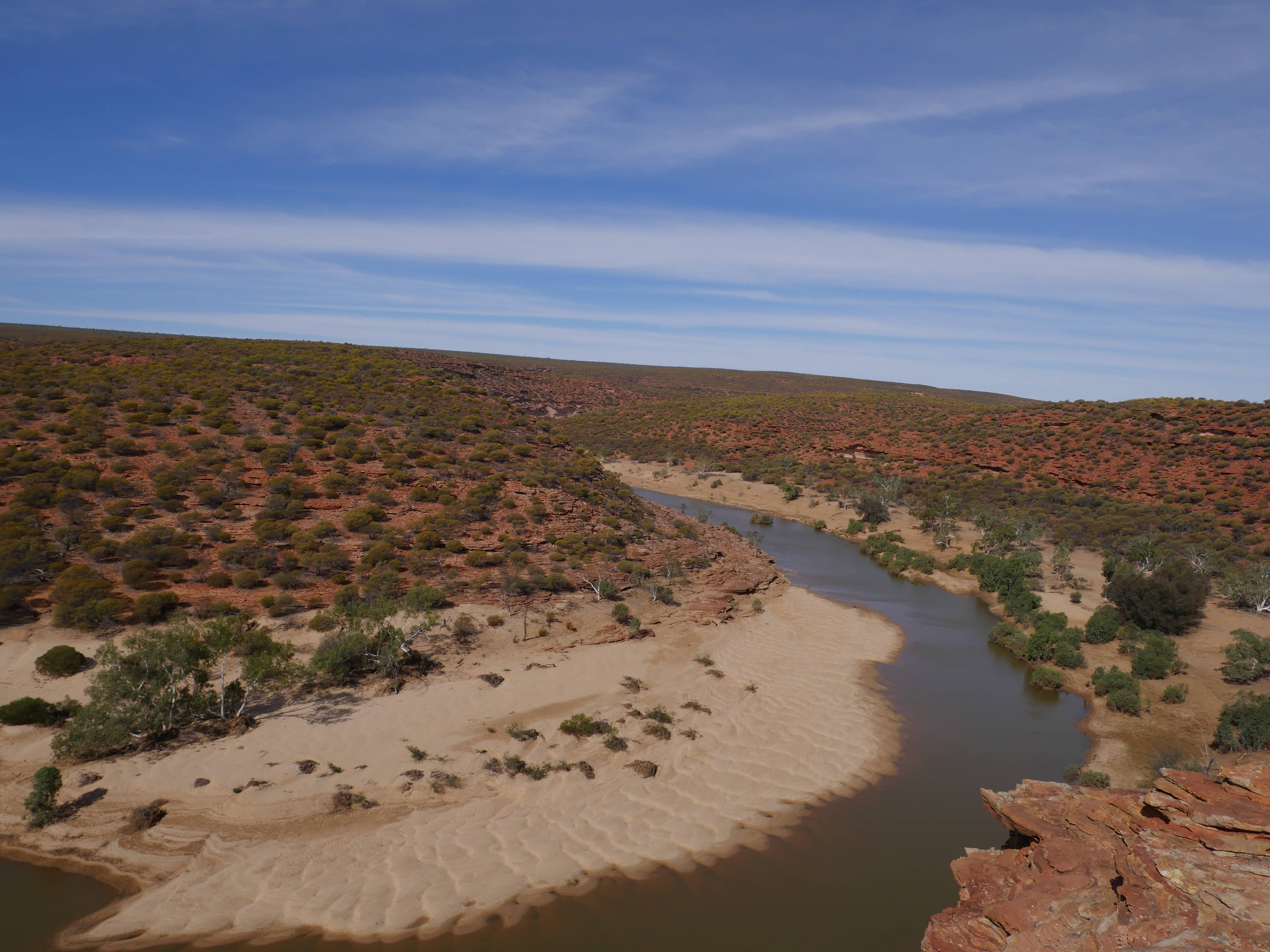 Après la visite de la côte de la veille, on va aujourd’hui visiter les terres de Kalbarri ! Et finalement, le Z-Bend Lookout est ouvert, cool ça sera notre premier arrêt. Et quel arrêt ! On avait jamais vu ça ! Un canyon en forme de U devant nous avec des couleurs rougeâtre. OUCH !
