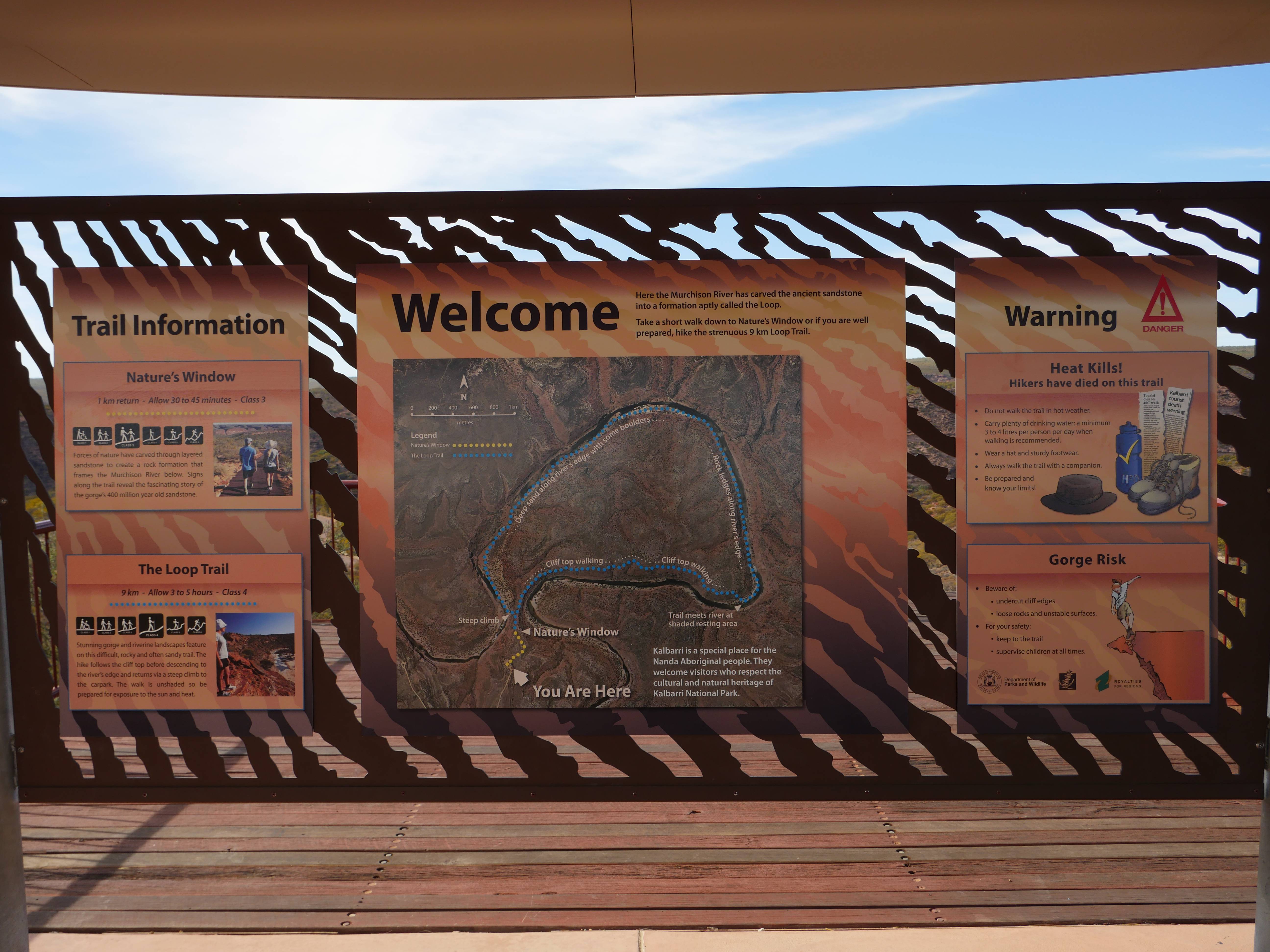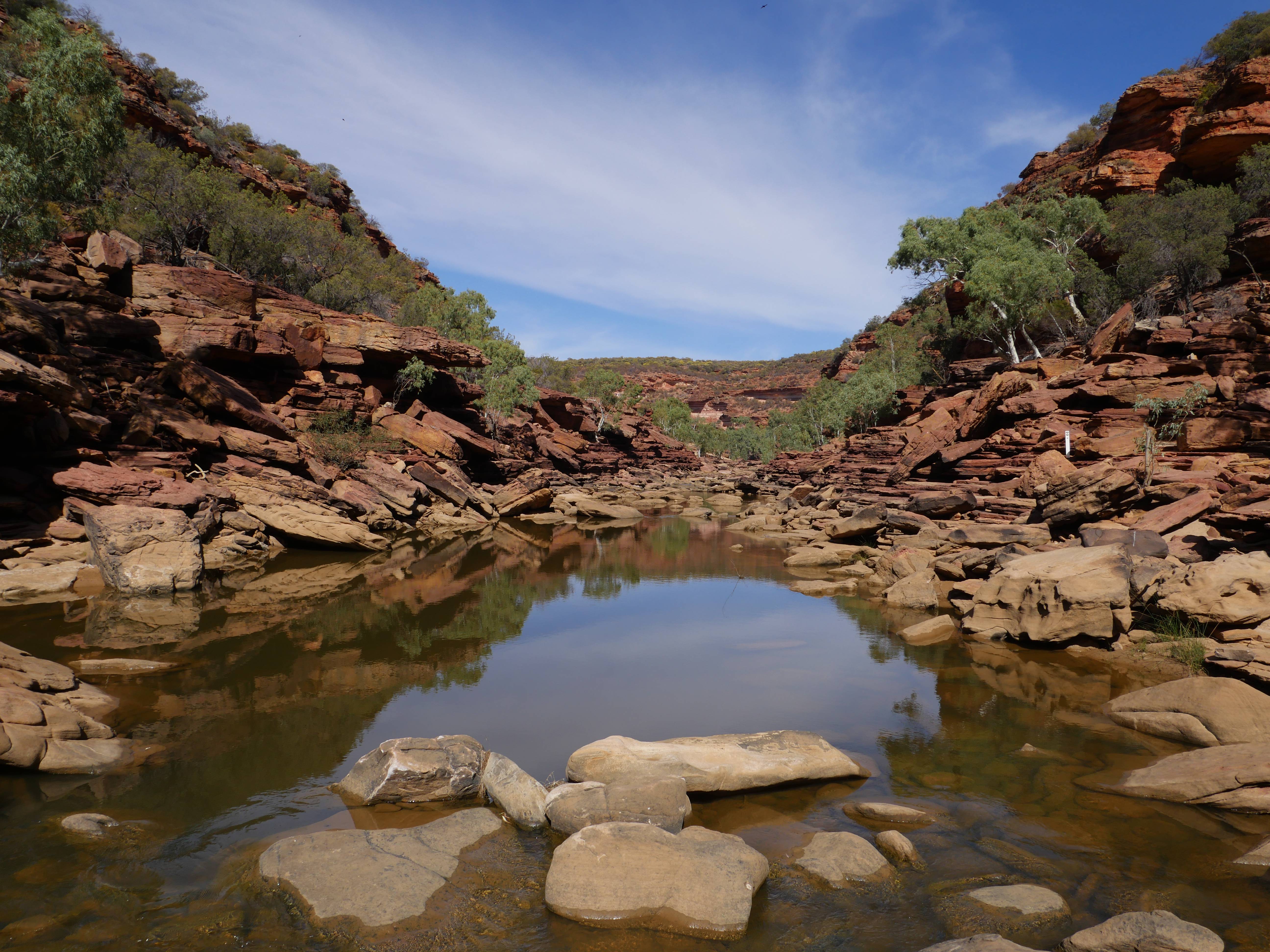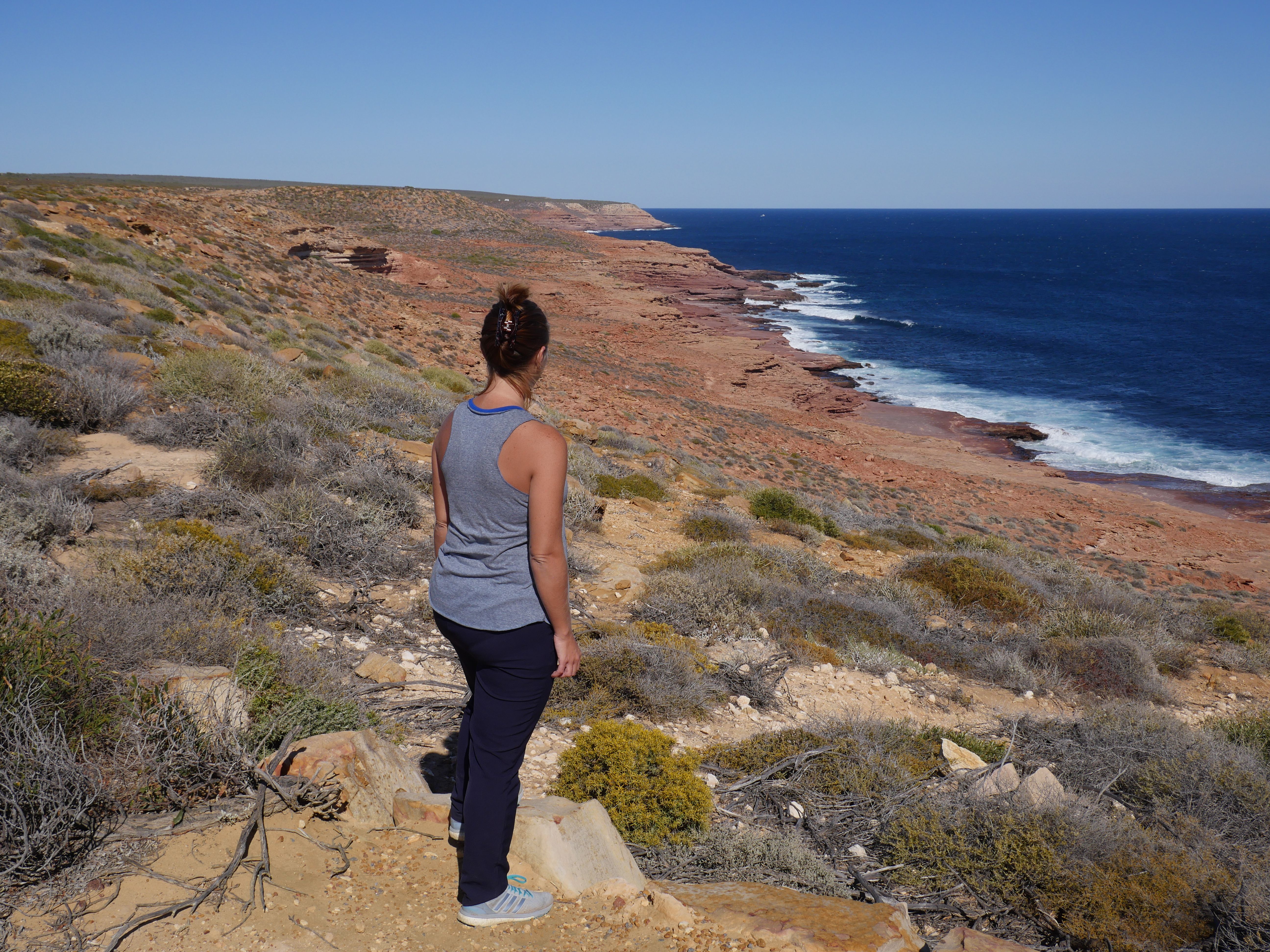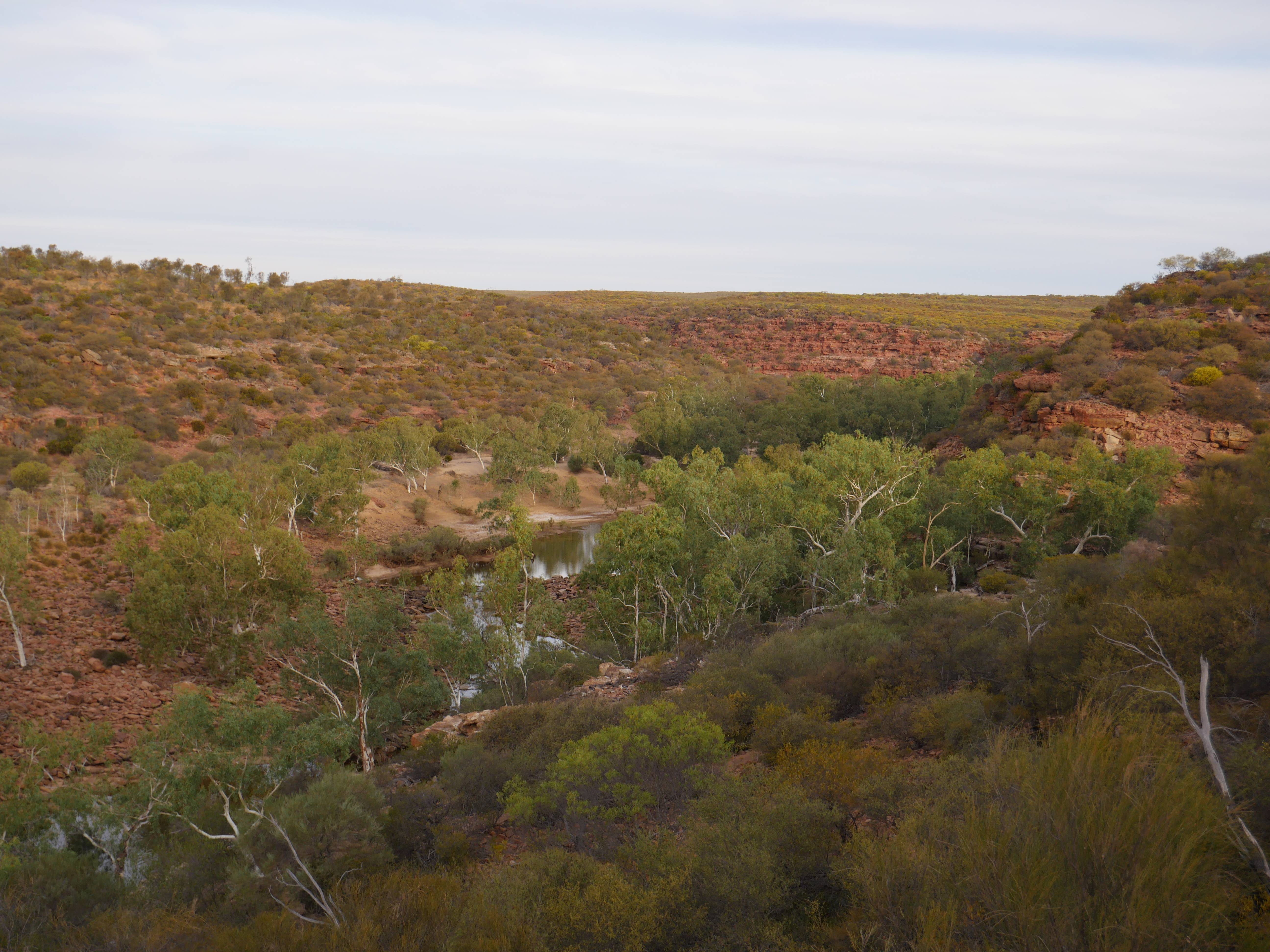 Après la visite de la côte de la veille, on va aujourd’hui visiter les terres de Kalbarri ! Et finalement, le Z-Bend Lookout est ouvert, cool ça sera notre premier arrêt. Et quel arrêt ! On avait jamais vu ça ! Un canyon en forme de U devant nous avec des couleurs rougeâtre. OUCH !