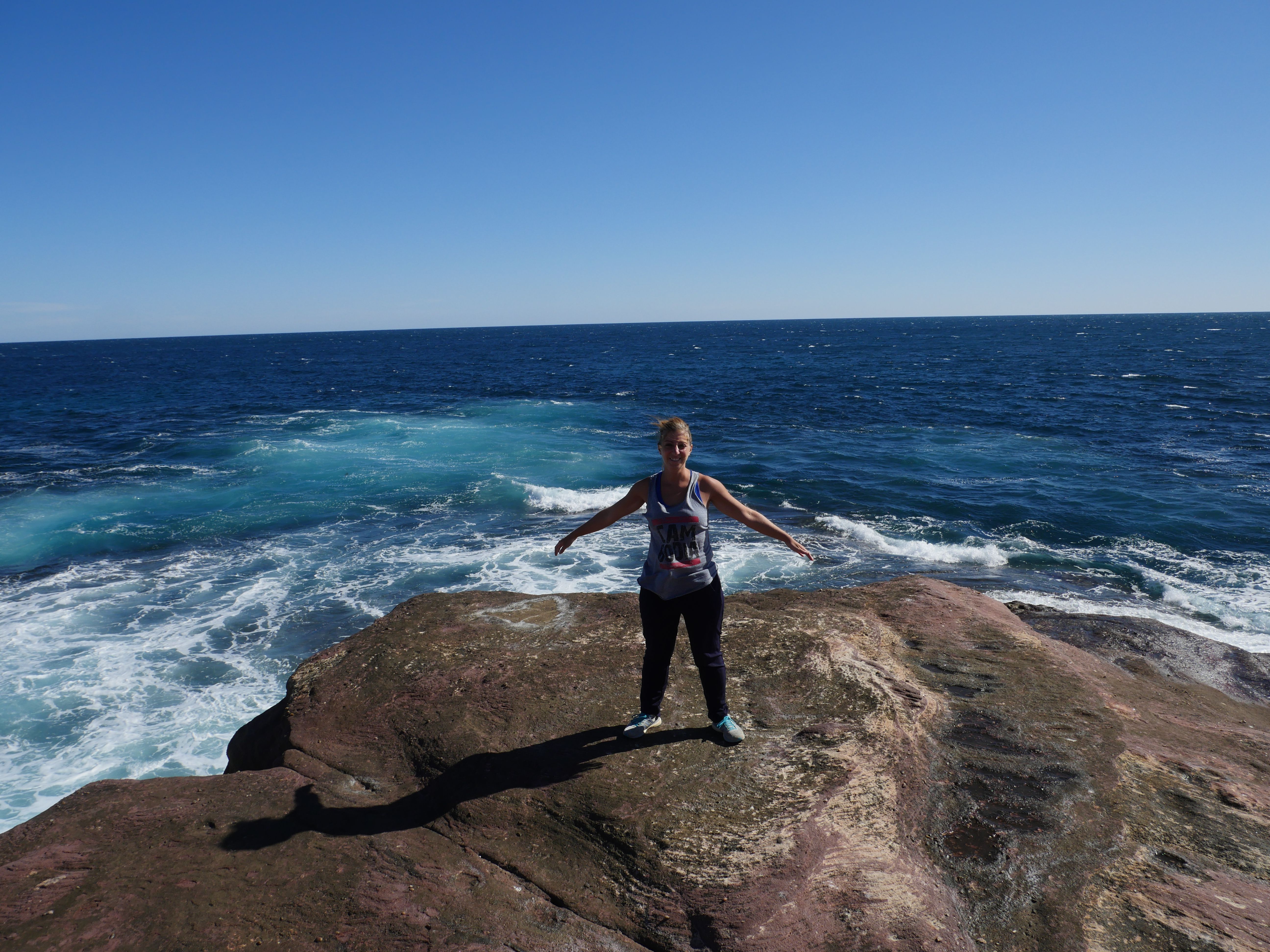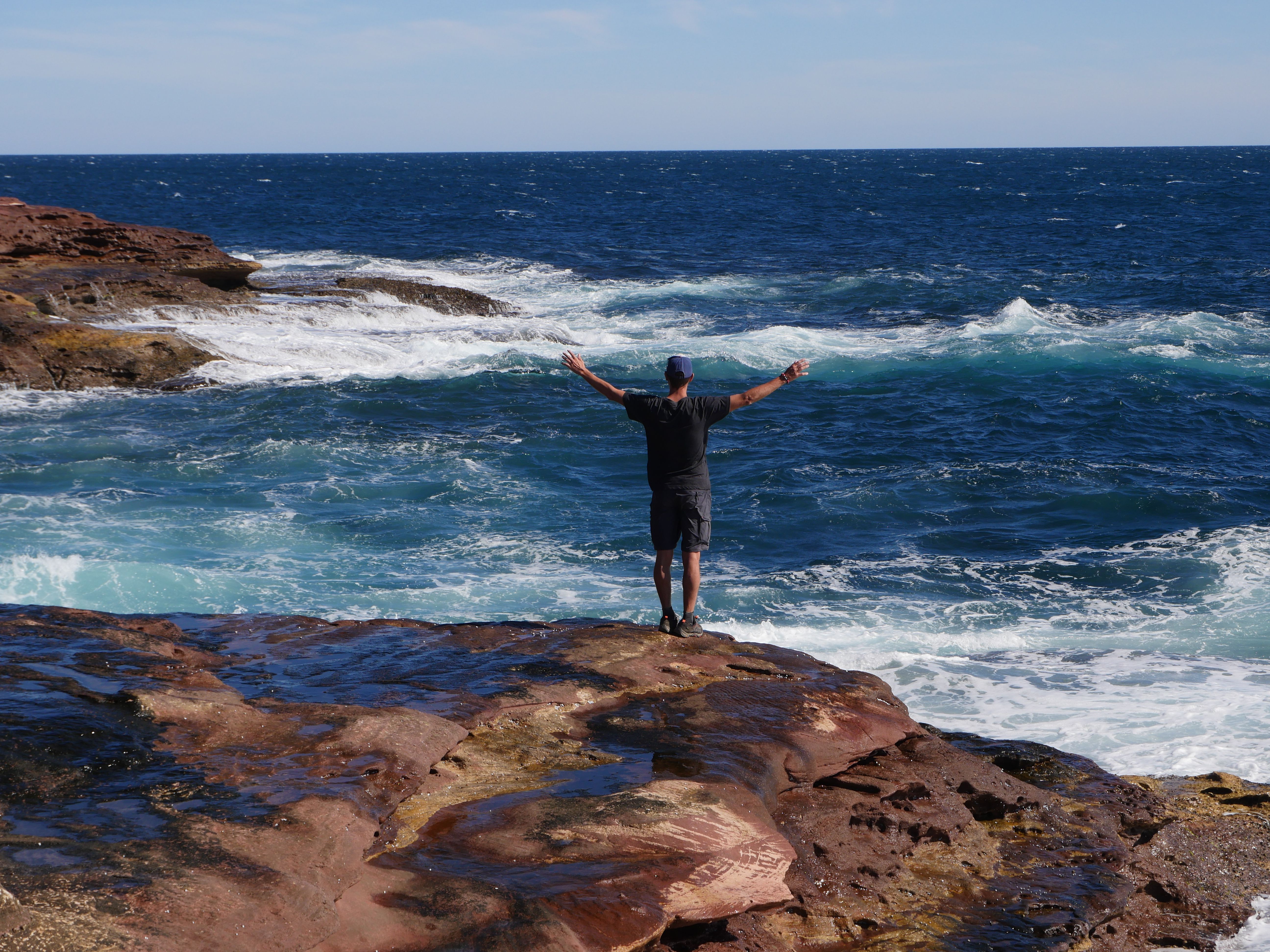 Alors autant le dire tout de suite : G.R.A.N.D.I.O.S.E ! Les falaises en mode escalier, la terre rouge, la mer bleue foncée et agitée avec des vagues et le ciel clair. Tout est absolument parfait ! Ria a même commencé à trouver une vocation : les coquillages 🙂