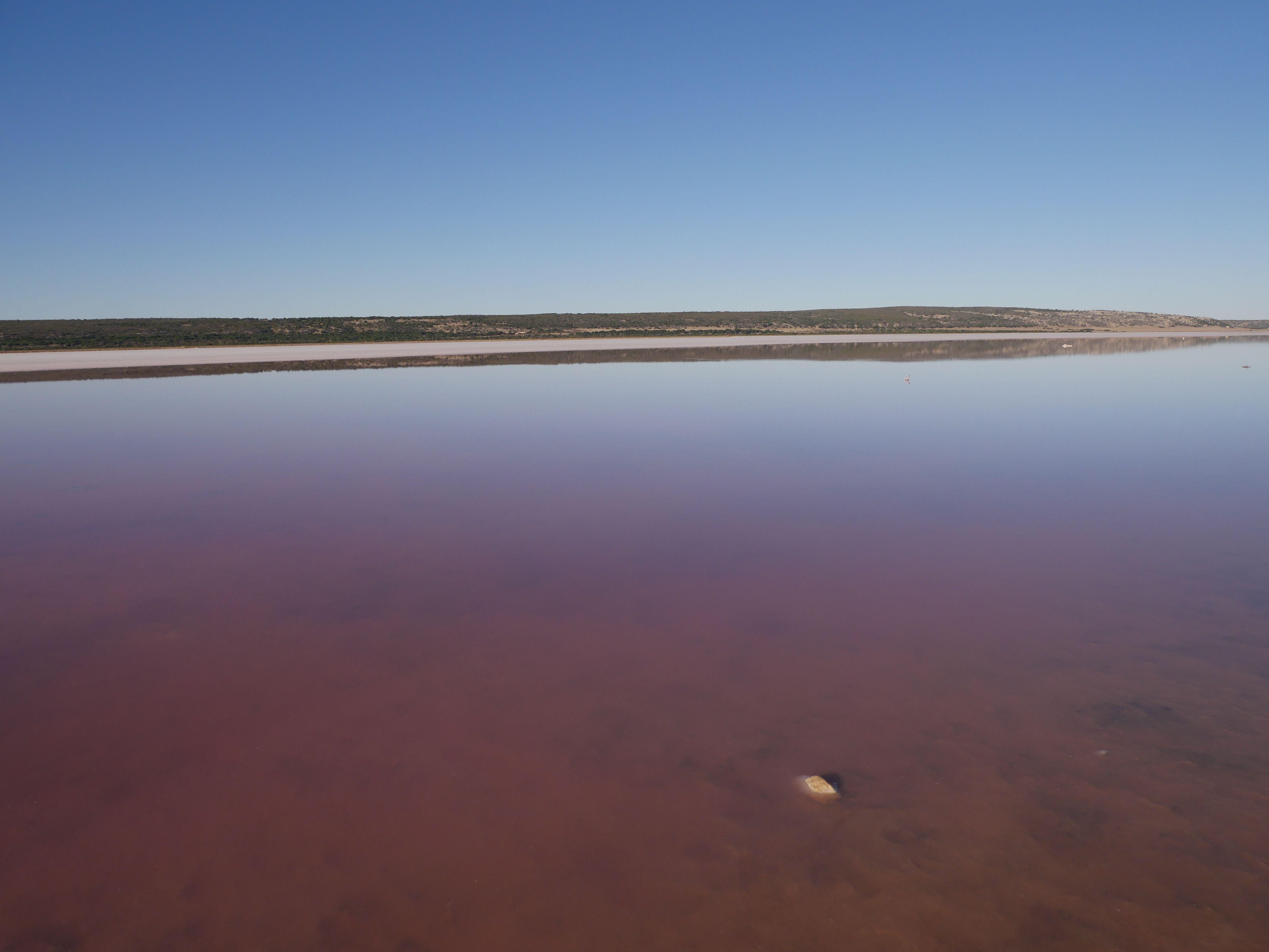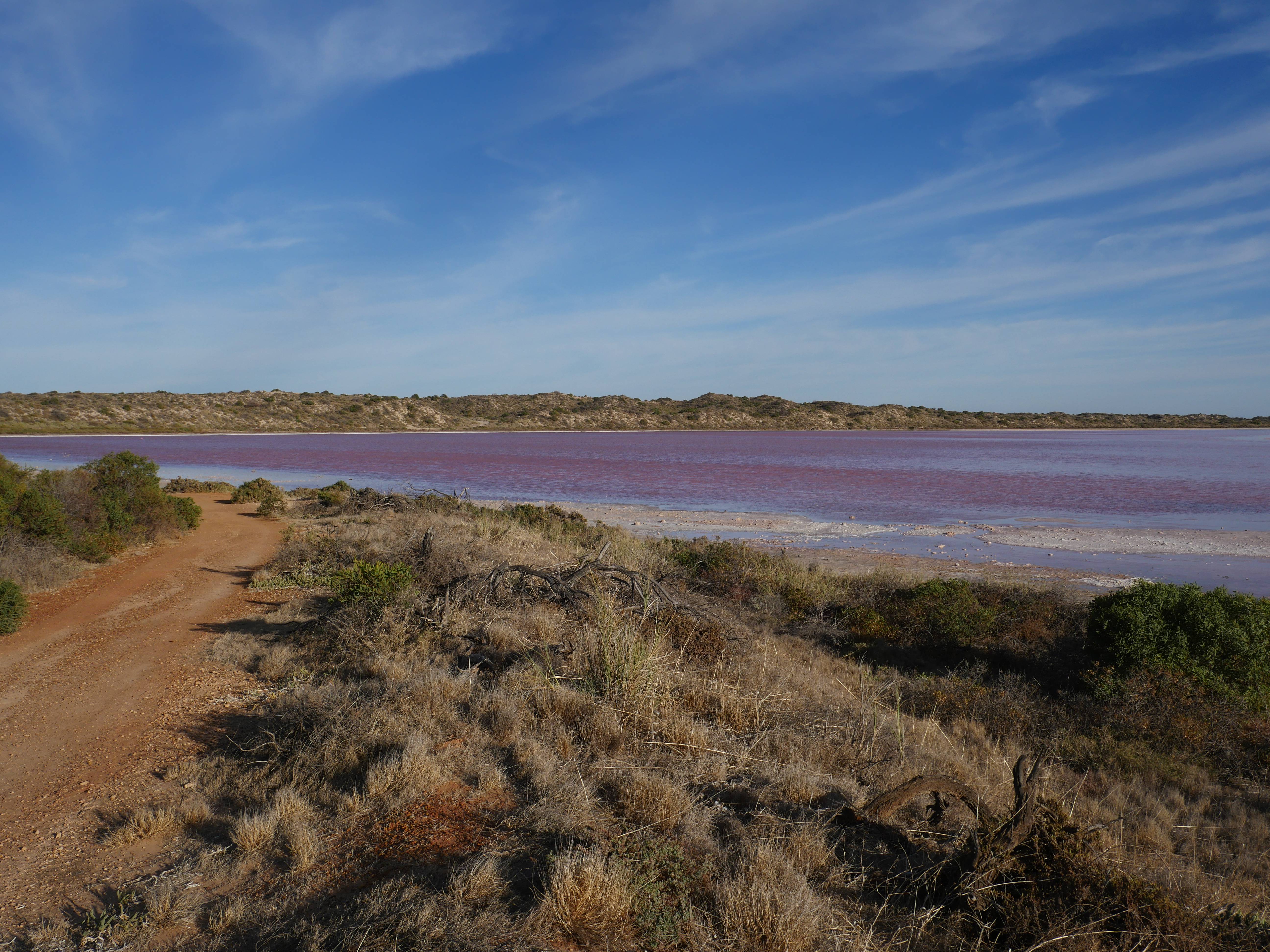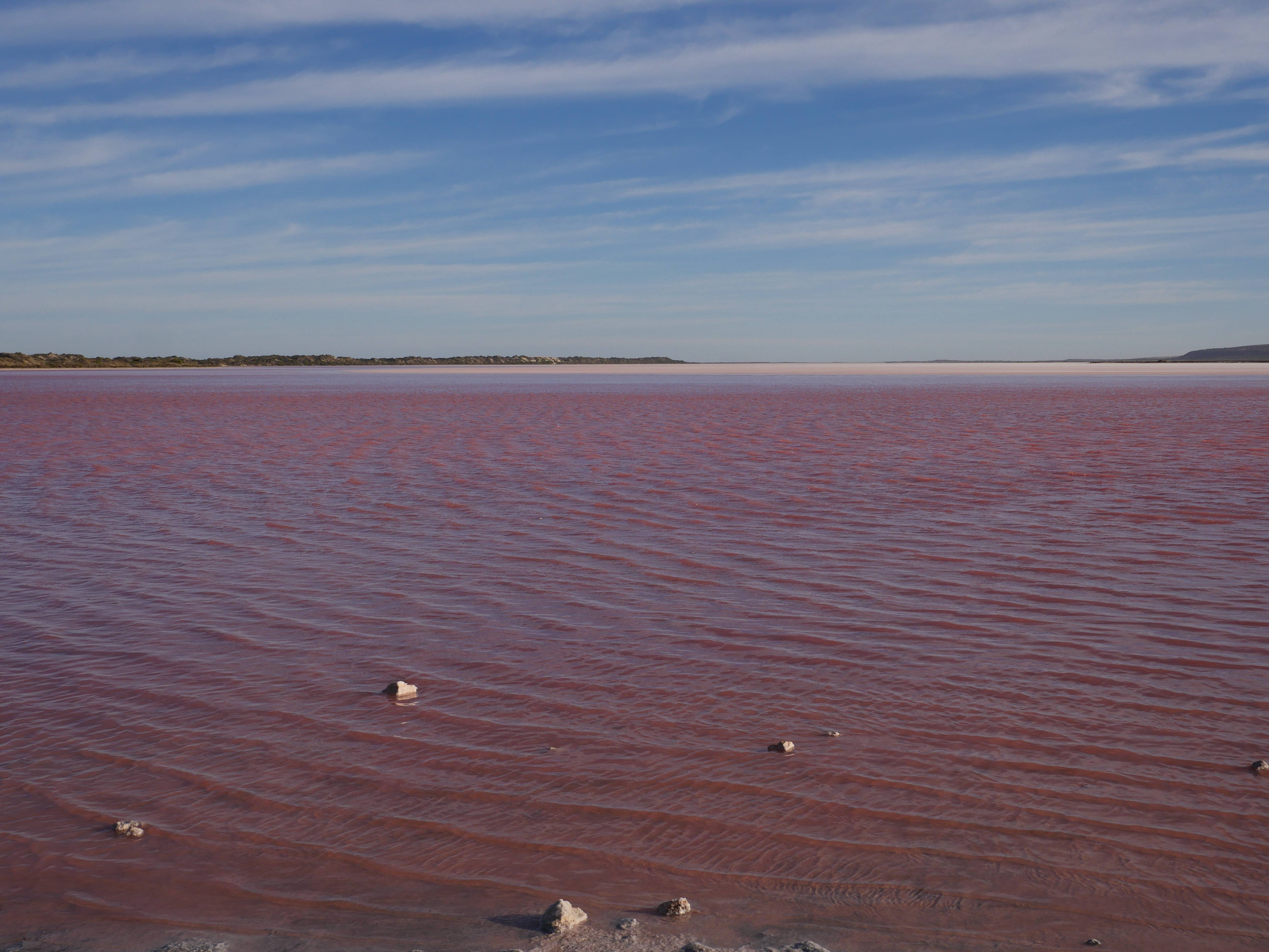Avant de retourner à Kalbarri, on est retourné au Pink Lake. Et là, on doit dire que c’est incroyable ! La lac entièrement rose ! La veille, avec la lumière du couché du soleil, on ne distinguait pas bien mais là c’est flagrant ! Le rose provient d’une algue microscopique, Dunaliella Salina, qui au contact de l’eau salée, produit des » β-carotène », un peu comme la carotte. Du coup, en fonction de la température, des précipitations, du soleil,… la couleur de l’eau est plus ou moins rose.
