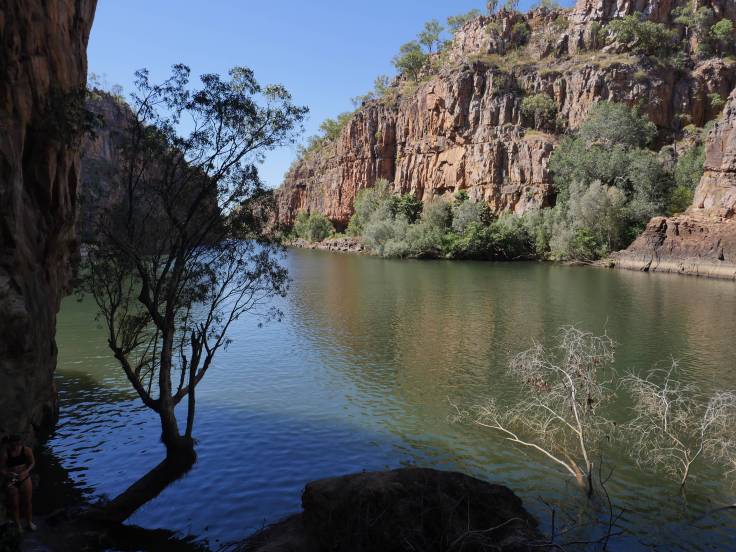 Au bout de 2h éreintantes, on atteint enfin notre oasis : Butterfly Gorge. C’est beau, voire très beau. Il faut nager un peu dans la gorge pour que ce soit vraiment chouette. Mais on ne se baigne pas l’esprit libre non plus. En théorie, il n’y a pas de crocodile ici… On n’est tout de même pas à l’abri qu’un ou deux se soient perdus…