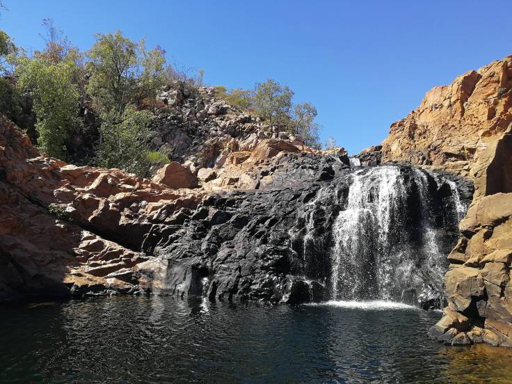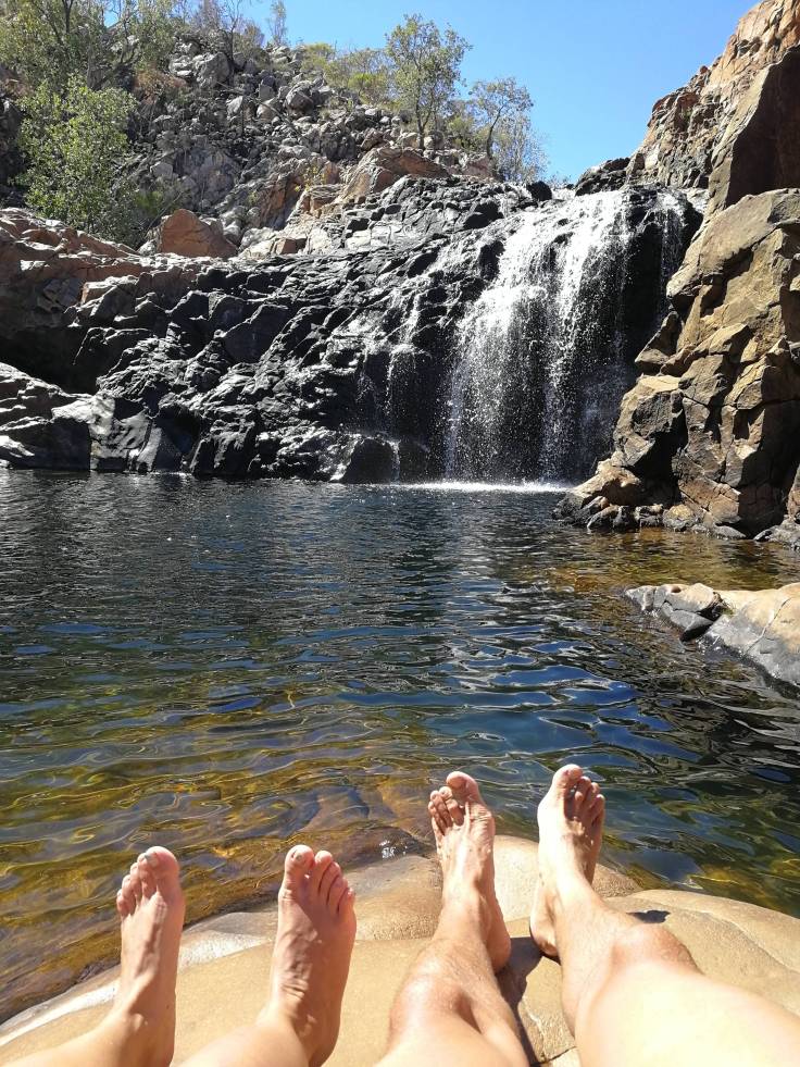 Et la cascade est super méga génial !!! Vraiment l’une des plus belles. On a bien dû y rester 2h ou 3h, à se prélasser au soleil avec en bruit de fond la chute d’eau, en alternant bronzette et plouf. Cela ne nous était pas arrivé depuis Bell Gorge sur la Gibb River Road.