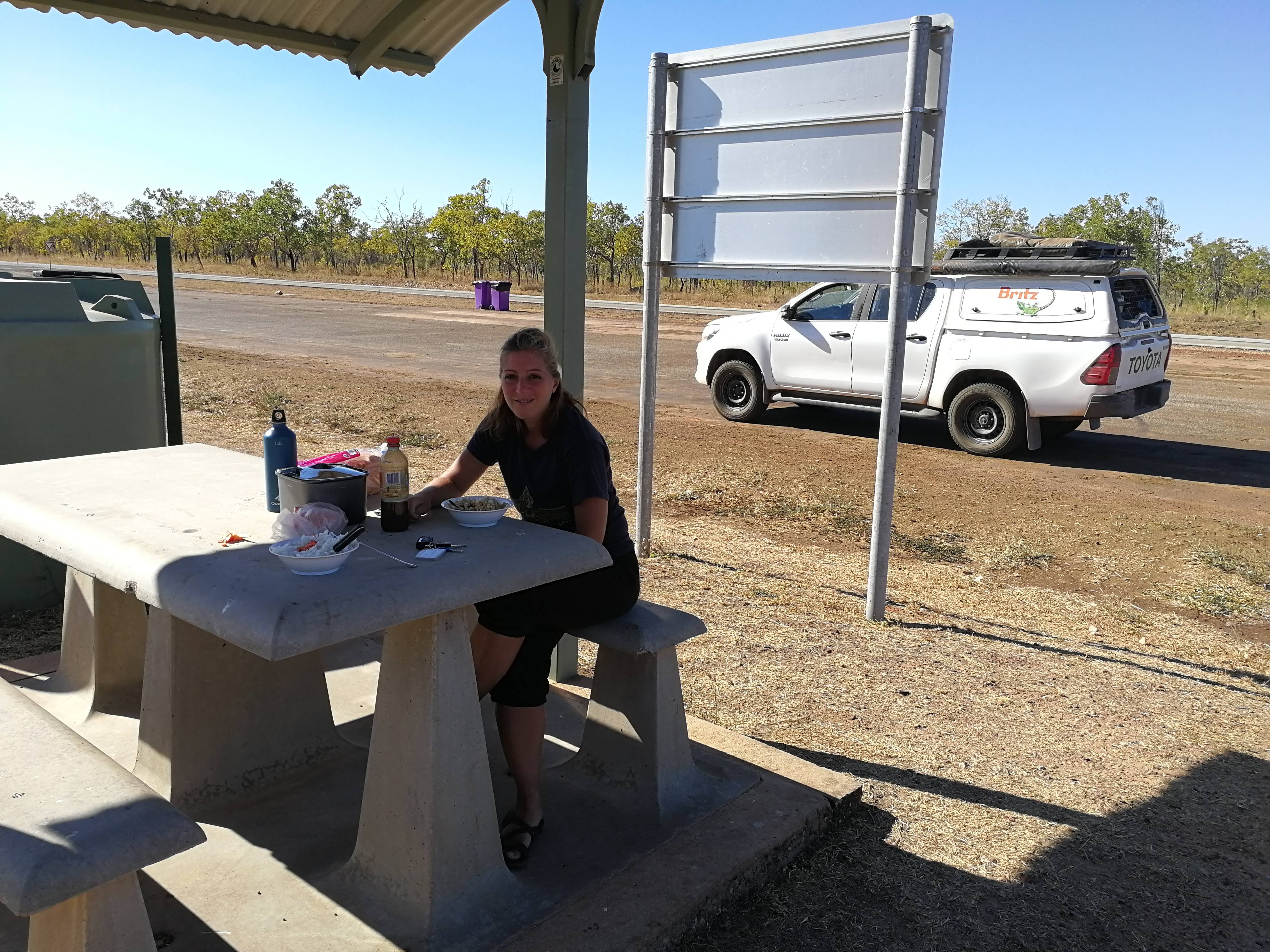 Ah, enfin une nuit reposante !!! Cela fait tellement du bien ! Par contre ça se sent qu’on est dans le nord : il fait chaud la nuit ! Fini les vêtements thermiques ! Un petit déjeuner de champion, une cuisson de riz pour le soir, et on part vers Edith Falls.