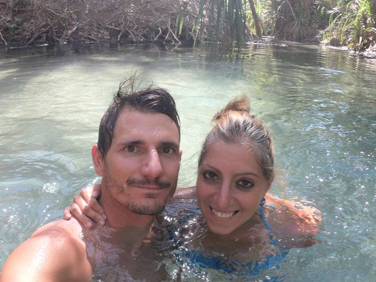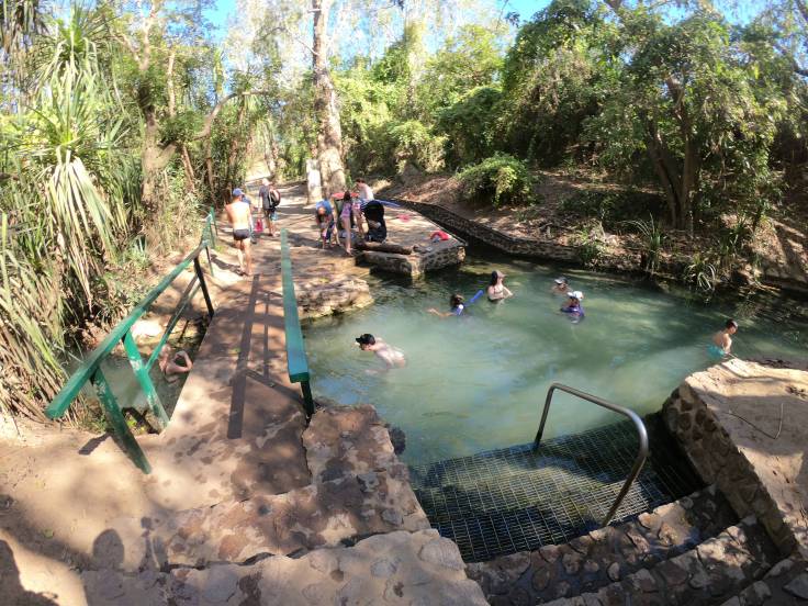2h plus tard, on se rend aux « hot springs« . C’était vraiment pas mal du tout ! Complètement différent de celle d’El Questro. On se baigne dans un petit ruisseau où il y a des mini cascades, entourées d’arbres.