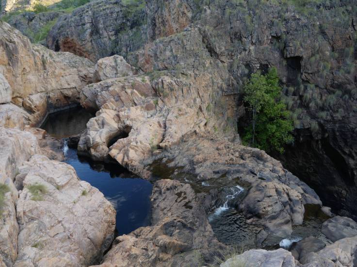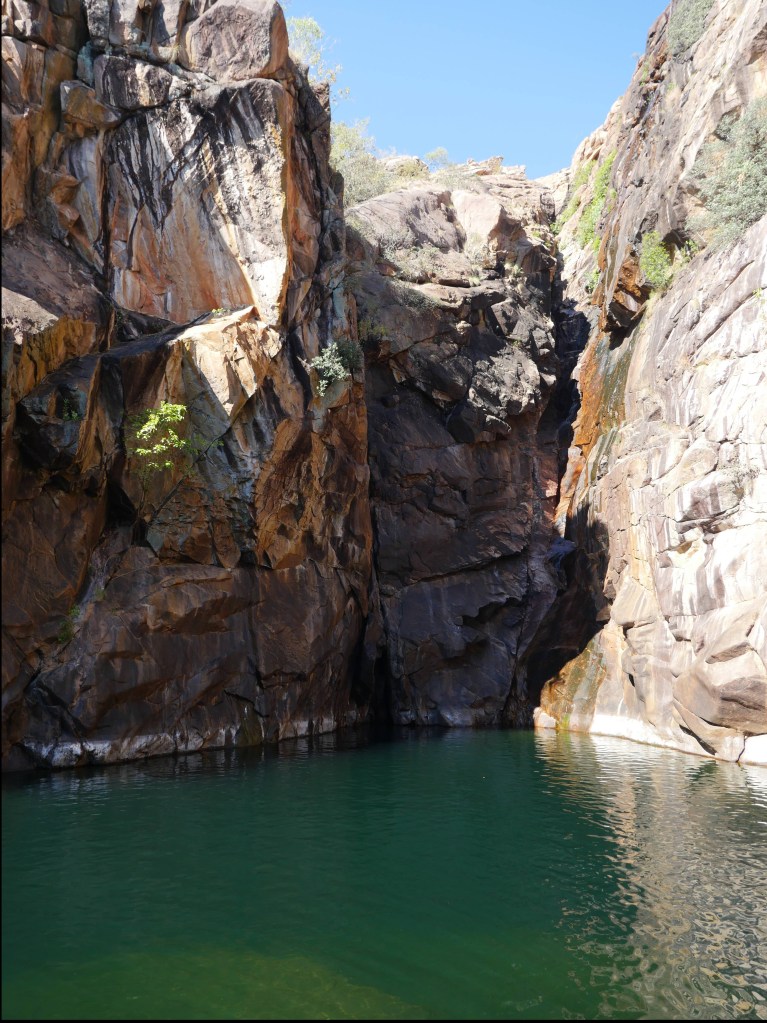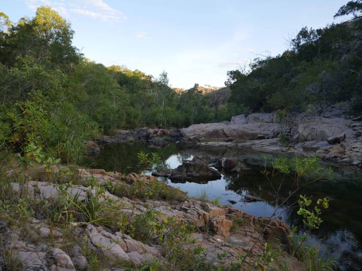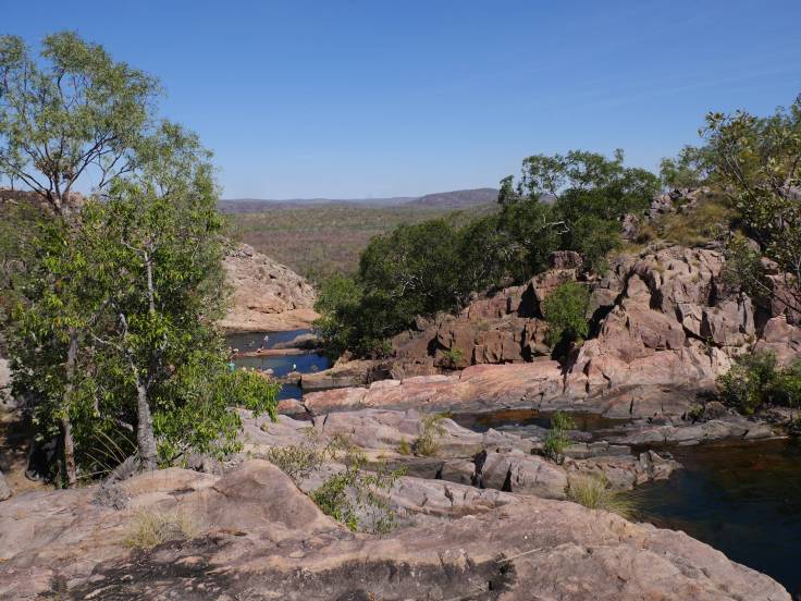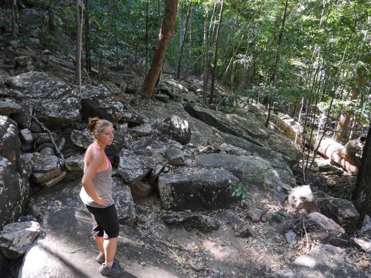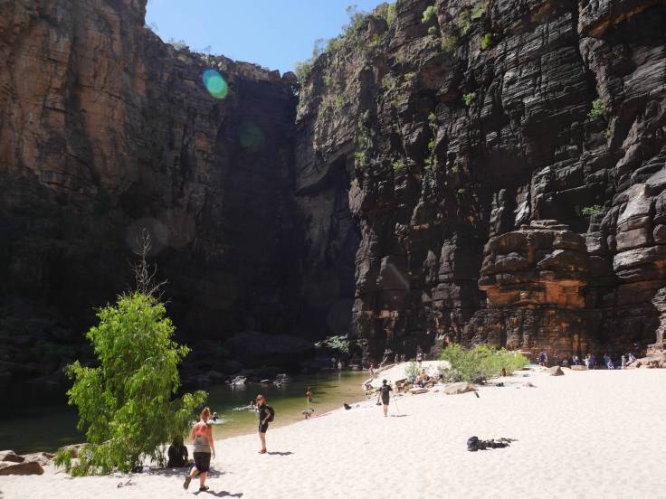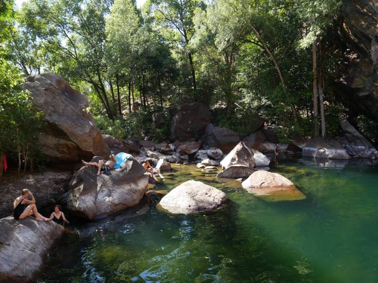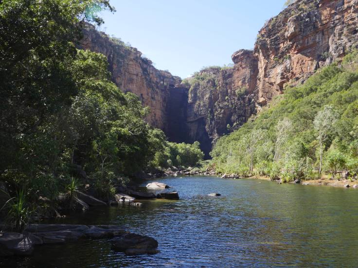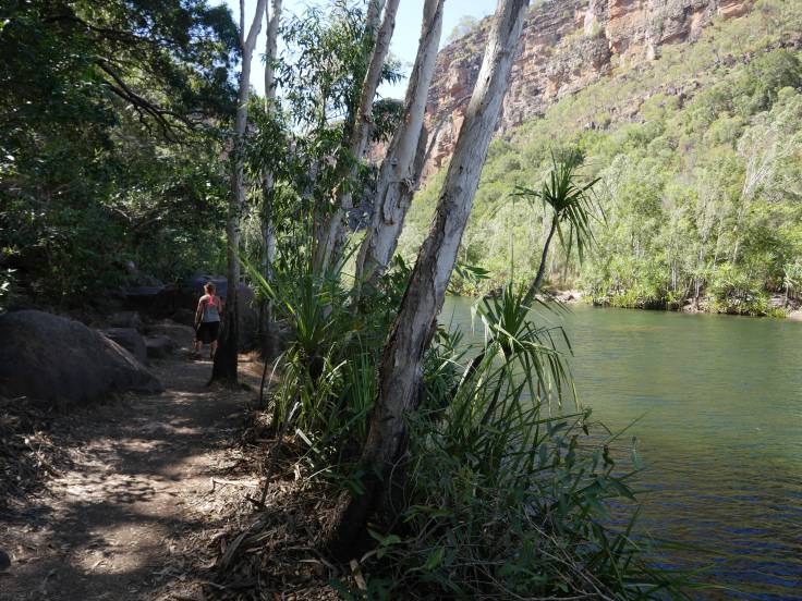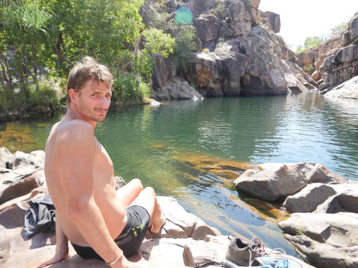 Maintenant Jim Jim Falls… La balade est plutôt sympa à travers la forêt et les rochers. Malheureusement, pas de chute d’eau. Pas de chance… Dommage, car l’endroit aurait vraiment pu être paradisiaque, avec la belle plage, le soleil et l’eau claire.